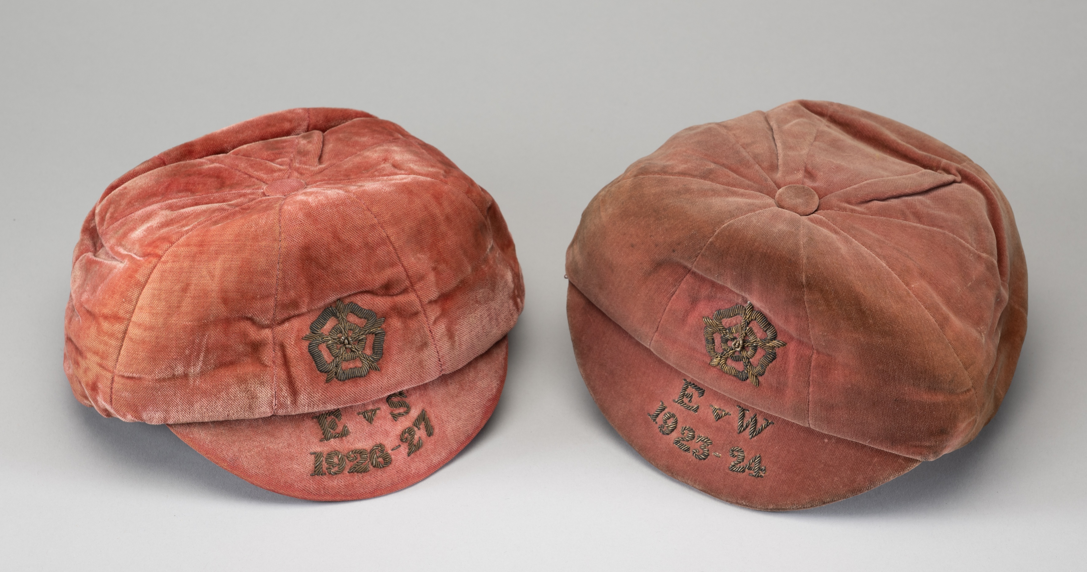 Two 1920s England amateur international caps awarded to Frank Twine of Middlesbrough FC, rose coloured, the first for the match v Wales in 1923-24, t