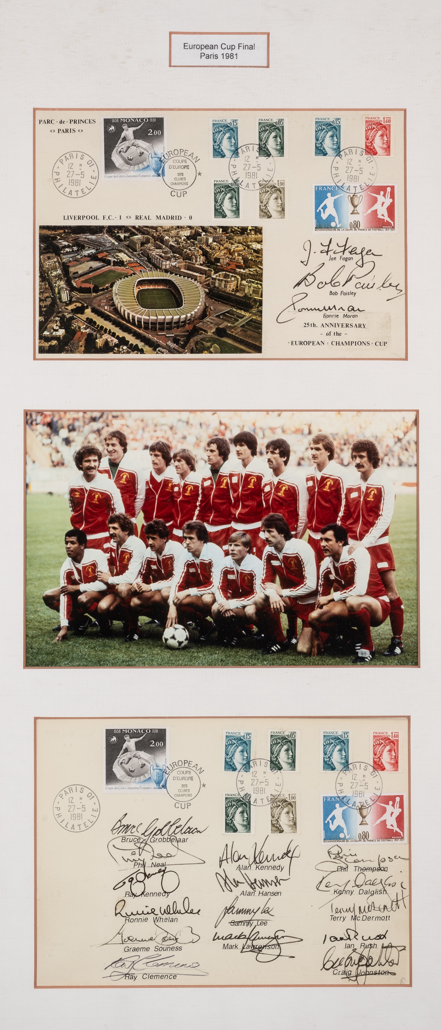 Liverpool European Cup Final Paris 1981 photograph with two signed FDC's display, central colour team photograph, with two signed FDC's above and below, the first three signatures of Joe Fagan, Bob Paisley and Ronnie Moran, the second bearing 15 signatures of squad members above printed name, each FDC bearing postal stamps and stamped, mounted, glazed and framed, overall 67 by 33cm. All glass will be removed from framed and glazed items prior to posting and may result in delays to shipping your items. (This service is included in the cost of postage and packing). We can also totally remove all framing and mounts upon request to reduce shipping costs. Alternatively, lots can be collected in person by prior appointment from NN8 1RT.