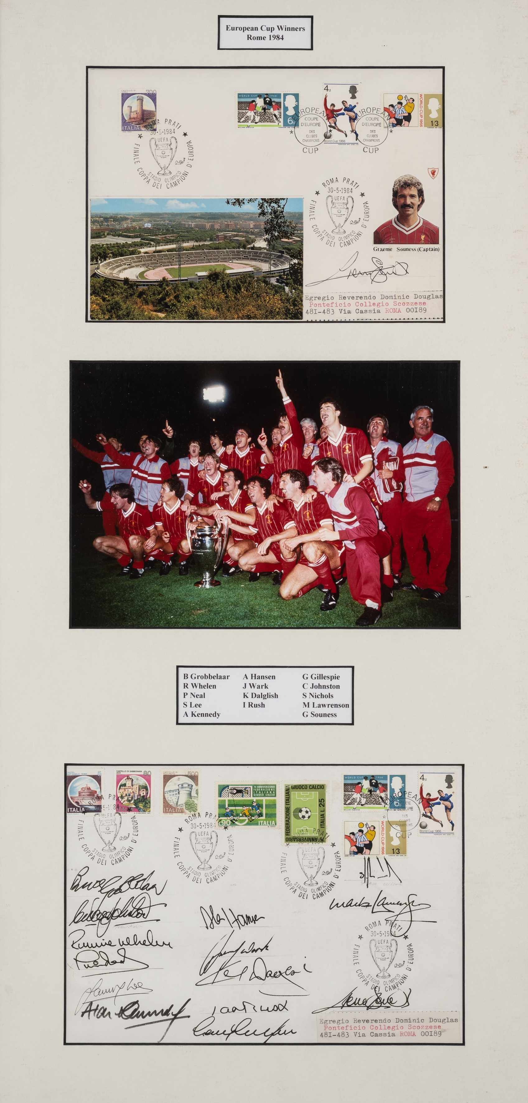 Liverpool European Cup Winners Rome 1984 photograph with two signed FDC's display, central colour team photograph, 16.5 by 24cm. with two signed FDC's above and below, the first signed by Graeme Souness (captain), the second with 14 signatures, each FDC bearing postal stamps and stamped, also bearing applied label Egregio Reverendo Dominic Douglas of Roma, mounted, glazed and framed, overall 73 by 37cm. All glass will be removed from framed and glazed items prior to posting and may result in delays to shipping your items. (This service is included in the cost of postage and packing). We can also totally remove all framing and mounts upon request to reduce shipping costs. Alternatively, lots can be collected in person by prior appointment from NN8 1RT.