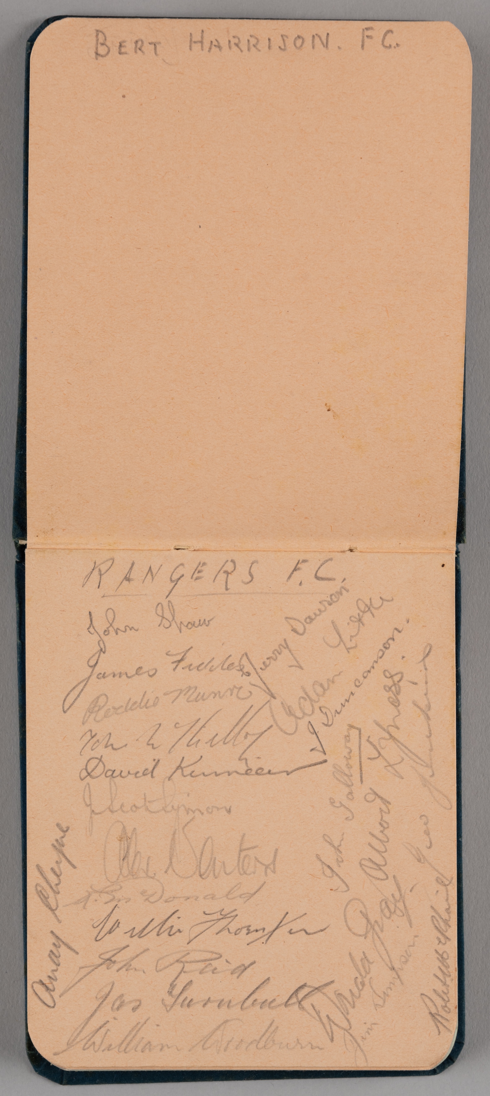 An autograph album bearing twenty-two Rangers player autographs, 1930s, including Jerry Dawson, Willie Thornton, Willie Woodburn, John Reid, Jimmy D