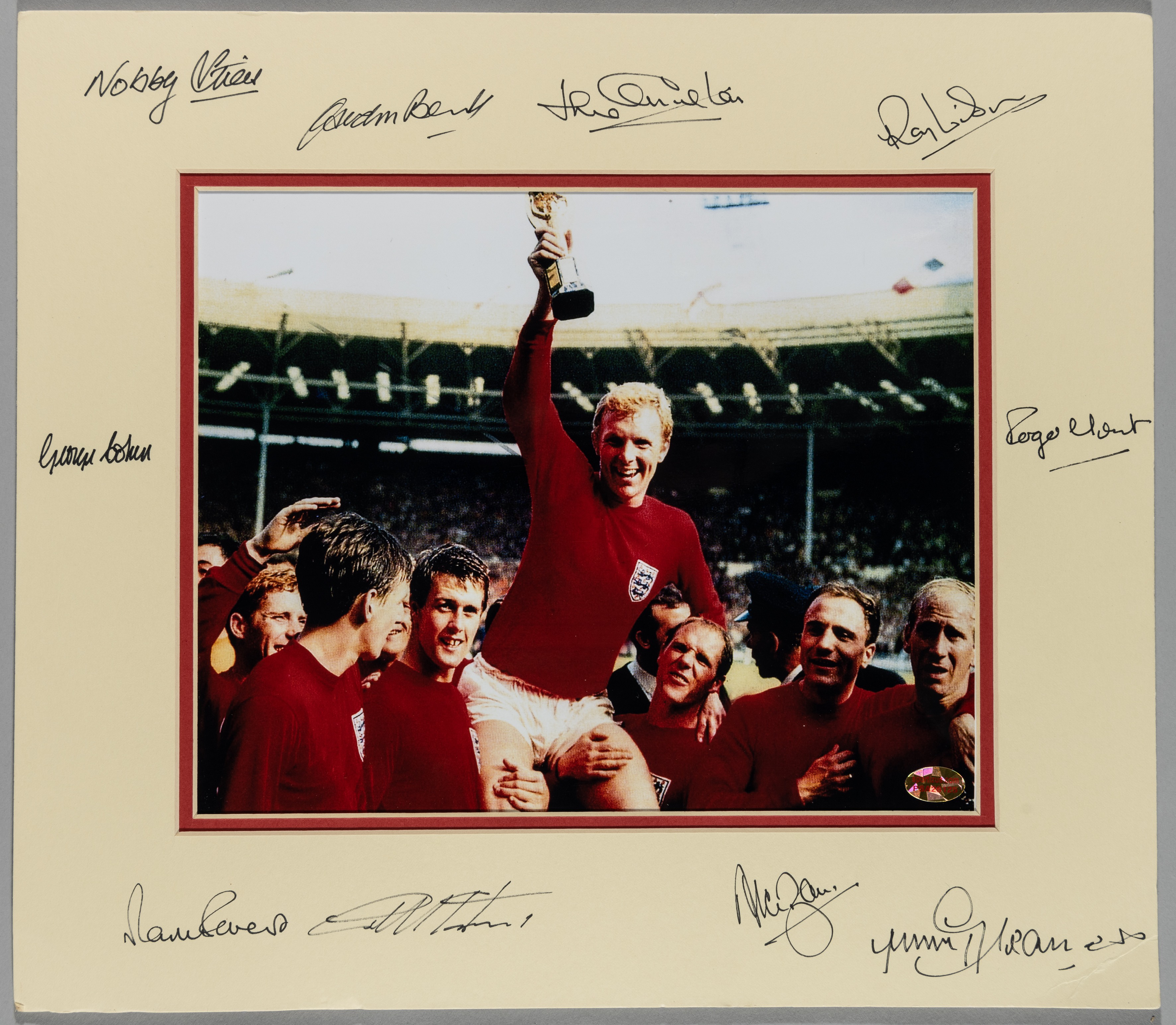England World Cup-Winners colour photograph of the England 1966 World Cup-winning side holding captain Booby Moore aloft with the Jules Rimet trophy, the mount autographed by nine of the winning side, lacking Bobby Moore and Bobby Charlton, the mount also signed by Jimmy Greaves, 32 by 36cm unframed with certificate of authenticity (2)