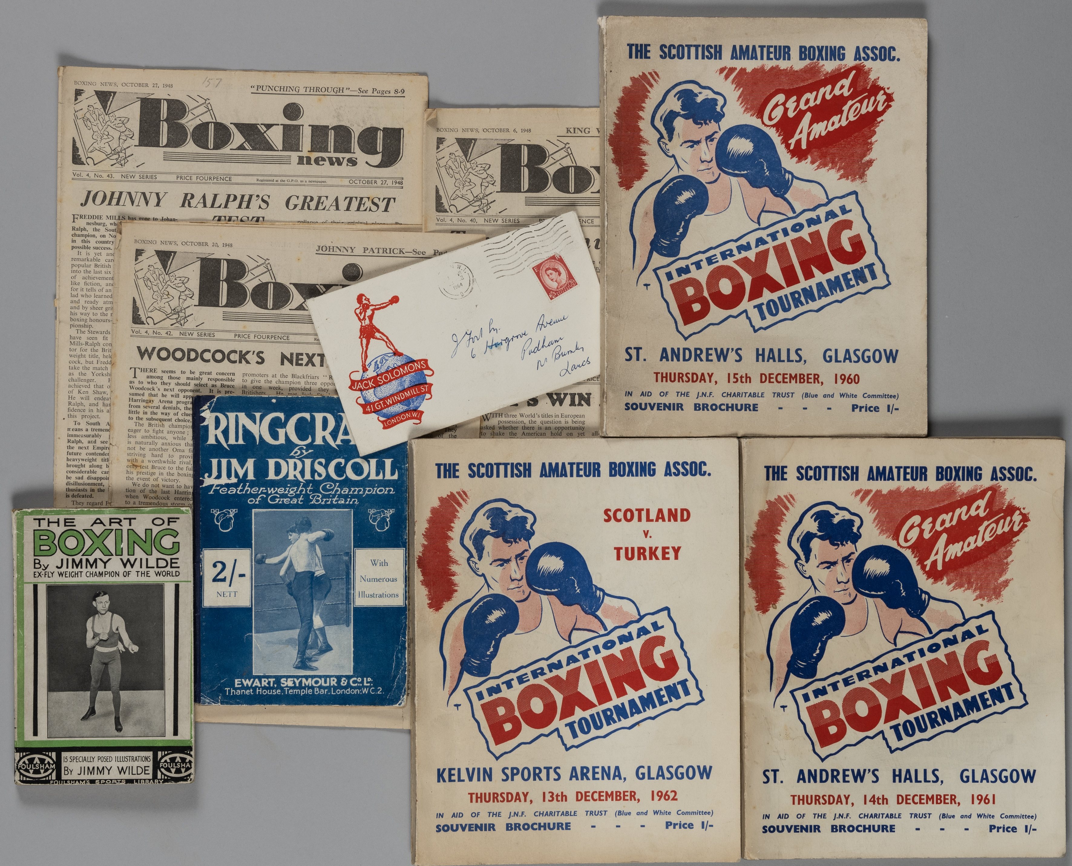 A Christie's Paloger Collection Of Muhammad Ali Memorabilia catalogue, 1997, hardback with dustjacket with price list, Pictorial History of Boxing, by Nat Fleischer & Sam E. Andre, 1959, and a collection of various boxing programmes, magazines and annuals (qty)