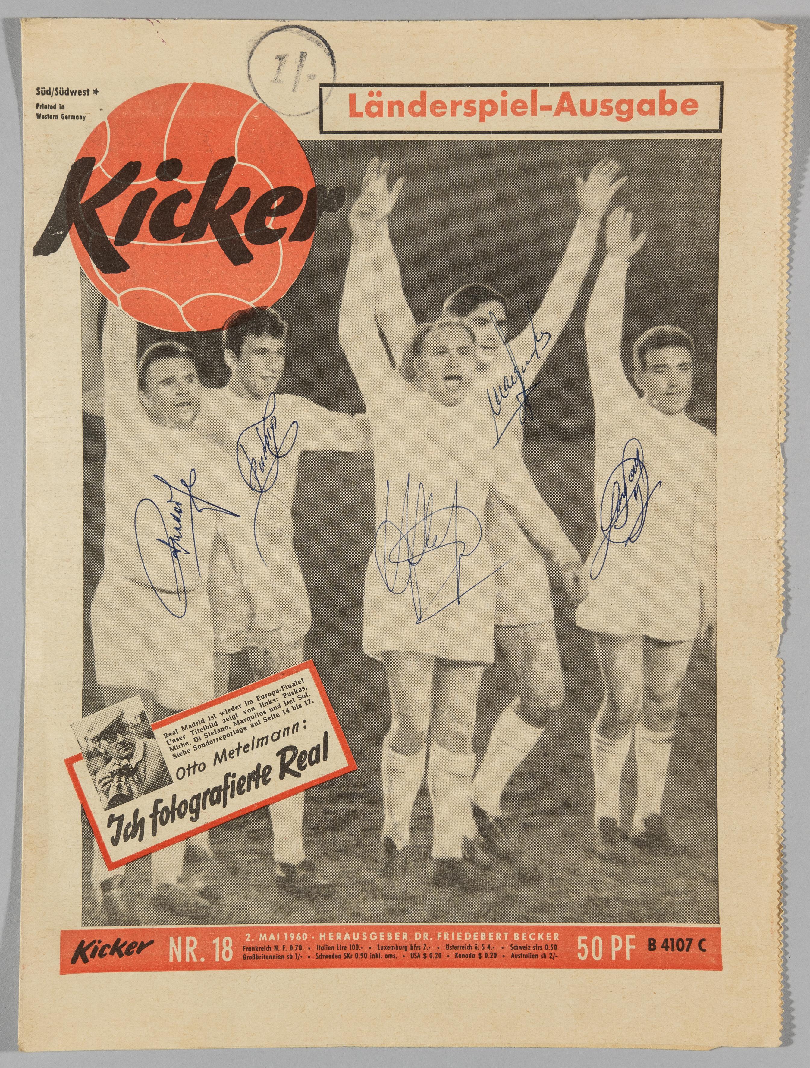 Real Madrid front page from the Kicker magazine, showing players celebrating reaching the final of the European Cup 1960, signed by all five players