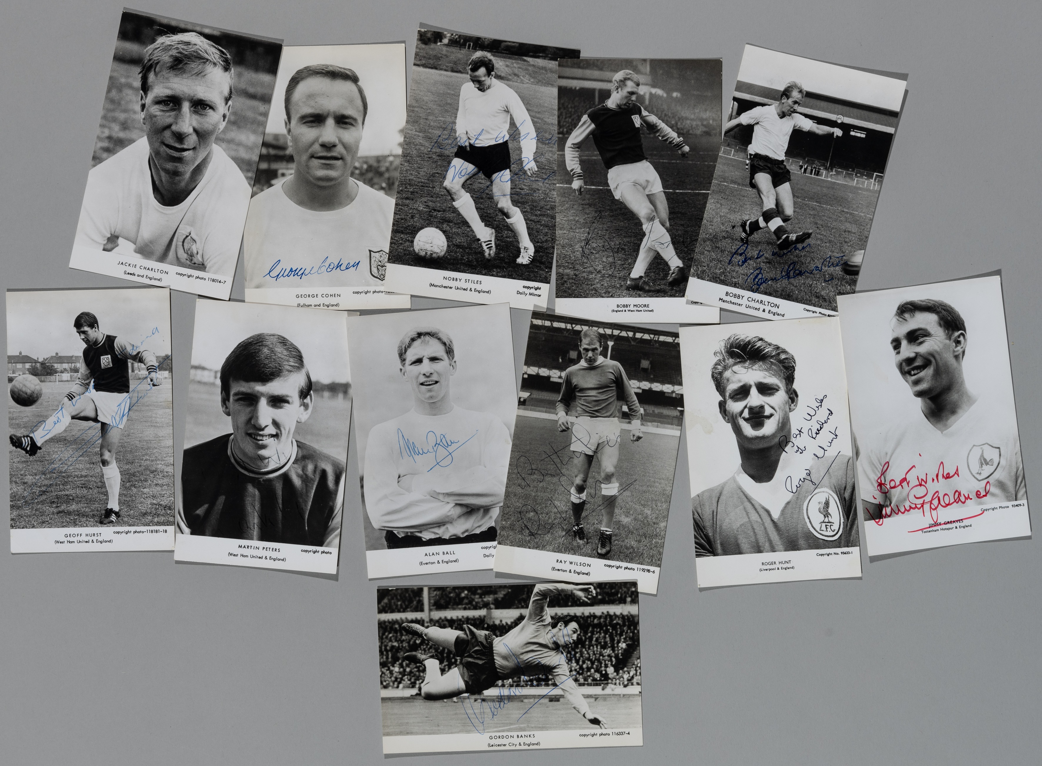 Twelve 1966 World Cup-Winners autographed cards, comprising Gordon Banks, George Cohen, Ray Wilson, Nobby Stiles, Bobby Moore, Bobby Charlton, Alan Ball, Geoff Hurst, Martin Peters, Roger Hunt, Jackie Charlton card unsigned, with Jimmy Greaves signed card (12)