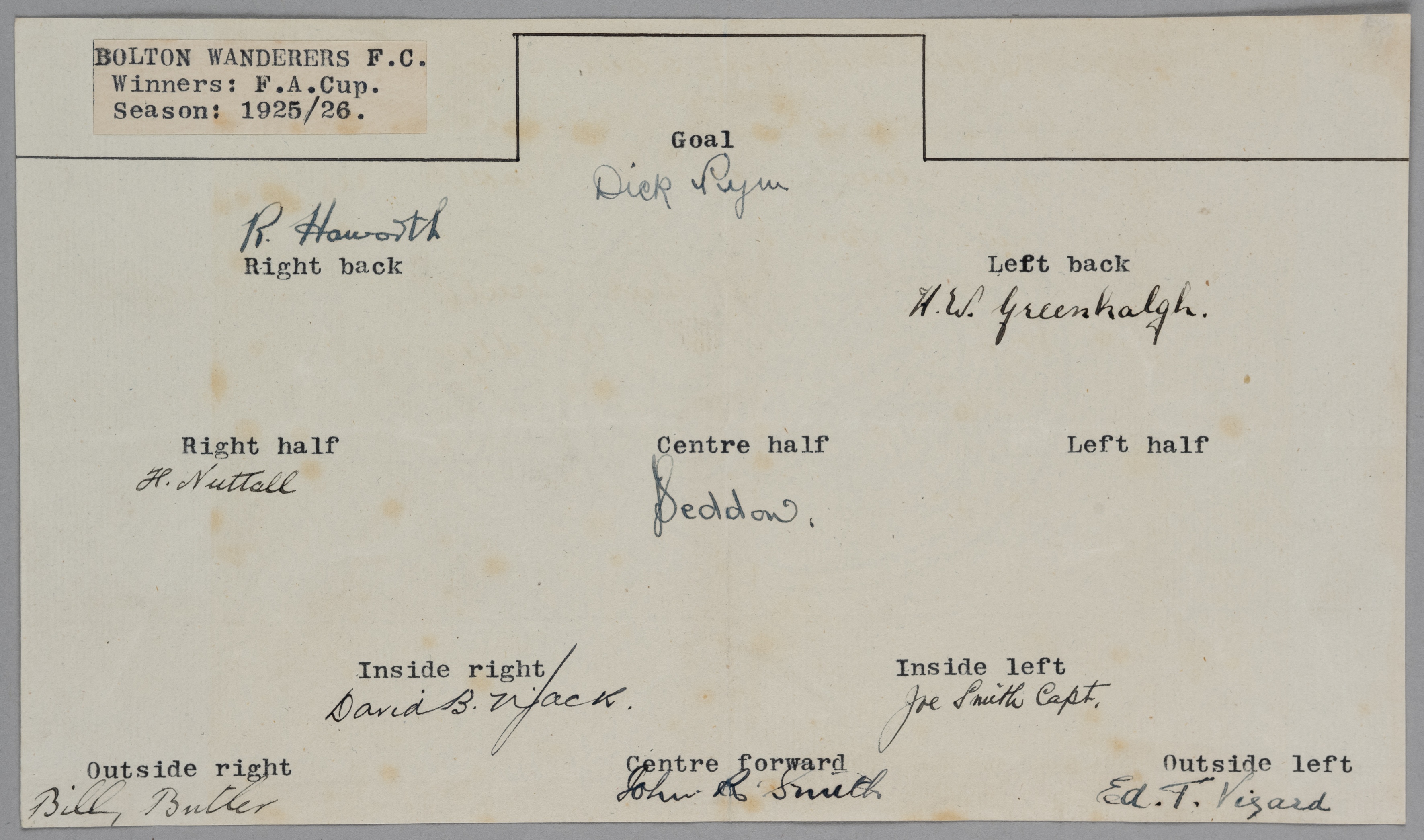 Bolton Wanderers 1925-26 F.A. Cup winners rare original autographed fold-over card size 8 3/4 by 5in. with typed team grid to the open interior, fully