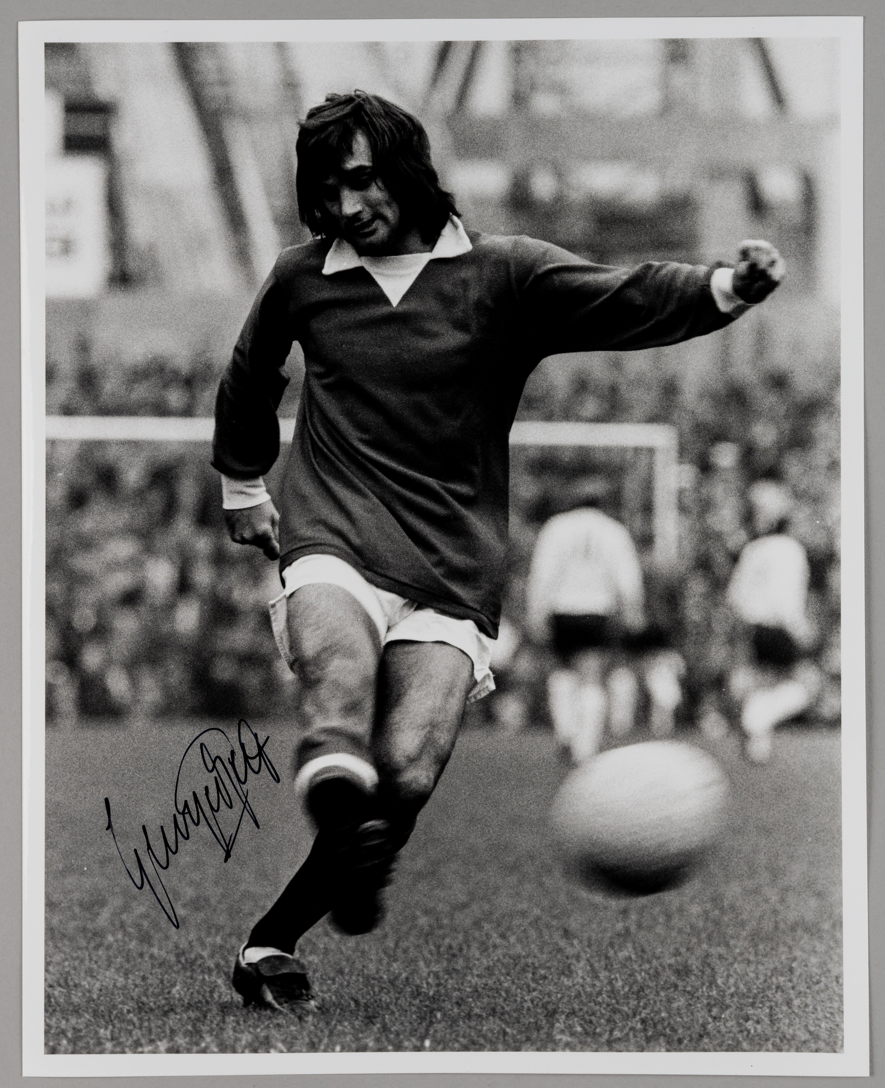 George Best original autographed b&w 10 by 8in. photograph, depicting Best in action for Manchester United, circa 1968, nicely signed in black pen, very good condition. George Best (22nd May 1946 – 25th November 2005) was a Northern Irish professional footballer who played as a winger for Manchester United and the Northern Ireland national team. In 1968, he won the European Cup with Manchester United, and was named the European Footballer of the Year and FWA Footballer of the Year. The Irish Football Association described him as the "greatest player to ever pull on the green shirt of Northern Ireland".