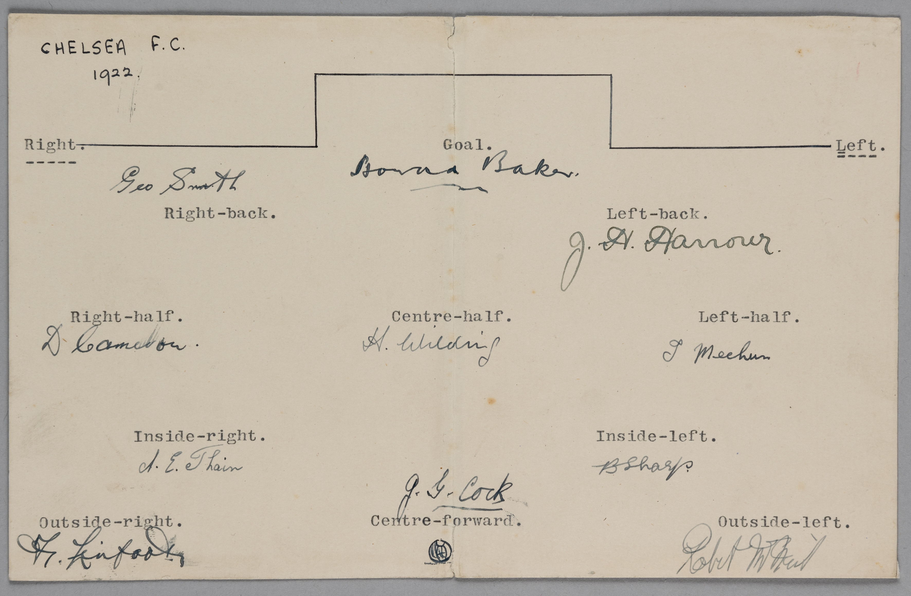 Chelsea FC 1922-23 rare original autographed fold-over card, size 8.5 by 5.5in. with typed team grid to the open interior, fully autographed in fountain pen to their individual team positions by the Chelsea team for 1922-23. Eleven original signatures including the rare examples of the teams’ four England International players, including: Howard Baker, Jack Harrow, Tommy Meehan (extremely rare signature), Jack Cock, George Smith, David Fraser, Tommy Wilding, David Cameron, Albert Thain, Fred Linfoot and Buchanan Sharp, very good condition Benjamin Howard Baker (13 February 1892 – 10 September 1987) was an English athlete who excelled in a wide range of sports, mostly in football and high jump. Baker was goalkeeper for Chelsea, Everton and twice for England, making his debut in 1921 and his second and last cap in 1925. He played for the "Amateurs" in the 1925 FA Charity Shield. He was also an international-level water-polo goalkeeper. Jack Harry Harrow (8 October 1888 – 19 July 1958) was an English footballer who spent his entire professional career at Chelsea. He played mainly as a left-back. He was club captain for most of the time between 1911 and 1926, and led Chelsea to their first appearance in an FA Cup final in 1915. He played twice for England, winning caps against Northern Ireland and Sweden in 1922 and 1923 respectively. Thomas Meehan (1896 – 18 August 1924) was an English footballer who played at wing half. He played his only international for England in October 1923. He played for Rochdale during the First World War, before moving to Manchester United in 1919. He made 53 appearances for United, scoring six goals, and signed for Chelsea in 1920 for £3,300. At the time of his move south, Meehan was rated one of the best half-backs in England, and was a regular in the Chelsea team over the next three years, playing in 133 games for the club, before being struck down with encephalitis lethargia, (an inflammation of the brain). He died in 1924 aged only 28. John Gilbert Cock MM MID (14 November 1893 – 19 April 1966) was an English footballer who played for various English club sides as a centre forward. He also had the distinction of being the first Cornishman to play for the England national team, making his England debut against Ireland in 1919, and opening the scoring after 30 seconds, which is currently the third-fastest timed England goal of all time. He won a second (and final) cap against Scotland in 1920, again scoring.