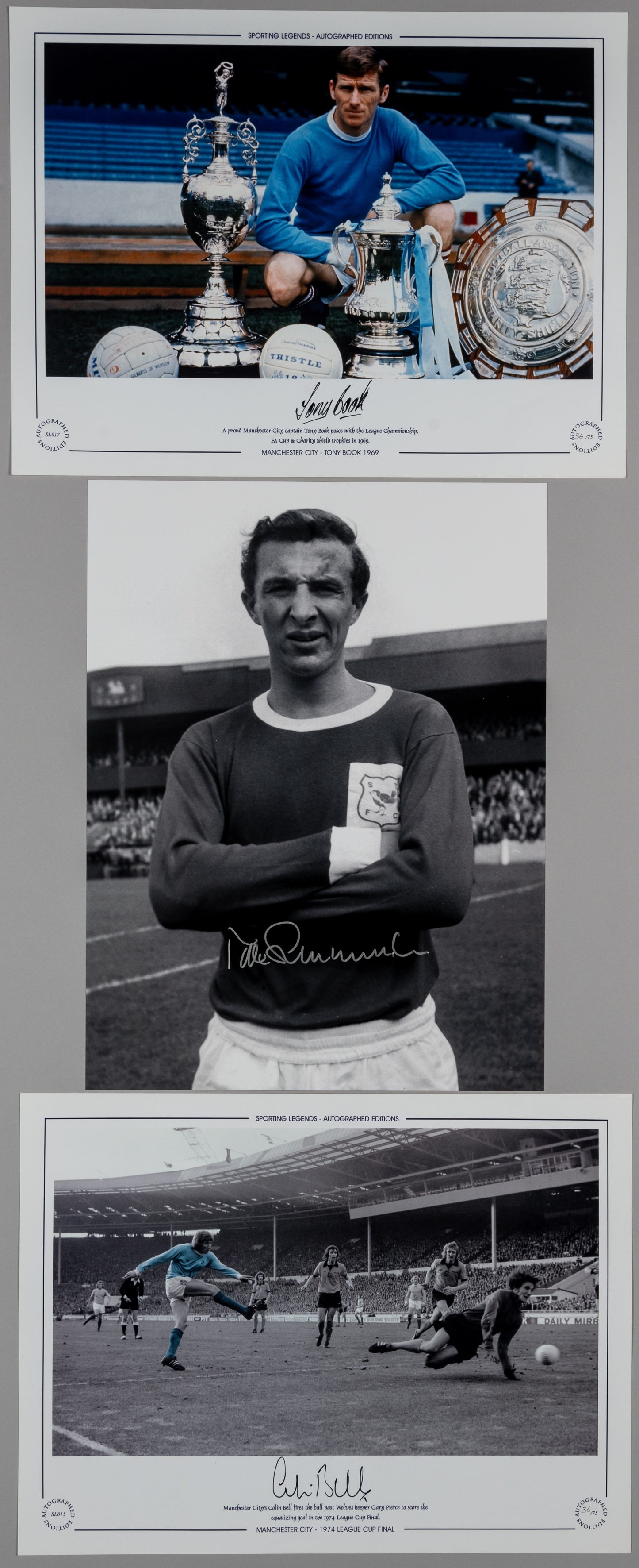 Manchester City: Colin Bell, Mike Book & Mike Summerbee three large 16 by 12in. autographed Limited Edition display photographs, Colin Bell Ltd Ed No 36/75 scoring the equalizer in the 1974 League Cup Final with smaller authentication photograph depicting Colin Bell signing the image; Tony Book Posing with the 1968 League Championship trophy, 1969 F.A Cup and 108 Charity Shield trophies. Ltd Ed No 36/75; Mike Summerbee large 16 by 12in. beautifully signed display photograph, all three images superbly autographed with large original signatures, (3)