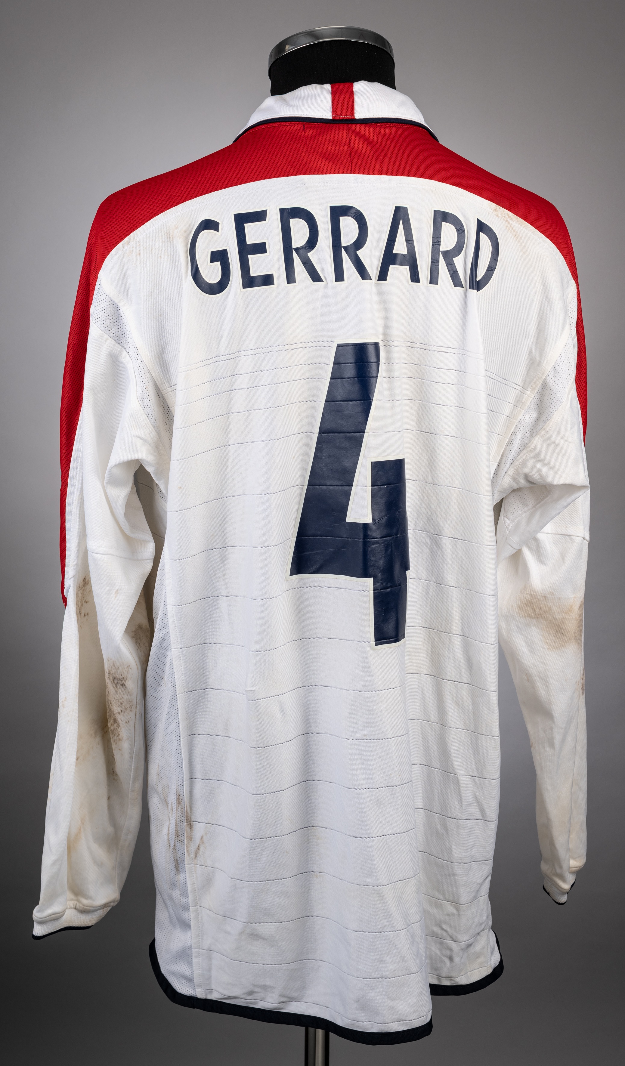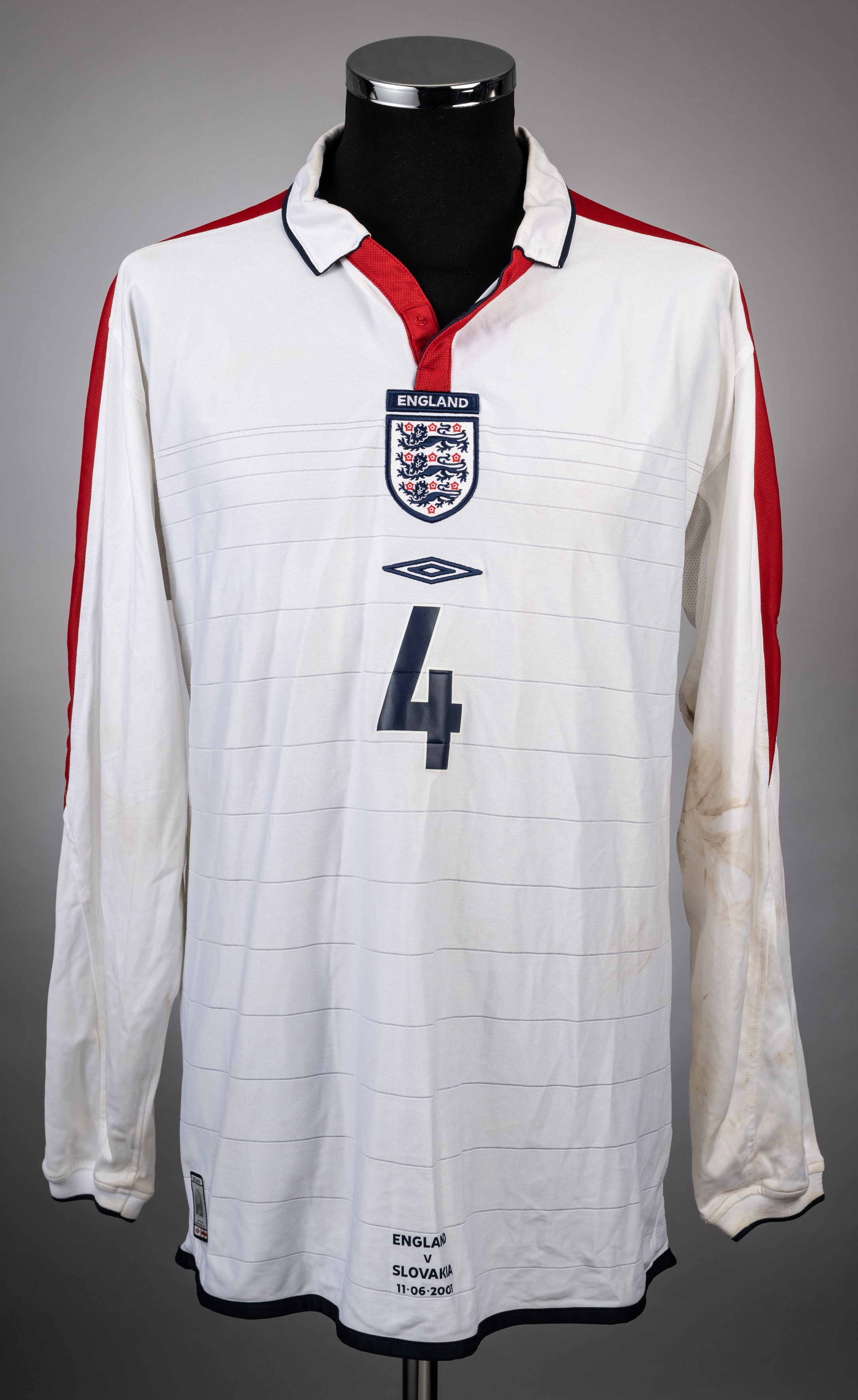 Steven Gerrard white red and blue No.4 England v. Slovakia match worn long-sleeved jersey, Umbro, XL, with button-up collar and embroidered three lion badge inscribed ENGLAND, and with England v. Slovakia 11.06.2003 decal, the reverse lettered GERRARD, areas of pitch staining, front, sleeves and back In the European Championship Qualifying Group G match against Slovakia played on 11th June 2003 at the Riverside Stadium, England defeated Slovakia 2-1