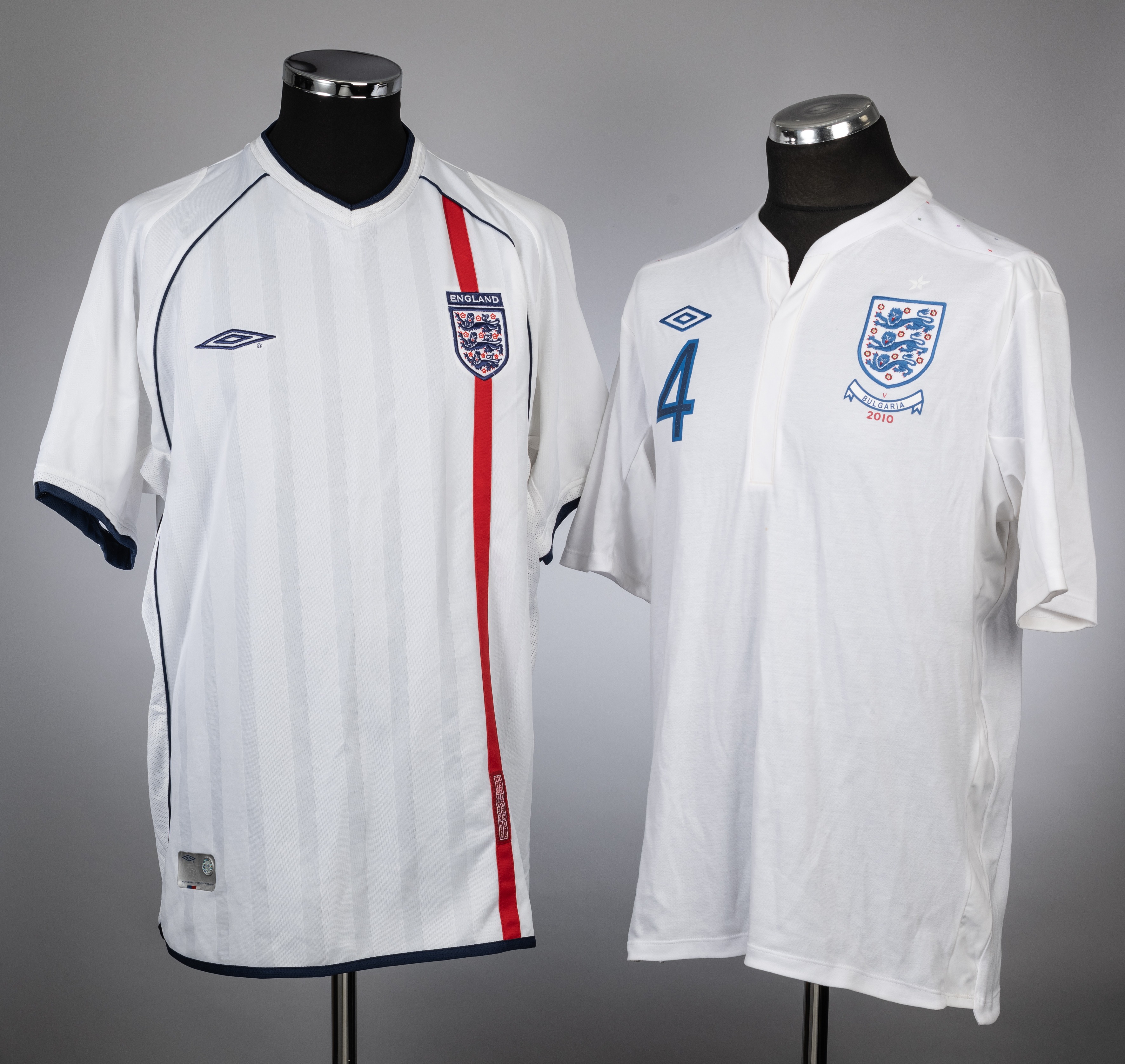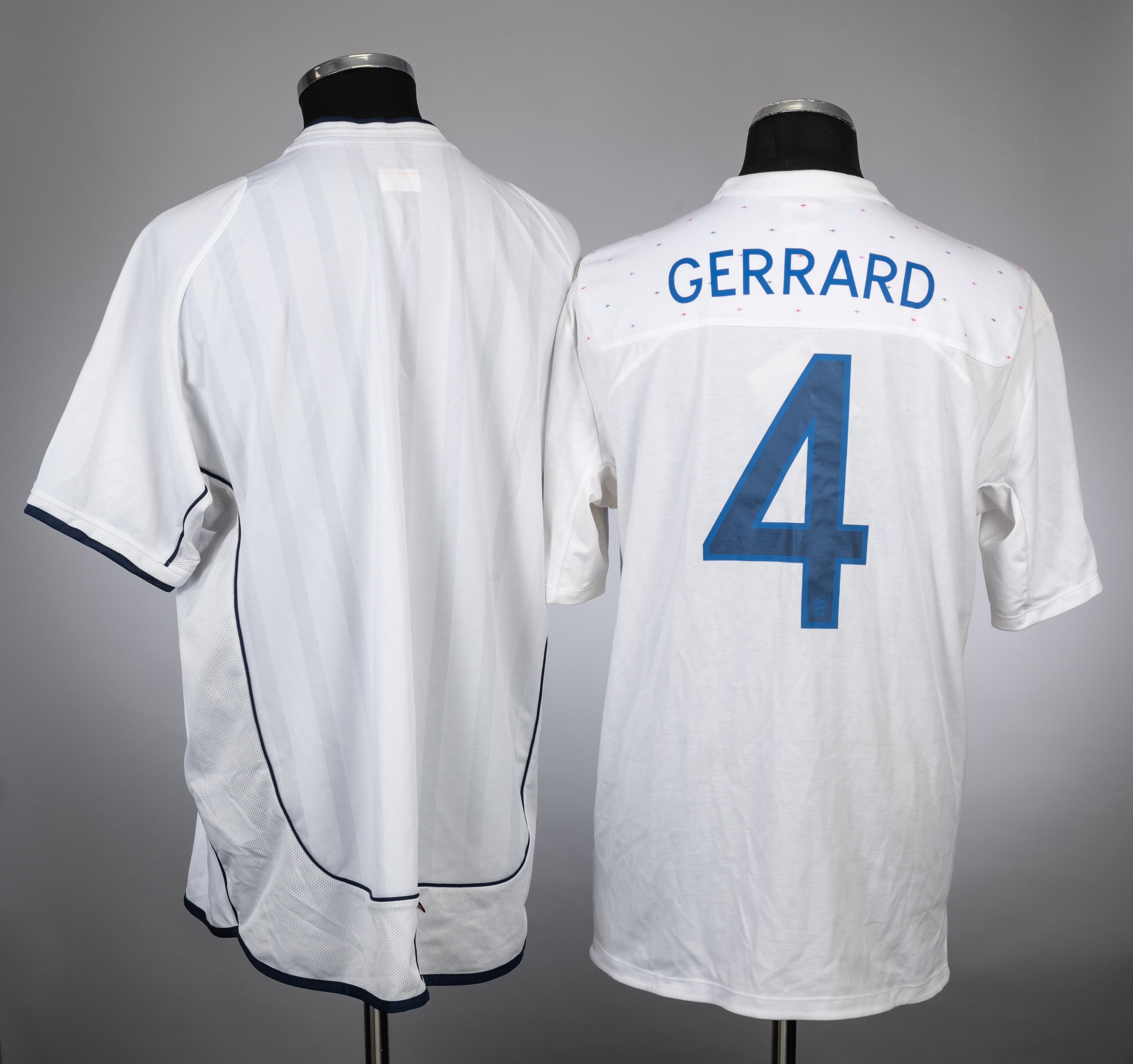 Steven Gerrard white No.4 England v. Bulgaria short-sleeved jersey, 2010, Umbro, 44, with v-neck collar and embroidered three lions badge with v BULGARIA 2010 decal, the reverse lettered GERRARD and a white unnumbered England shirt, 2001-03 (2)
