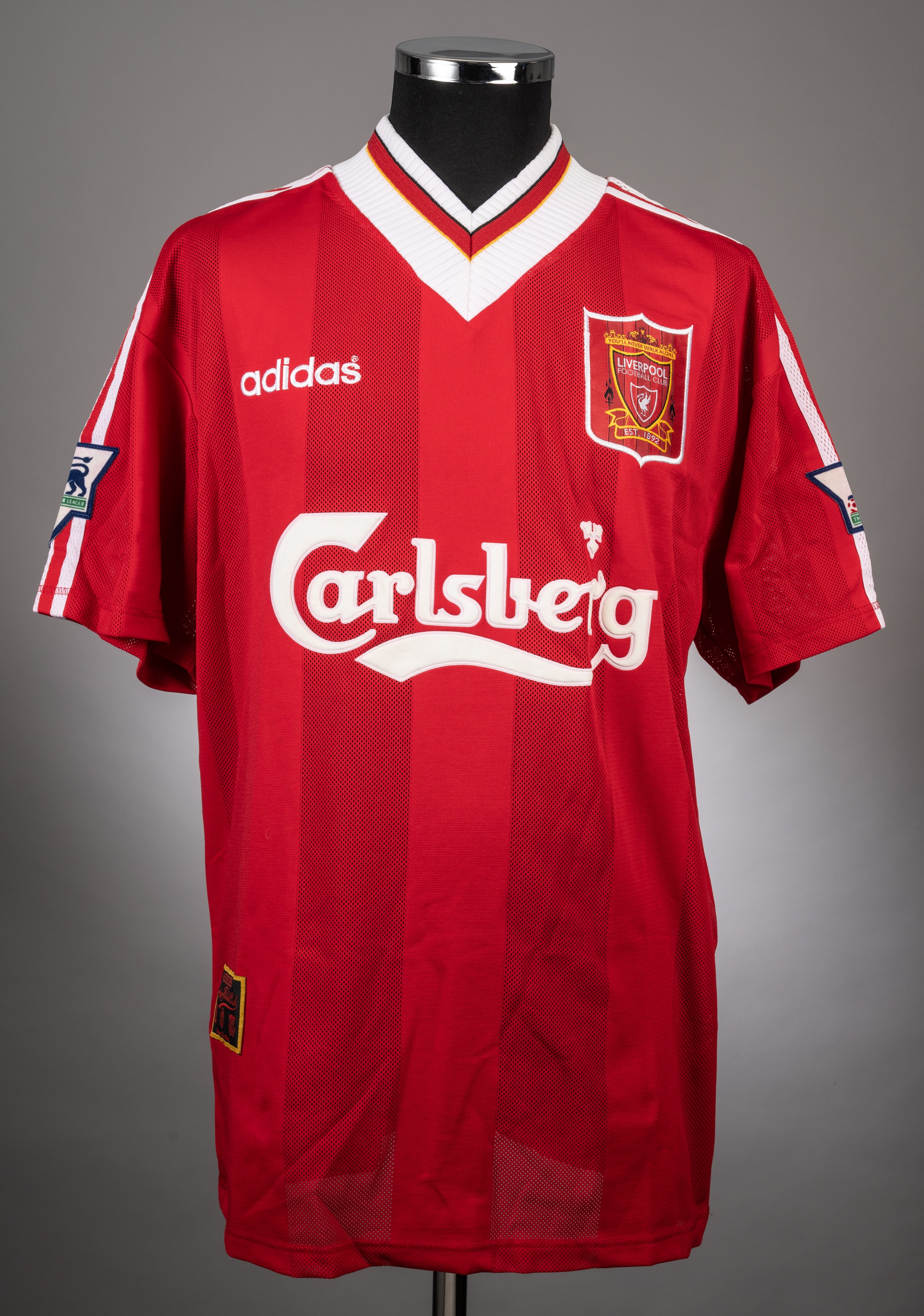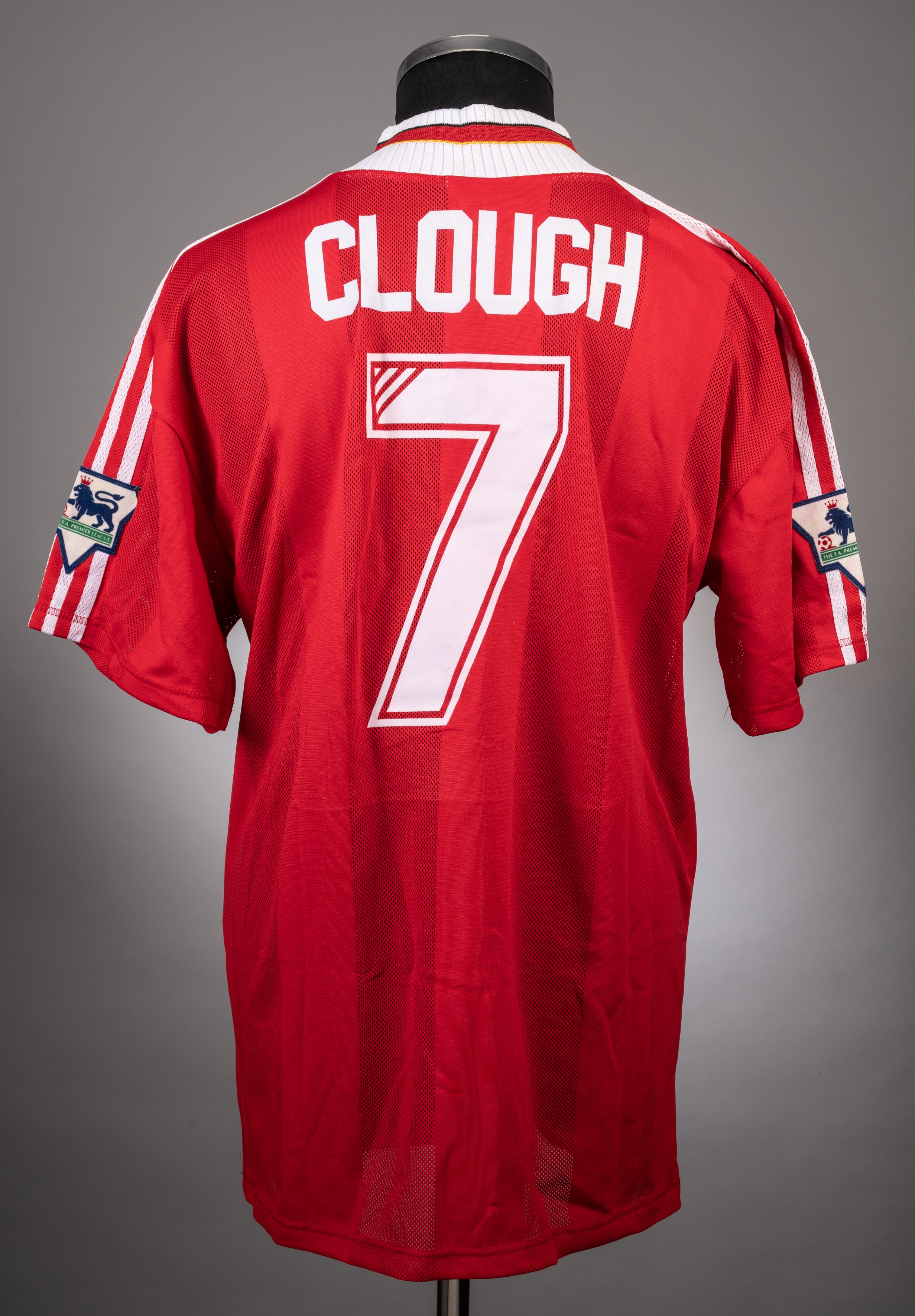 Nigel Clough red Liverpool FC home jersey from the 1995-96 season. Player issue Adidas short sleeved example with the Barclays Premier League badges