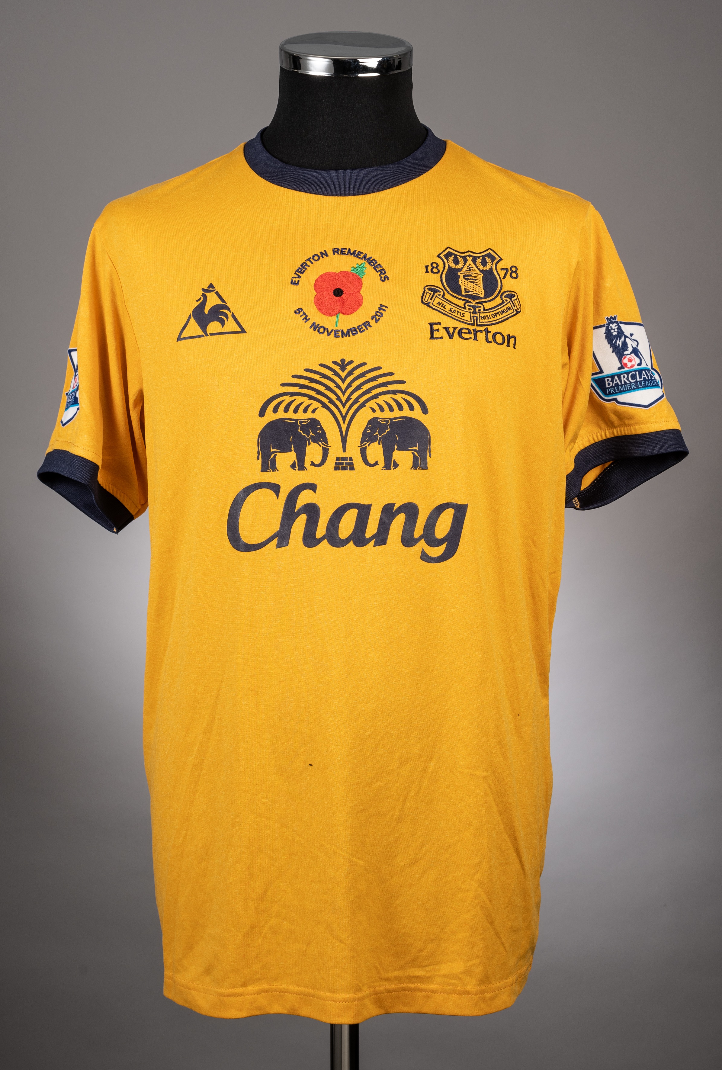 Leon Osman gold Everton FC away jersey season 2011-12 from the game v Newcastle United that took place at St James Park 5/11/2011. Player issue Le Coq Sportif short sleeved example with Barclays Premier League badges on both arms. The front has the Club crest and also the "CHANG" sponsor logo. It also features the "Everton Remembers" poppy logo and game details which have been embroidered on. The reverse is lettered OSMAN bears the number 21. It is signed underneath by the player in black marker pen There is no evidence of match wear and the shirt is in excellent condition Newcastle United won the game by 2 goals to 1, with Jack Rodwell registering for Everton. Osman played the full game for the Toffees.