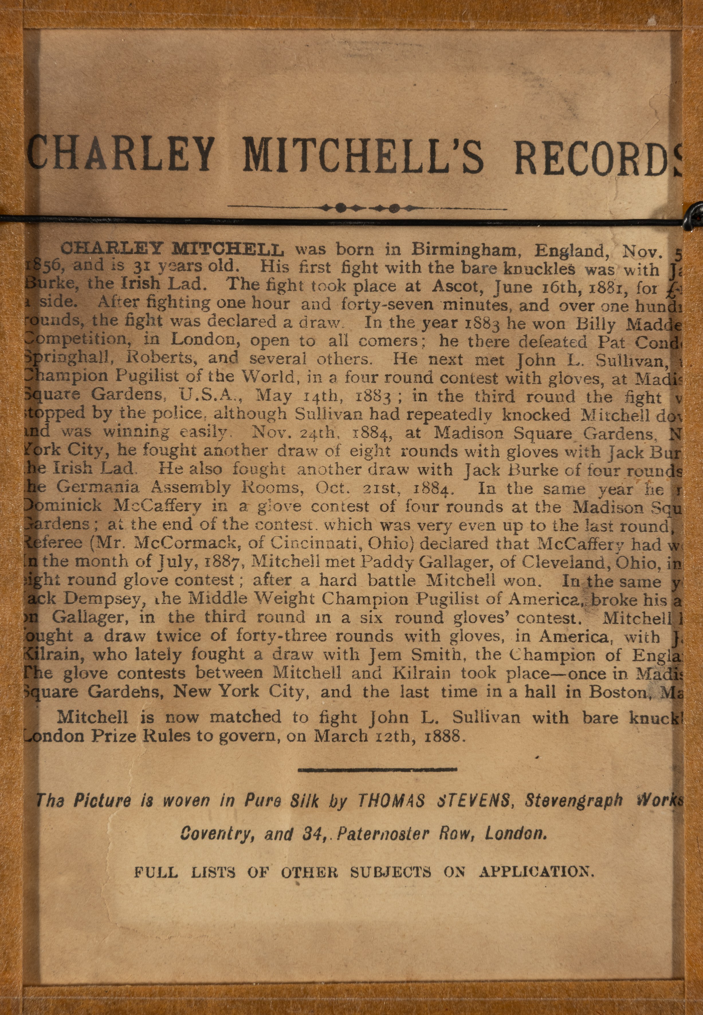A Victorian silk Stevengraph of boxer Charley Mitchell, the reverse giving detail of Mitchell's career, 4 by 2.12in., framed All glass will be remo