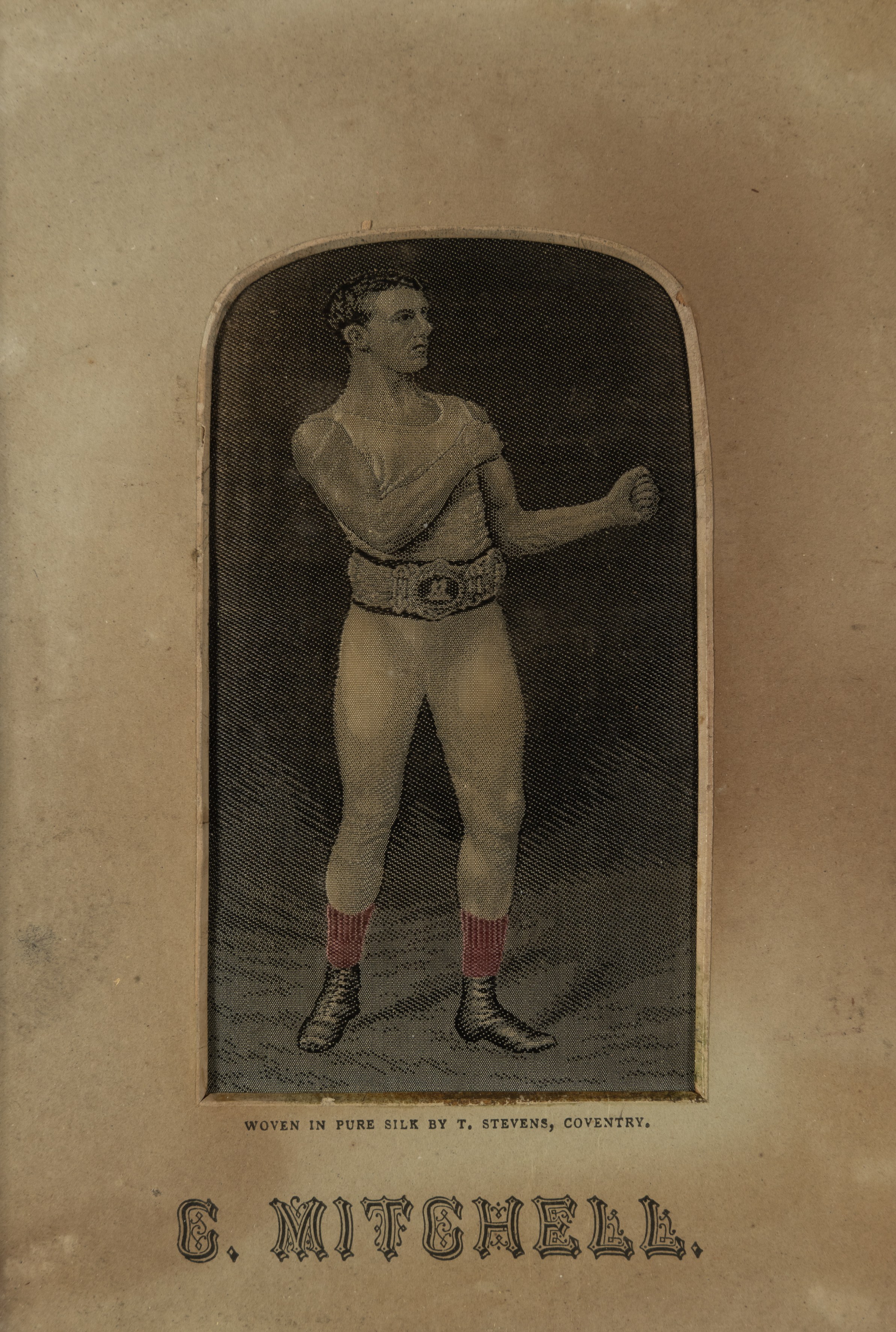 A Victorian silk Stevengraph of boxer Charley Mitchell, the reverse giving detail of Mitchell's career, 4 by 2.12in., framed All glass will be removed from framed and glazed items prior to posting and may result in delays to shipping your items. (This service is included in the cost of postage and packing). We can also totally remove all framing and mounts upon request to reduce shipping costs. Alternatively, lots can be collected in person by prior appointment from NN8 1RT.