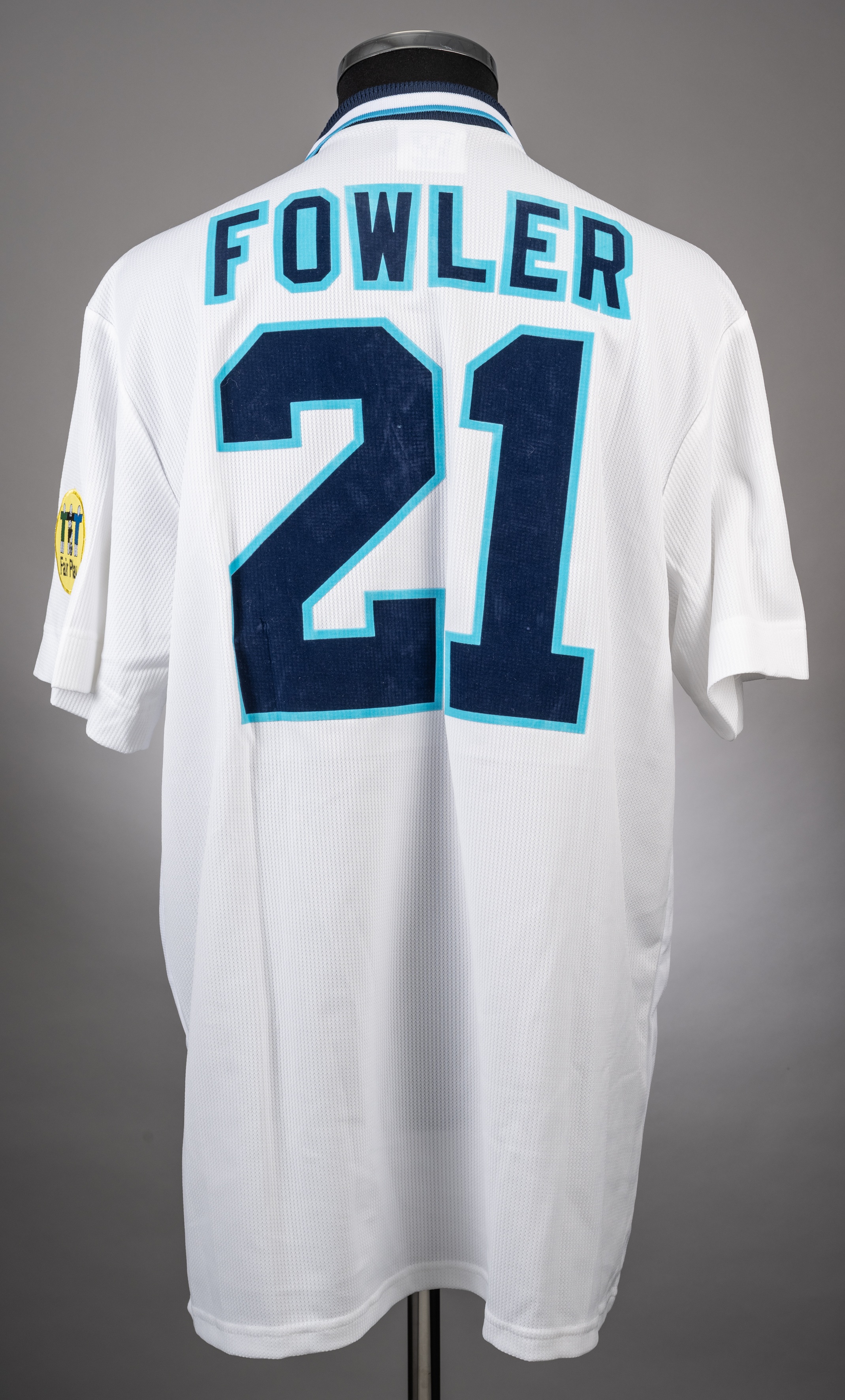 Robbie Fowler white England home jersey from the Euro 96 competition held here from June 8th to June 30th 1996, This is a tournament issued Umbro short sleeved example with the UEFA Fair Play badge on the left arm and the Euro 96 badge on the right. The front has the Three Lions crest mounted centrally below the UMBRO manufacturers' logo. The squad number 21 is present below the crest. The back is lettered FOWLER, bears the no.21 and is size XL. There is no evidence of match wear and the shirt is in excellent condition. Robbie Fowler was a key part of Terry Venables' Euro 96 squad and made two appearances for the Three Lions as England made their way to the semi final in front of a captivated audience only to see their hopes of truly bringing football home dashed by losing in the penalty shoot out on June 26th at the game's spiritual home, Wembley Stadium.