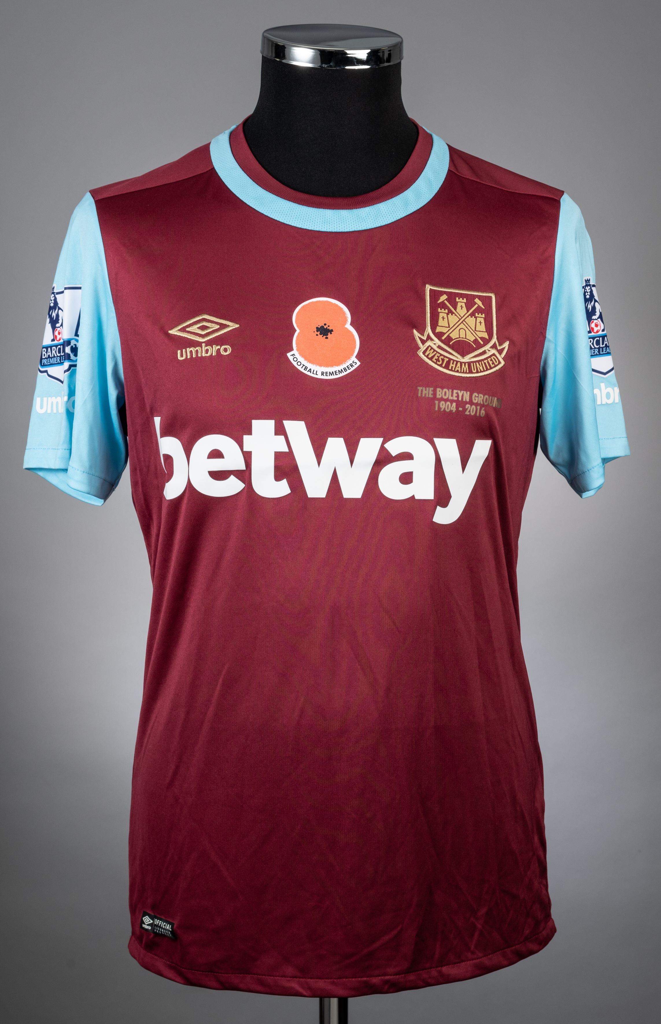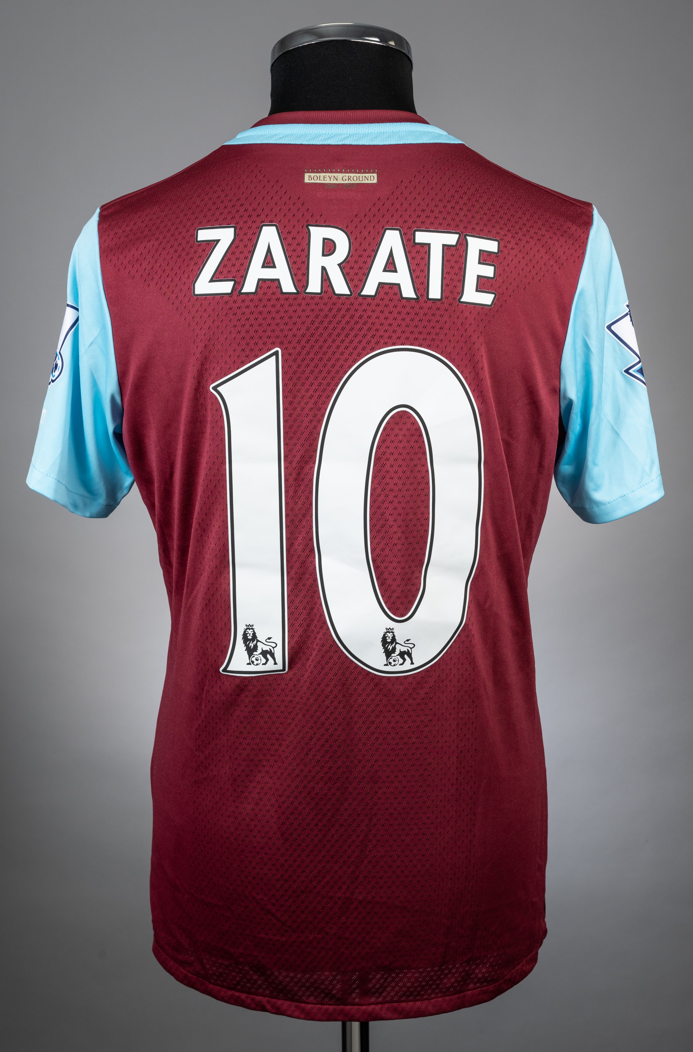 Mauro Zarate claret and blue West Ham United no.10 home jersey from the season 2015-16 game v Everton which took place on 7/11/15 at Upton Park. Player issued short sleeved UMBRO example with Barclays Premier League badges on both arms as well as UMBRO in white. The front has the West Ham United Club crest with "The Boleyn Ground- 1904-2015" in gold underneath to denote their final season at their famous old stadium. It has the BETWAY sponsor logo, the UMBRO manufacturer trademark in gold and also bears the Poppy badge, denoting that this was the game chosen that season for the Club to commemorate Remembrance Day. "BOLEYN GROUND 1904- 2016" is also picked out below the collar. There is no visible evidence of match wear and the item is in excellent condition. The game finished in a 1-1 draw with goals scored by Lanzini for West Ham and Lukaku for Everton. Zarate came on as substitute for Enner Valencia in the 69th minute.