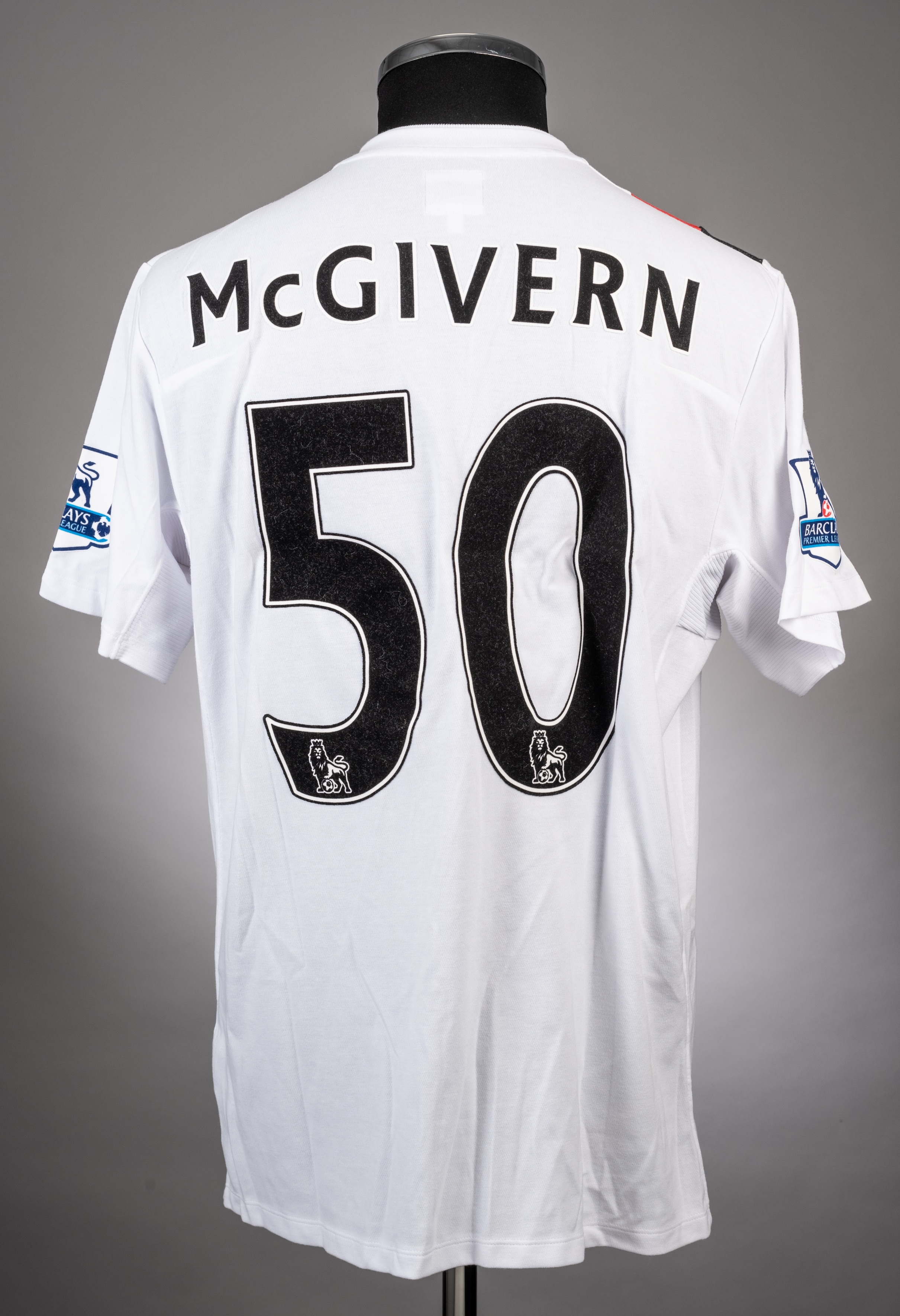 Ryan McGivern Manchester City no.50 away jersey white with red and black diagonal stripe from the 2009-10 Premiership season, Player issued short sleeved UMBRO example with Barclays Premier League badges on both sleeves. The front has the Manchester City Club crest with the ETIHAD AIRWAY sponsor logo immediately below. The UMBRO diamond manufacturer trademark is defined in gold and black. The back is lettered McGIVERN and bears the squad no. 50 and it is a UK size 42. There is no evidence of match wear and the item is in excellent condition. Ryan McGivern spent five years at Manchester City before spells at Morecambe, Leicester City, Walsall, Palace and Bristol City amongst other clubs.