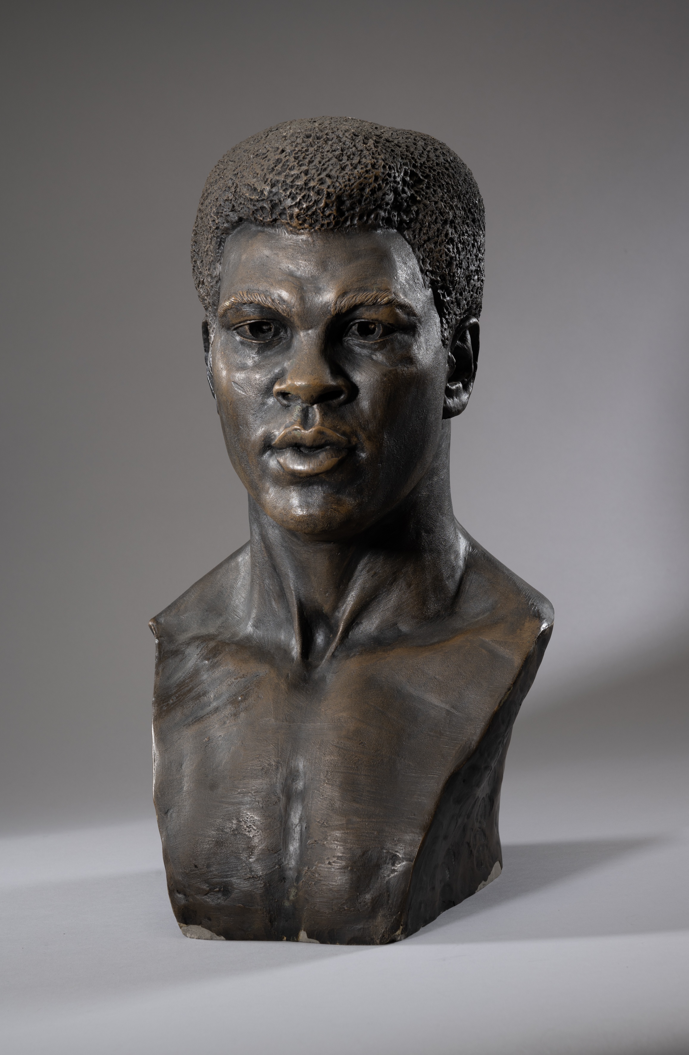 Bronzed resin profile bust of Muhammad Ali, bearing DRS inscribed artists medallion, featuring a profile of Muhammad Ali, with inscribed medallion t