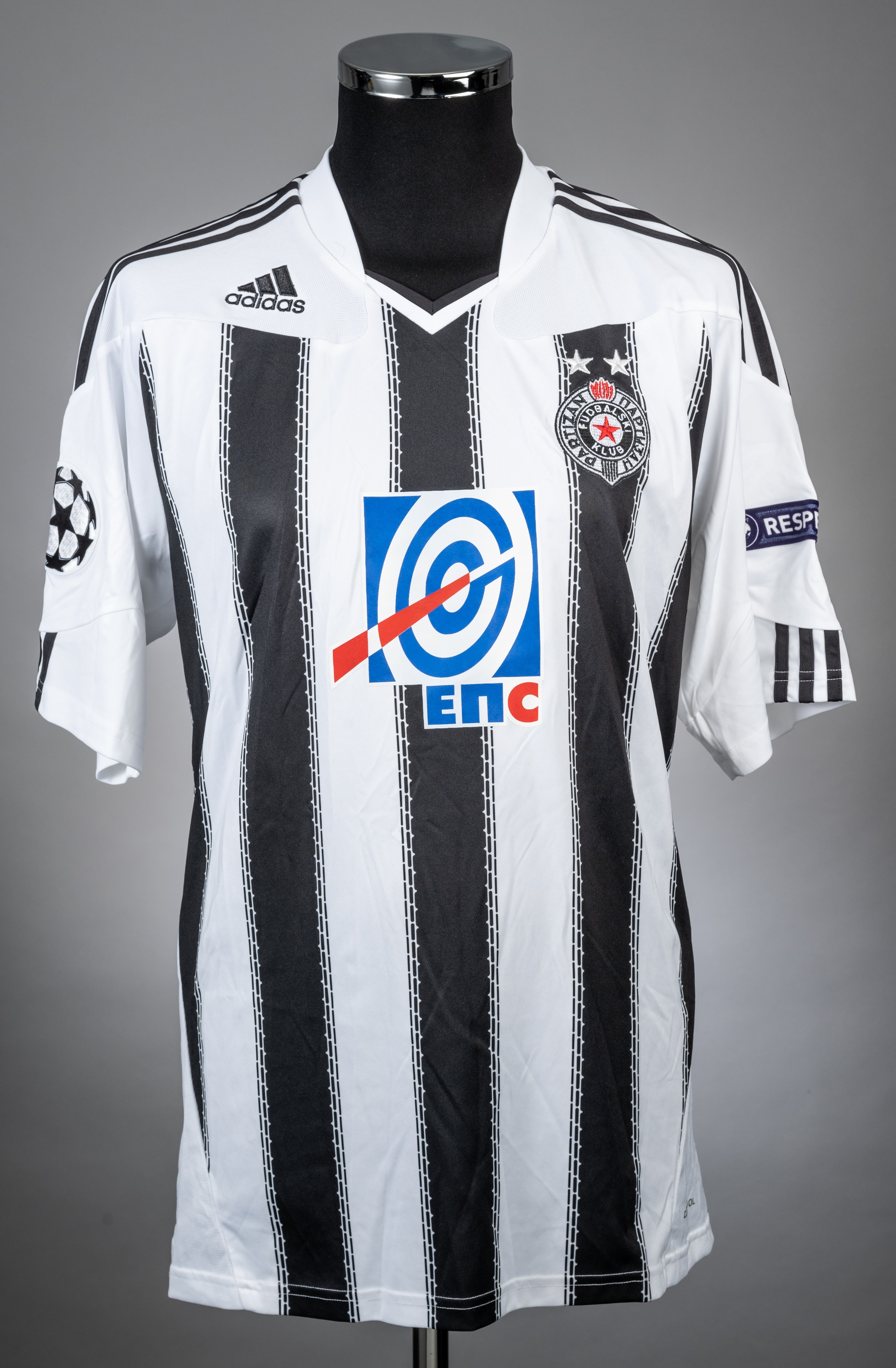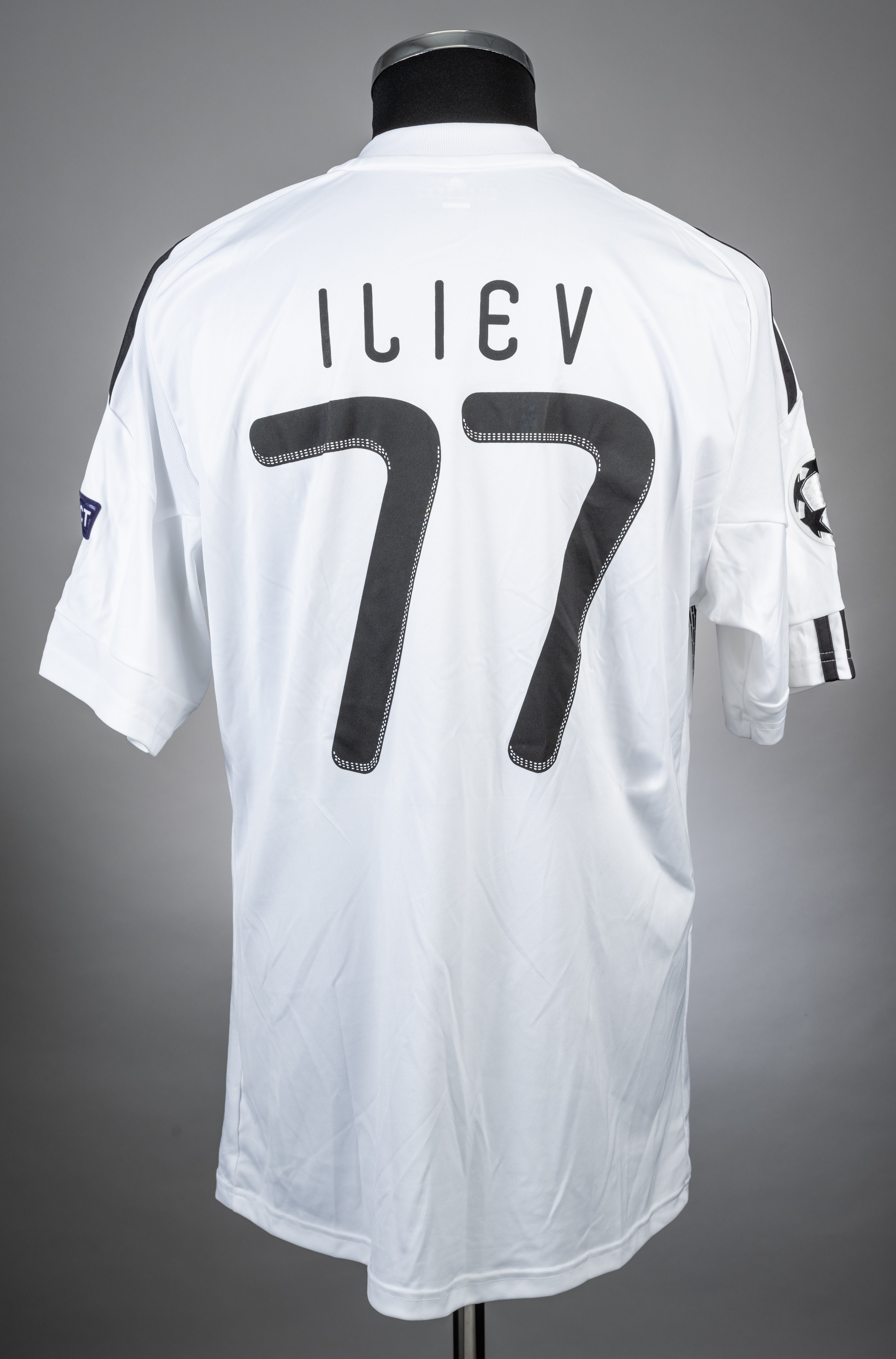 Iveca Lliev Partizan black and white Belgrade no.77 home jersey from the 2010-11 Champions League campaign game v Arsenal at the Partizan Stadium on 28/9/10. Short sleeved Adidas example with the UEFA RESPECT badge on one arm and the CHAMPIONS LEAGUE BADGE on the other. The front has the Partizan Club crest and the ENC sponsor logo which is printed on. The manufacturer trademark is present and the jersey is a size M. The back is lettered ILIEV and bears the no.77, both of which are detailed in black. The jersey itself is predominantly white with black stripes on the front. There are no visible signs of match wear and the item is in excellent condition. Arsenal won the game by 3 goals to 1. Lliev was substituted in the 84th minute with the Arsenal goals being scored by Arshavin, Chamakh and Squillaci .