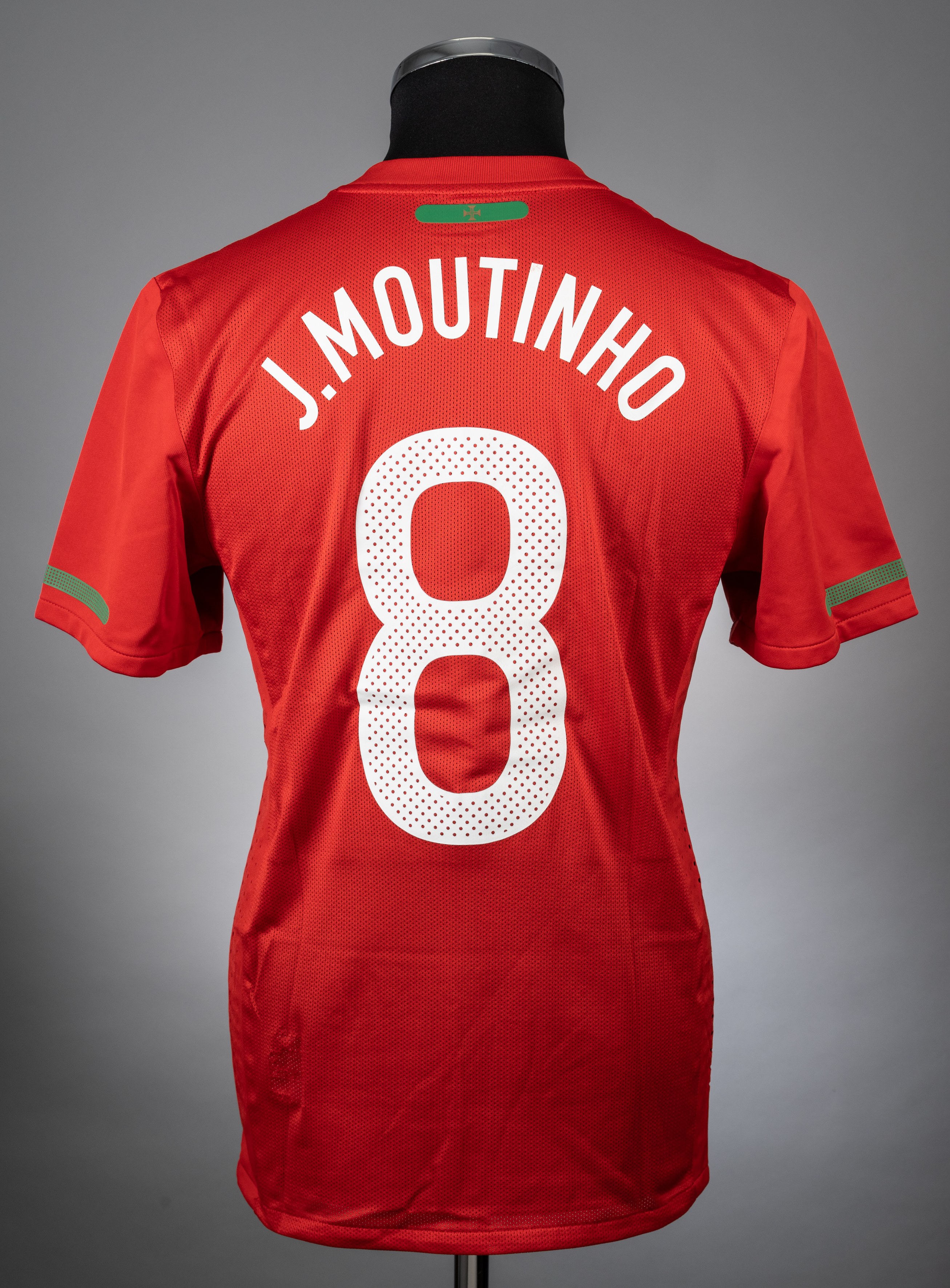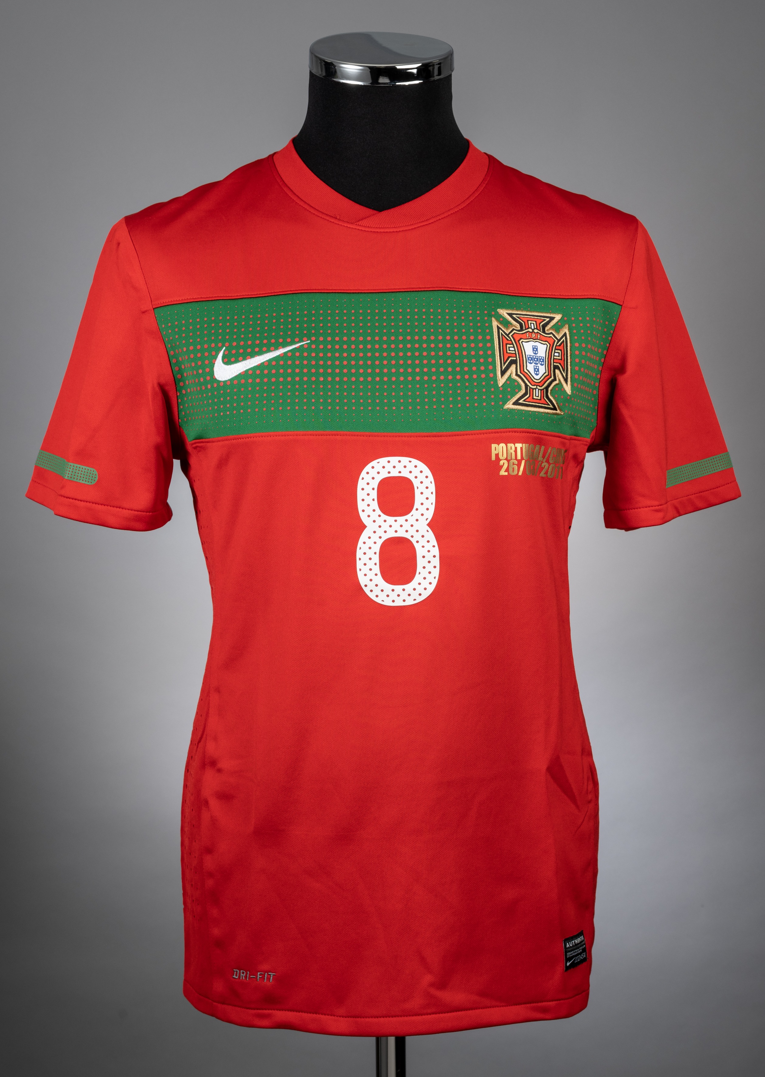 Joao Moutinho red and green No.8 Portugal v. Chile 2010-11 match worn short-sleeved jersey, Nike, M, with crew-neck collar and embroidered cloth badge inscribed F.P.F., with Portugal/Chile, 26/03/2011 decal badge, the reverse lettered J. MOUTINHO The above jersey was gained by Mark Gonzalez as a swap after the Portugal v. Chile match played on 26th March 2011, match ending in a 1-1 draw The auction proceeds for this lot are being donated to the "Shirts For Shakey" Appeal. This is a crowdfunding appeal on behalf of the esteemed football shirt collector, researcher and author Simon "Shakey" Shakeshaft and his wife Tracey in their hour of need. The initiative has been organised by the eminent shirt collectors Stephen Plant, Neville Evans and Daren Burney and is being supported by the football shirt collecting community at large. Graham Budd Auctions is pleased to have been appointed as auctioneer for the Appeal and has waived its seller's commission for this lot. More information about the Appeal can be found on the the Just Giving page: https://www.justgiving.com/crowdfunding/stephen-plant-3