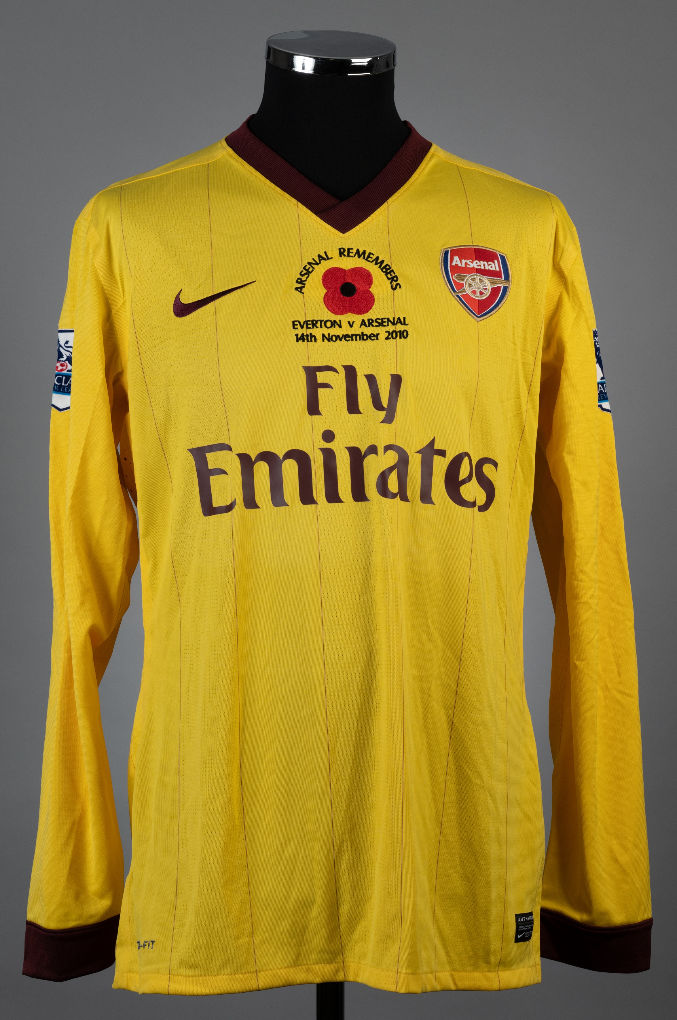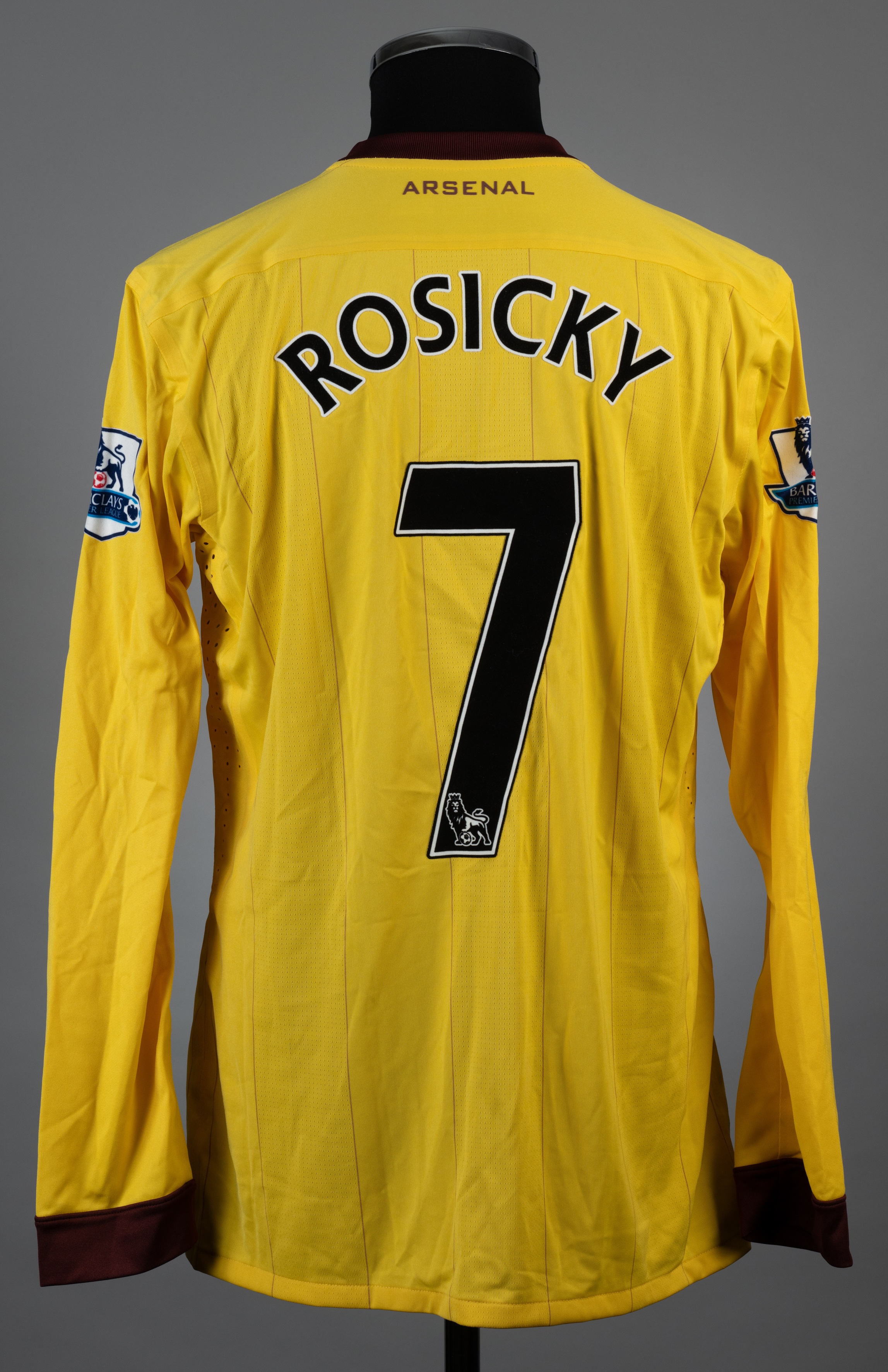 Tomas Rosicky yellow and maroon No.7 Arsenal v. Everton match worn long-sleeved jersey, 2010-11, Nike, L, with v-neck collar and embroidered cloth badge inscribed Arsenal with further Poppy bade and inscribed ARSENAL REMEMBERS, EVERTON v ARSENAL 14th November 2010, the reverse lettered ROSICKY, the sleeves with Barclays Premier League flashes The above jersey was worn by Tomas Rosicky in the match against Everton played on 14th November 2010 at Goodison Park, Arsenal drafted Everton 2-1, Rosicky came on as a substitute to replace Arshavin The auction proceeds for this lot are being donated to the "Shirts For Shakey" Appeal. This is a crowdfunding appeal on behalf of the esteemed football shirt collector, researcher and author Simon "Shakey" Shakeshaft and his wife Tracey in their hour of need. The initiative has been organised by the eminent shirt collectors Stephen Plant, Neville Evans and Daren Burney and is being supported by the football shirt collecting community at large. Graham Budd Auctions is pleased to have been appointed as auctioneer for the Appeal and has waived its seller's commission for this lot. More information about the Appeal can be found on the the Just Giving page: https://www.justgiving.com/crowdfunding/stephen-plant-3
