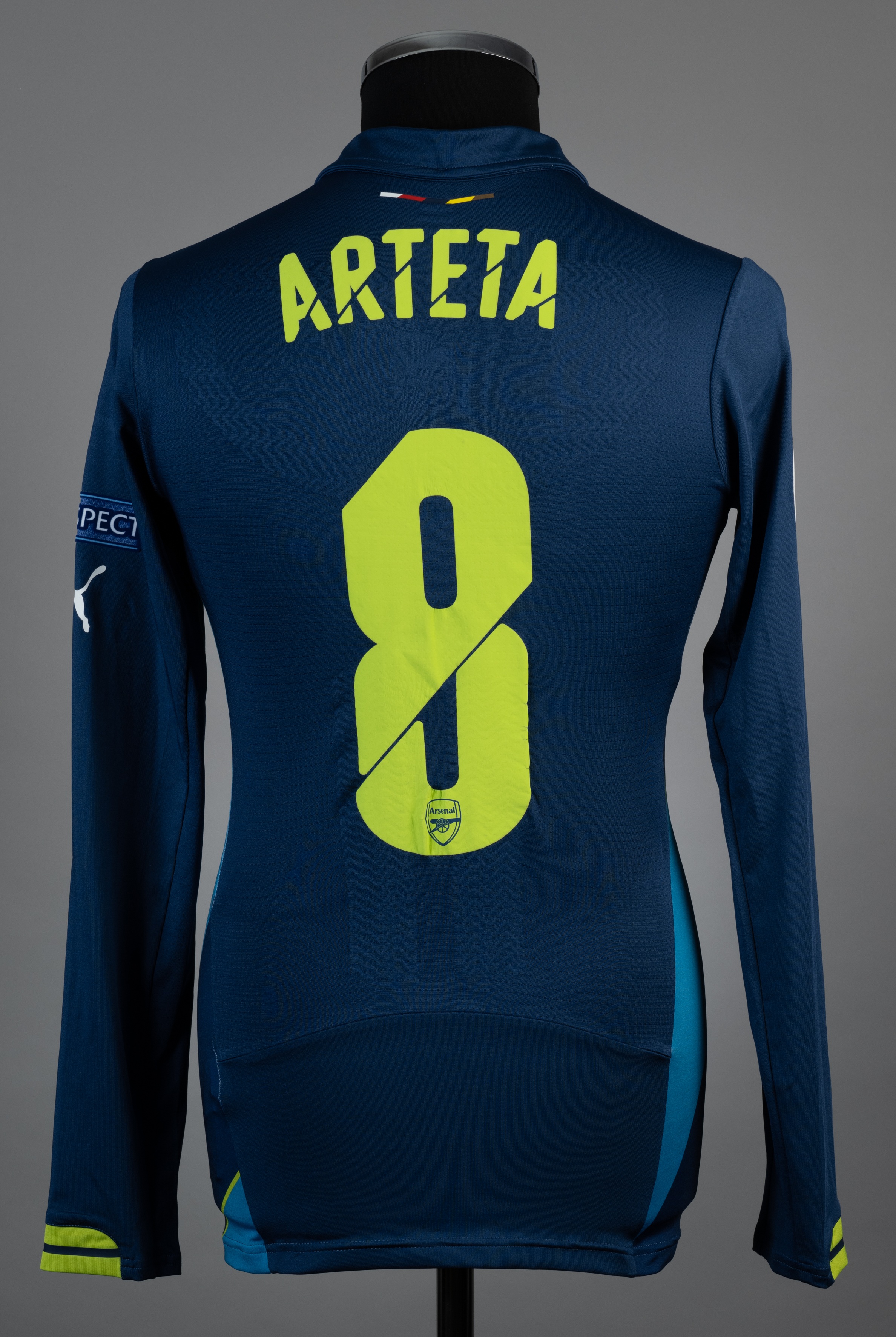 Mikel Arteta navy and blue No.8 Arsenal long-sleeved jersey, 2014-15, 3rd kit, Puma, M, with button-up collar and printed badge, the reverse lettere