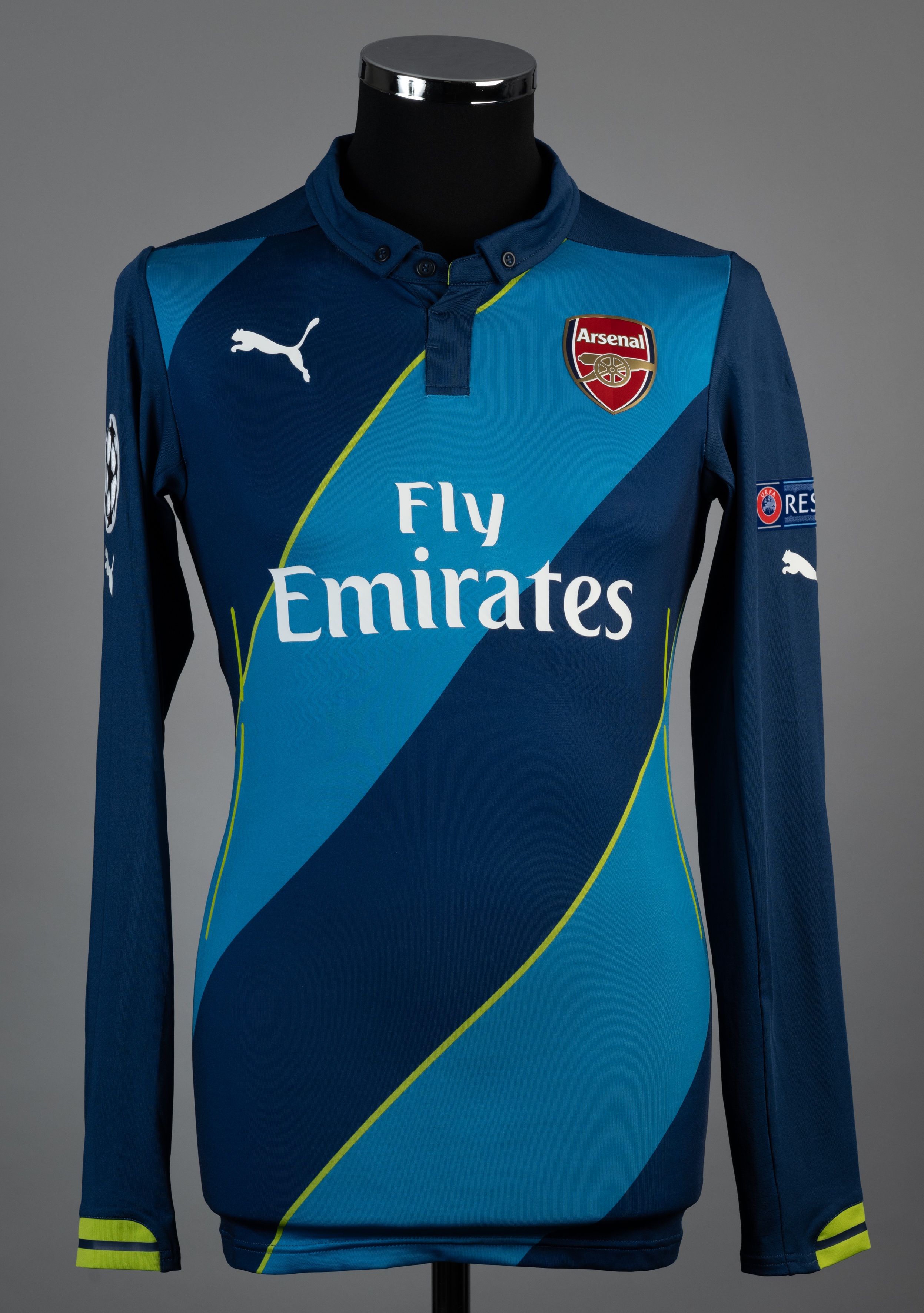 Mikel Arteta navy and blue No.8 Arsenal long-sleeved jersey, 2014-15, 3rd kit, Puma, M, with button-up collar and printed badge, the reverse lettered ARTETA, the right sleeve with Champions League flash the other with UEFA Respect flash The auction proceeds for this lot are being donated to the "Shirts For Shakey" Appeal. This is a crowdfunding appeal on behalf of the esteemed football shirt collector, researcher and author Simon "Shakey" Shakeshaft and his wife Tracey in their hour of need. The initiative has been organised by the eminent shirt collectors Stephen Plant, Neville Evans and Daren Burney and is being supported by the football shirt collecting community at large. Graham Budd Auctions is pleased to have been appointed as auctioneer for the Appeal and has waived its seller's commission for this lot. More information about the Appeal can be found on the the Just Giving page: https://www.justgiving.com/crowdfunding/stephen-plant-3