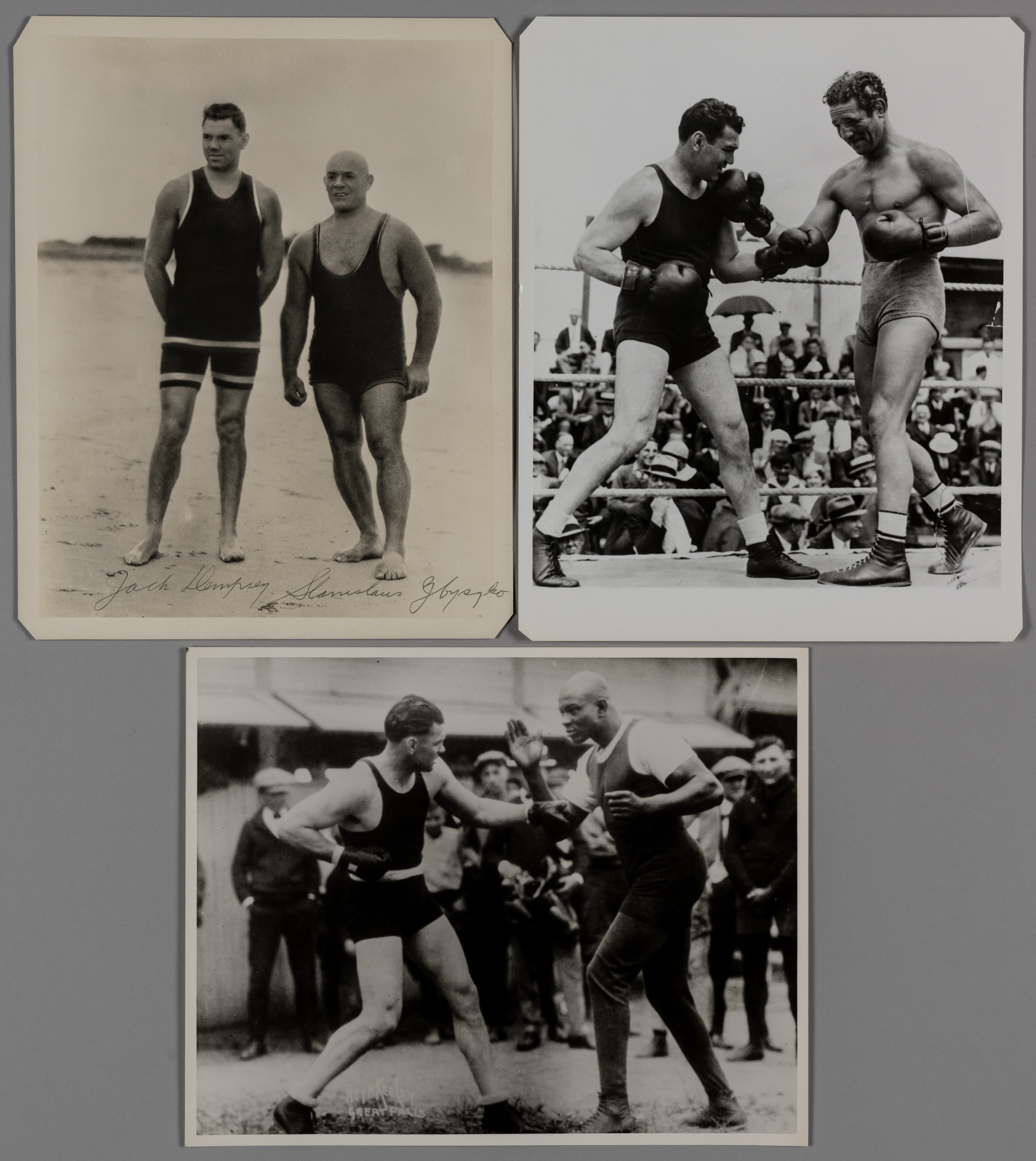 Jack Dempsey boxing photographs with opponents and sparring partners, three b&w/sepia 10 by 8in., heavyweight boxing including Dempsey and Tunney fig