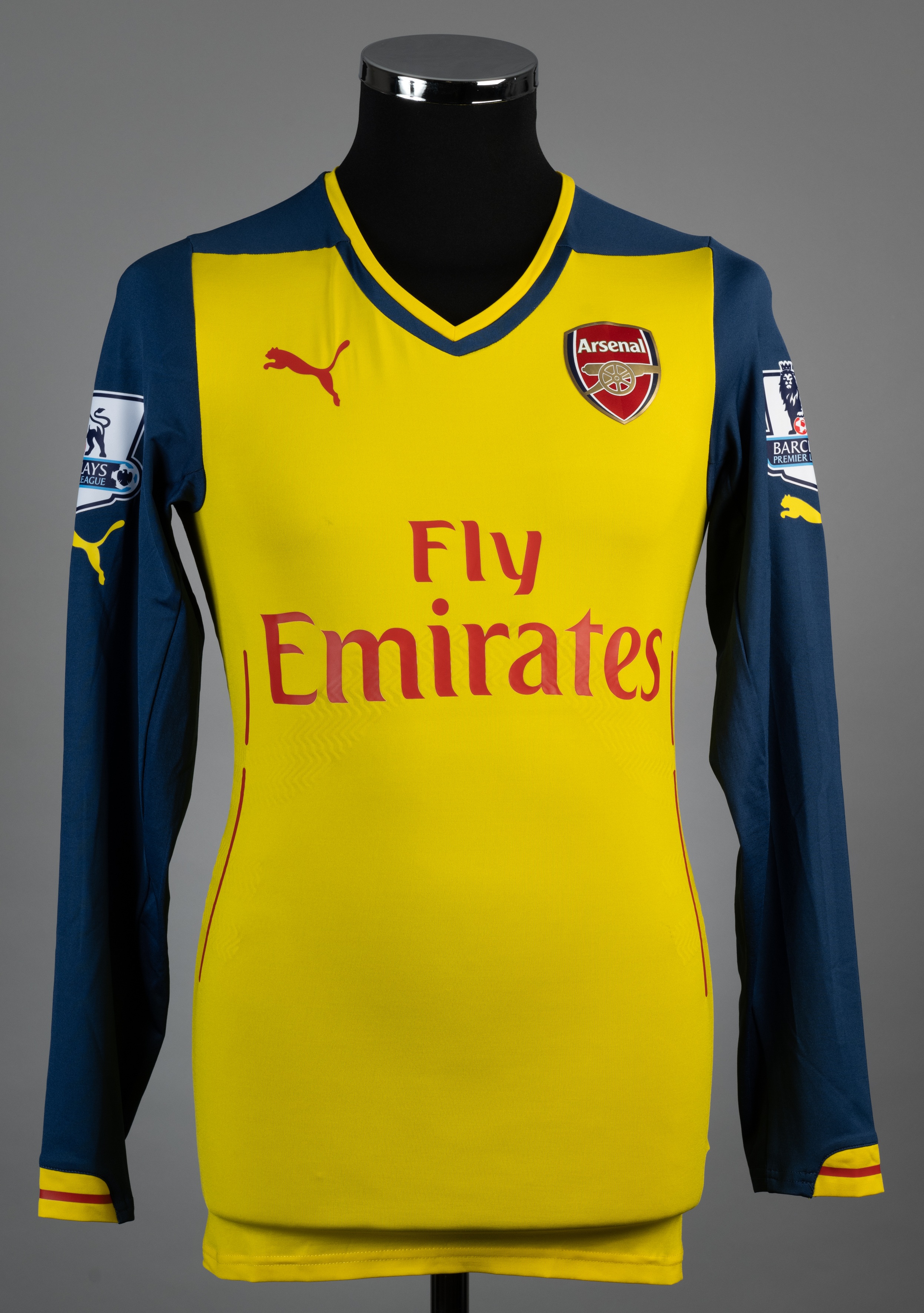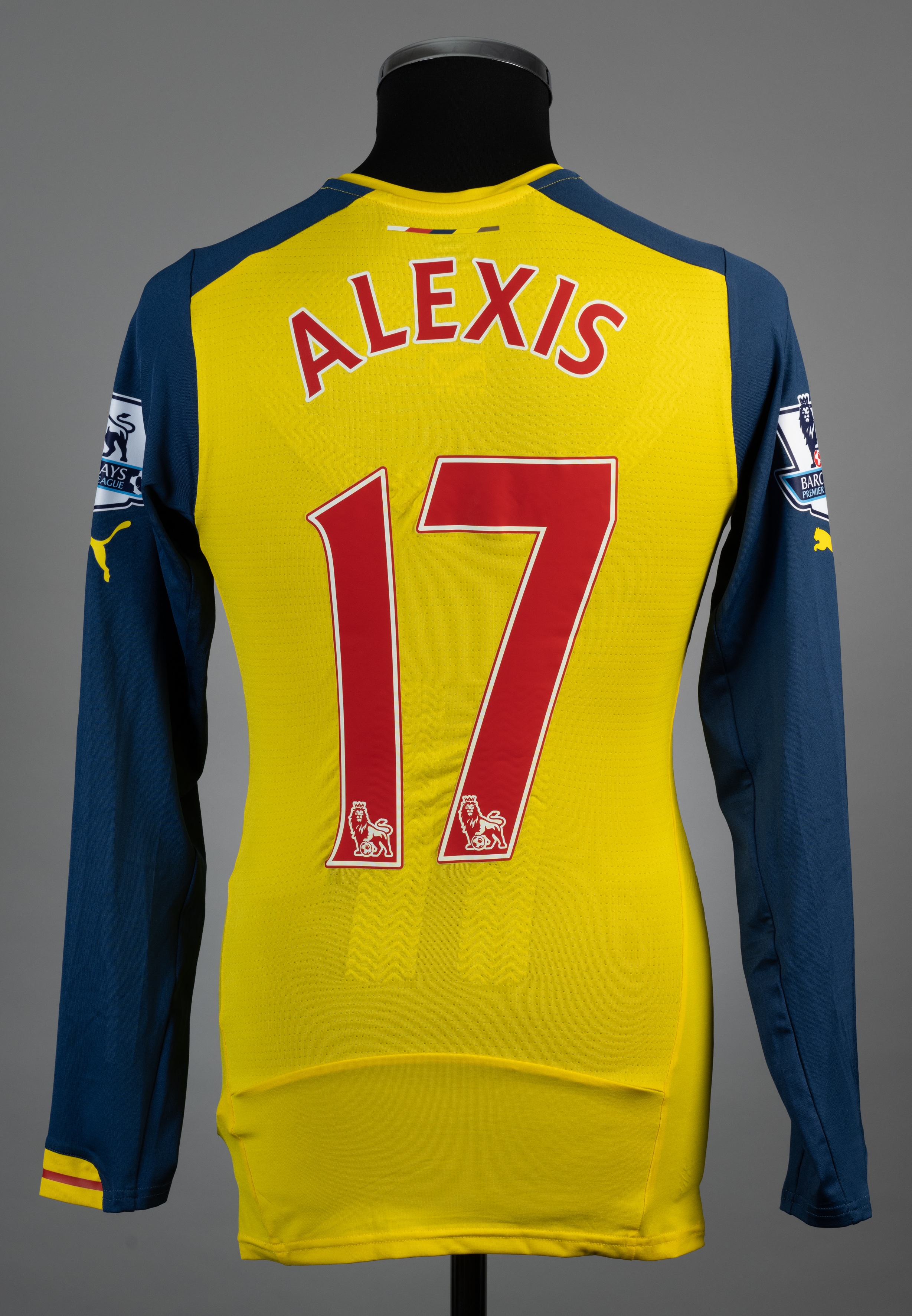 Alexis Sanchez yellow and blue No.17 Arsenal v Liverpool long-sleeved match worn jersey, 2014-15, Puma, M, with v-neck collar and printed badge, the reverse lettered ALEXIS, the sleeves with Barclays Premier League flashes The above jersey was worn by Alexis Sanchez in the match against Liverpool played on 2nd December 2014 at Anfield, the match ending in a 2-2 draw. The auction proceeds for this lot are being donated to the "Shirts For Shakey" Appeal. This is a crowdfunding appeal on behalf of the esteemed football shirt collector, researcher and author Simon "Shakey" Shakeshaft and his wife Tracey in their hour of need. The initiative has been organised by the eminent shirt collectors Stephen Plant, Neville Evans and Daren Burney and is being supported by the football shirt collecting community at large. Graham Budd Auctions is pleased to have been appointed as auctioneer for the Appeal and has waived its seller's commission for this lot. More information about the Appeal can be found on the the Just Giving page: https://www.justgiving.com/crowdfunding/stephen-plant-3