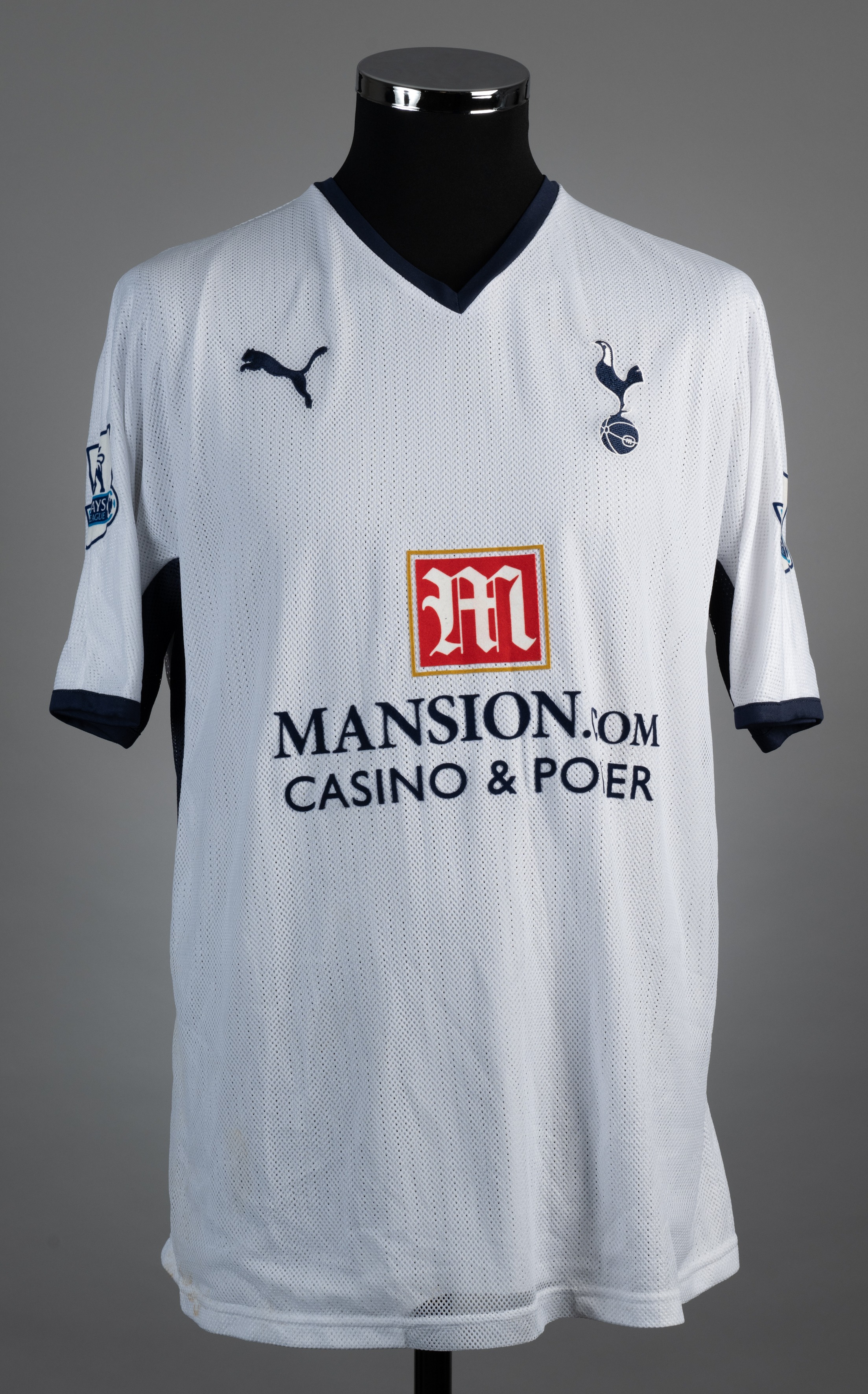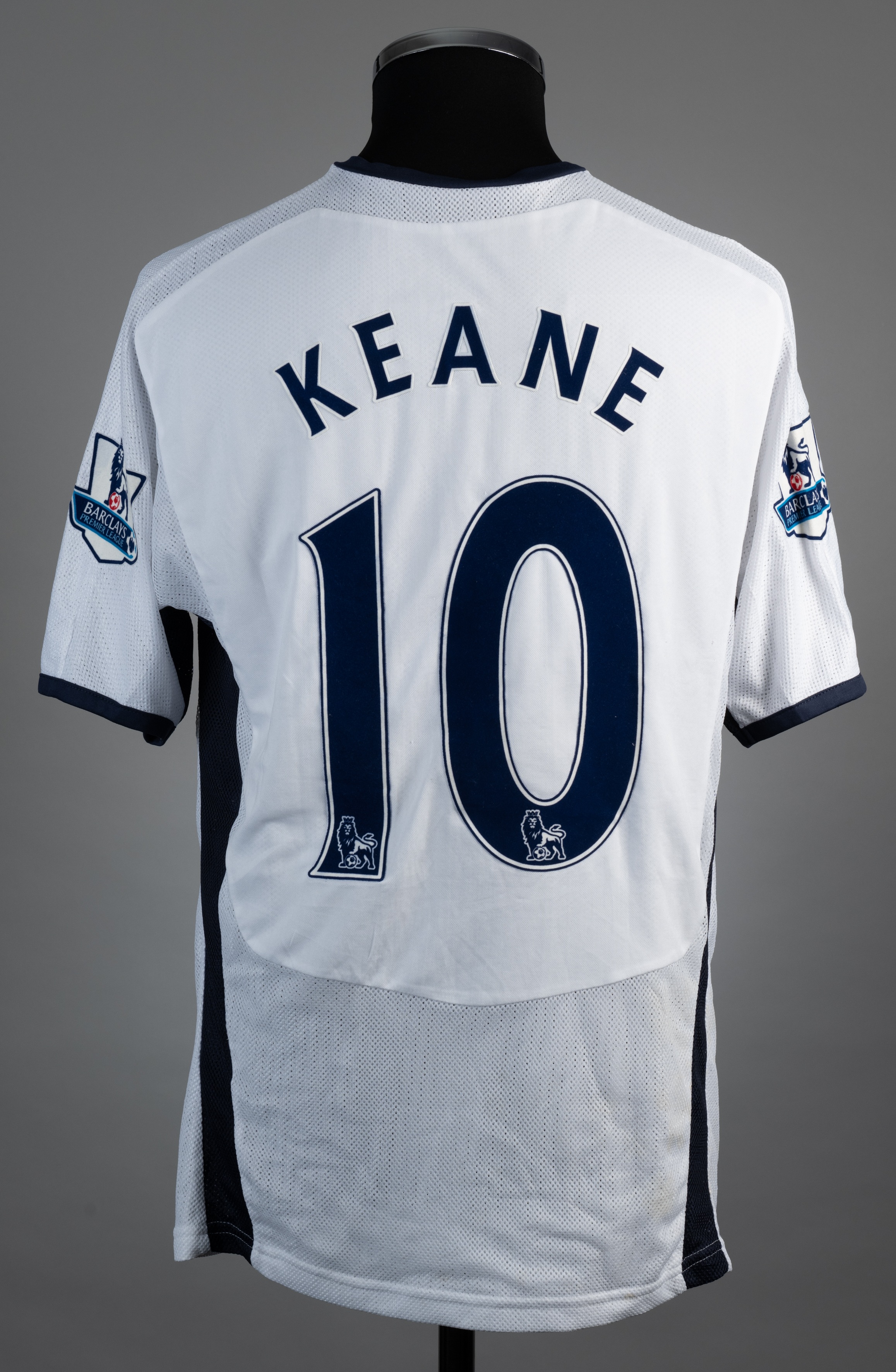 Robbie Keane white and blue No.10 Tottenham Hotspur short-sleeved jersey, 2008-09, Puma, L, with v-neck collar and embroidered cloth badge, the reverse lettered KEANE, the sleeves with Barclays Premier League flashes The above jersey was worn in a match during the 2008-09 season The auction proceeds for this lot are being donated to the "Shirts For Shakey" Appeal. This is a crowdfunding appeal on behalf of the esteemed football shirt collector, researcher and author Simon "Shakey" Shakeshaft and his wife Tracey in their hour of need. The initiative has been organised by the eminent shirt collectors Stephen Plant, Neville Evans and Daren Burney and is being supported by the football shirt collecting community at large. Graham Budd Auctions is pleased to have been appointed as auctioneer for the Appeal and has waived its seller's commission for this lot. More information about the Appeal can be found on the the Just Giving page: https://www.justgiving.com/crowdfunding/stephen-plant-3