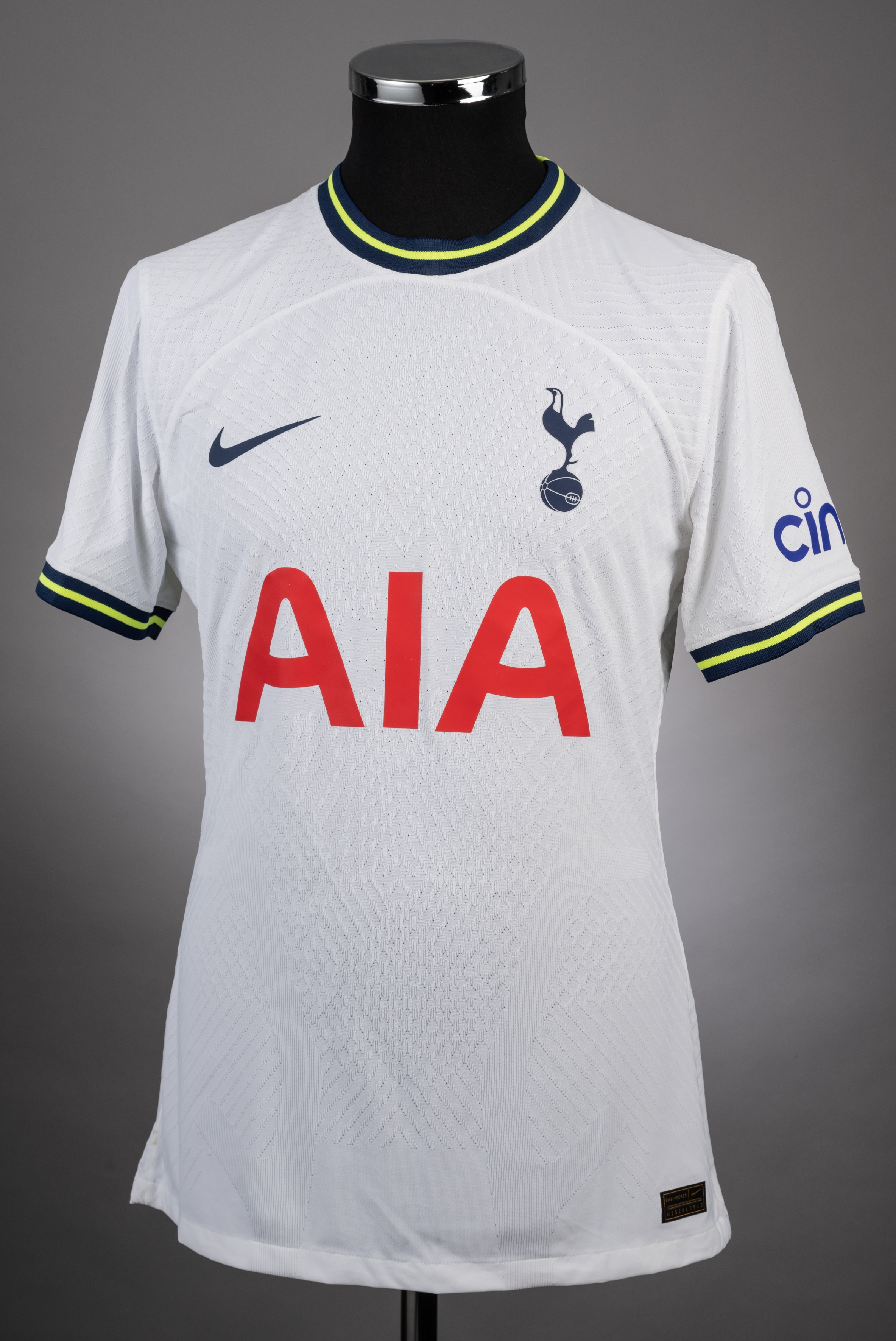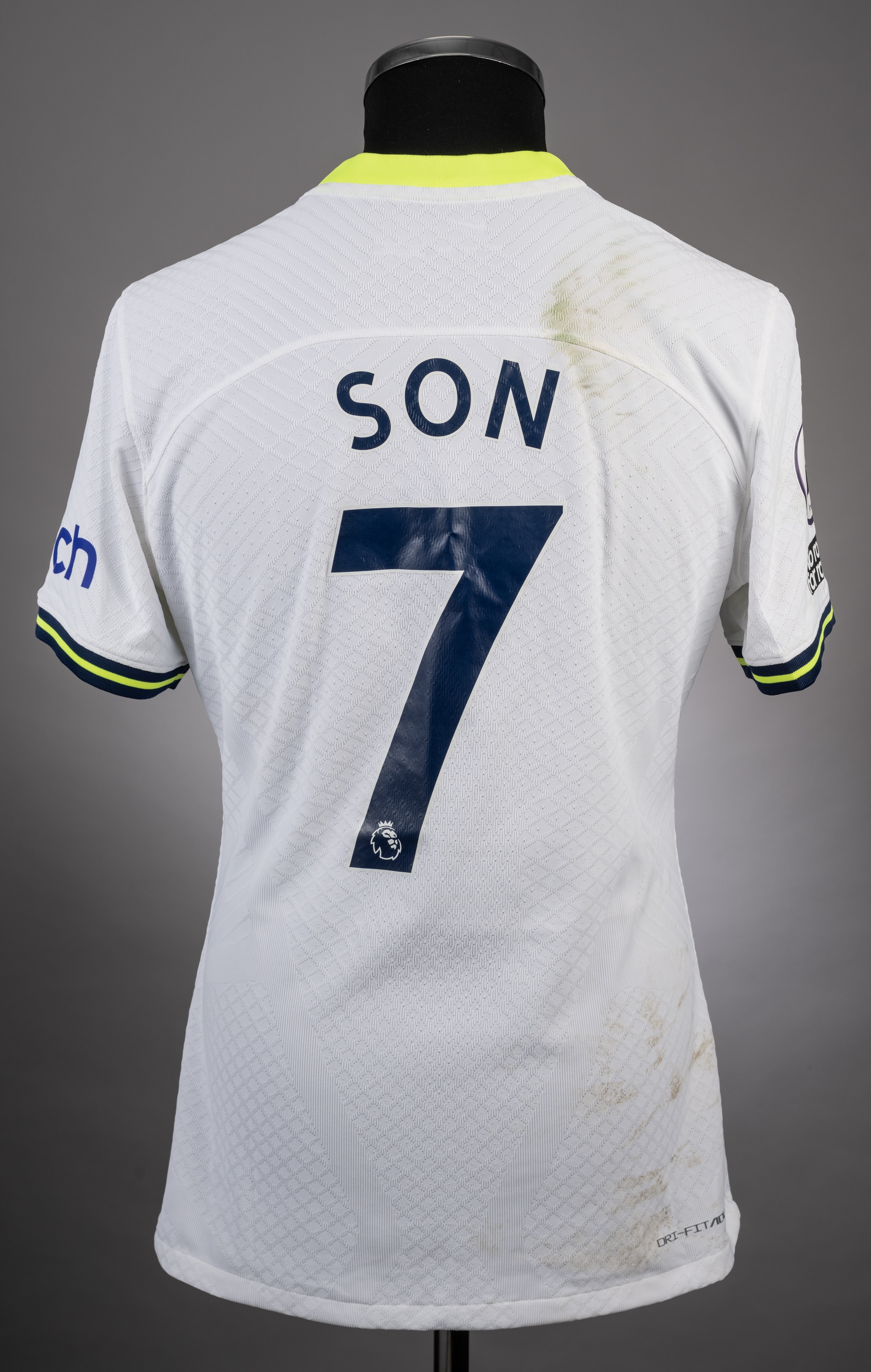 Son Heung-min white Tottenham Hotspur No.7 jersey v Wolverhampton Wanderers, played at White Hart Lane, 20th August 2022, match-worn, Nike, short-sleeved with PREMIER LEAGUE, NO ROOM FOR RACISM, CLINCH sleeve badges, club crest and sponsor logo, reverse lettered SON, size M, with letter of authenticity from Darren Burney co-author of 'The Spurs Shirt' book Jersey bears pitch marks and stains The auction proceeds for this lot are being donated to the "Shirts For Shakey" Appeal. This is a crowdfunding appeal on behalf of the esteemed football shirt collector, researcher and author Simon "Shakey" Shakeshaft and his wife Tracey in their hour of need. The initiative has been organised by the eminent shirt collectors Stephen Plant, Neville Evans and Daren Burney and is being supported by the football shirt collecting community at large. Graham Budd Auctions is pleased to have been appointed as auctioneer for the Appeal and has waived its seller's commission for this lot. More information about the Appeal can be found on the the Just Giving page: https://www.justgiving.com/crowdfunding/stephen-plant-3