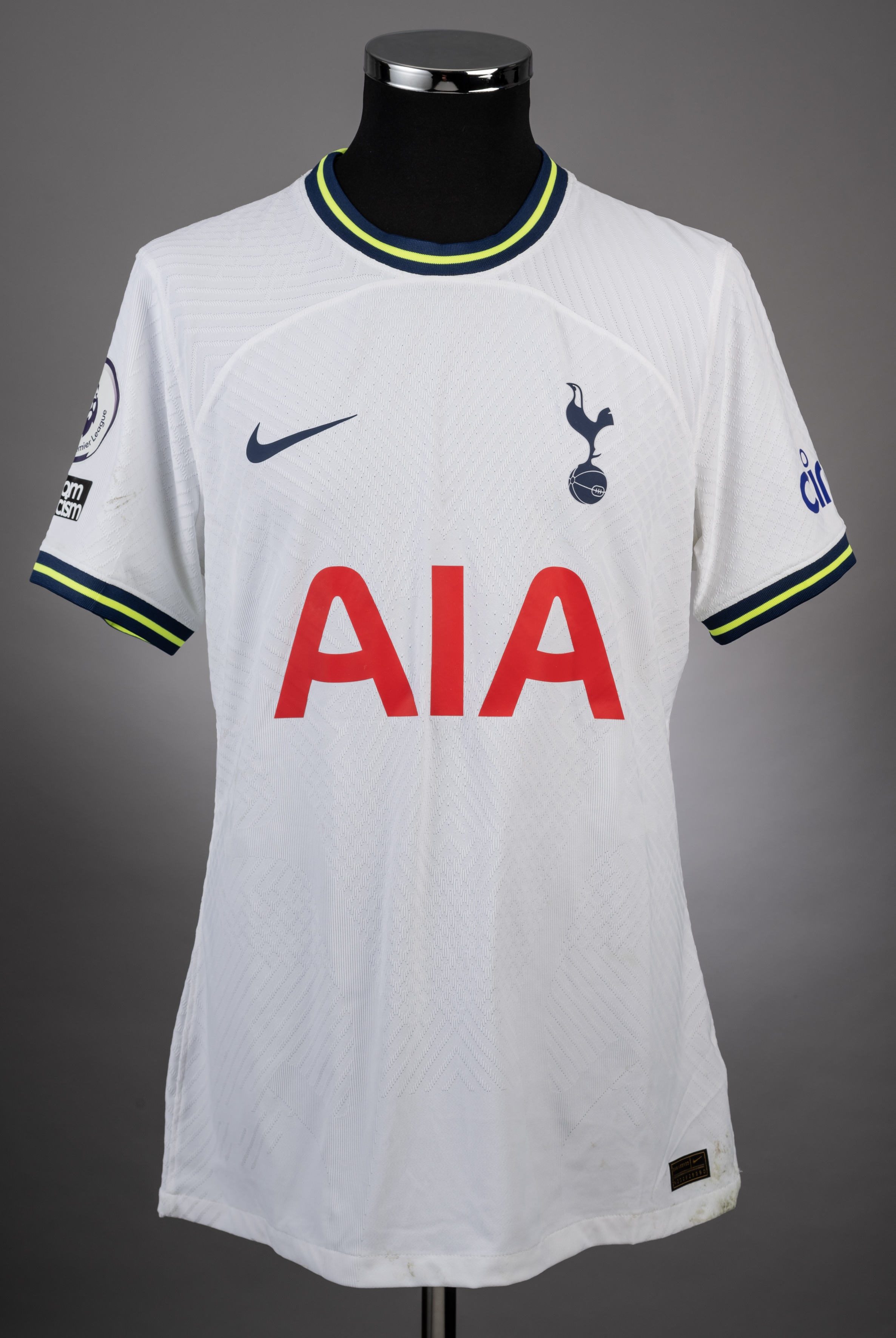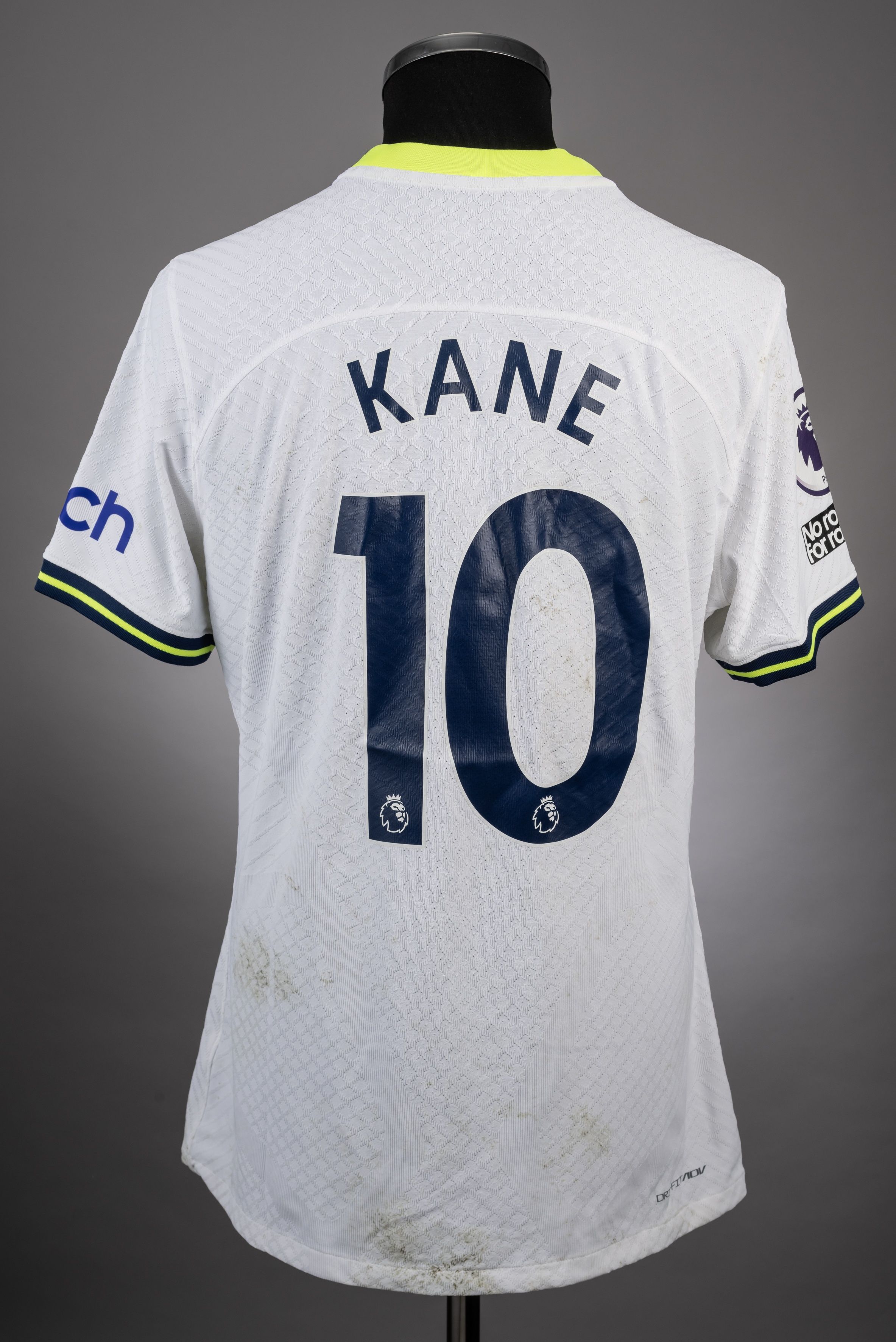 Harry Kane white Tottenham Hotspur no.10 jersey v Aston Villa, played at Tottenham Hotspur Stadium, 1st January 2023, match-worn, Nike, short-sleeved with PREMIER LEAGUE, NO ROOM FOR RACISM, CINCH sleeve badges, club crest and sponsor logo, reverse lettered KANE, size L, sold with letter of authenticity from Daren Burney co-author of 'The Spurs Shirt' book Jersey bears pitch marks The auction proceeds for this lot are being donated to the "Shirts For Shakey" Appeal. This is a crowdfunding appeal on behalf of the esteemed football shirt collector, researcher and author Simon "Shakey" Shakeshaft and his wife Tracey in their hour of need. The initiative has been organised by the eminent shirt collectors Stephen Plant, Neville Evans and Daren Burney and is being supported by the football shirt collecting community at large. Graham Budd Auctions is pleased to have been appointed as auctioneer for the Appeal and has waived its seller's commission for this lot. More information about the Appeal can be found on the the Just Giving page: https://www.justgiving.com/crowdfunding/stephen-plant-3