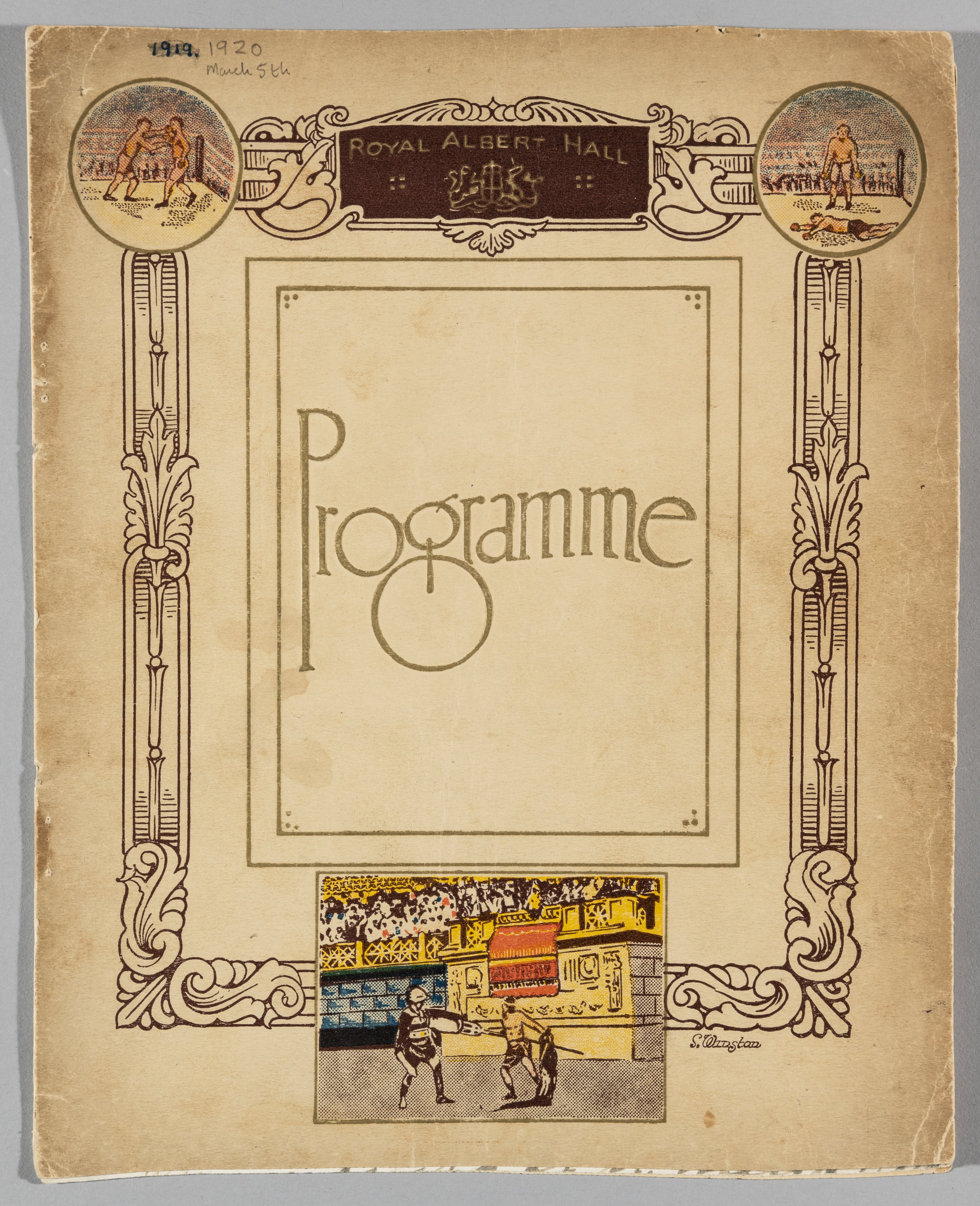 Joe Beckett v. Dick Smith Championship of Great Britain boxing programme, 5th March 1920, the inside cover autographed and annotated by Dick Smith at The Royal Albert Hall Some pen and Ink text on cover and covers stained front and back and at edges
