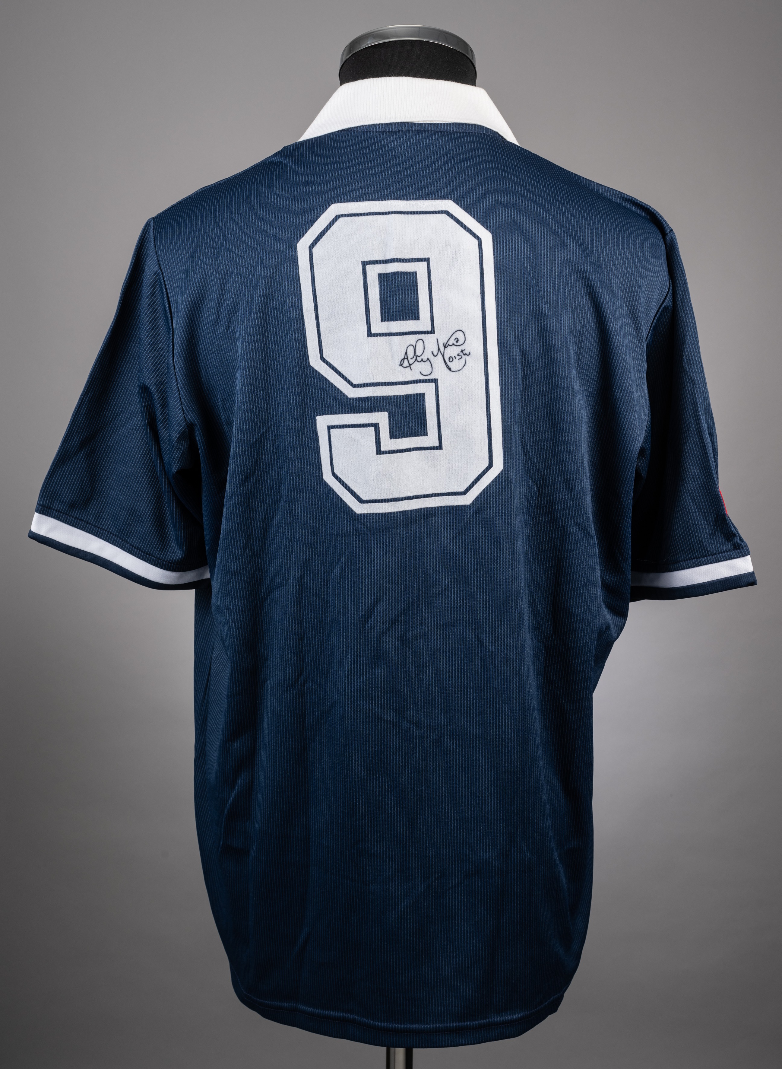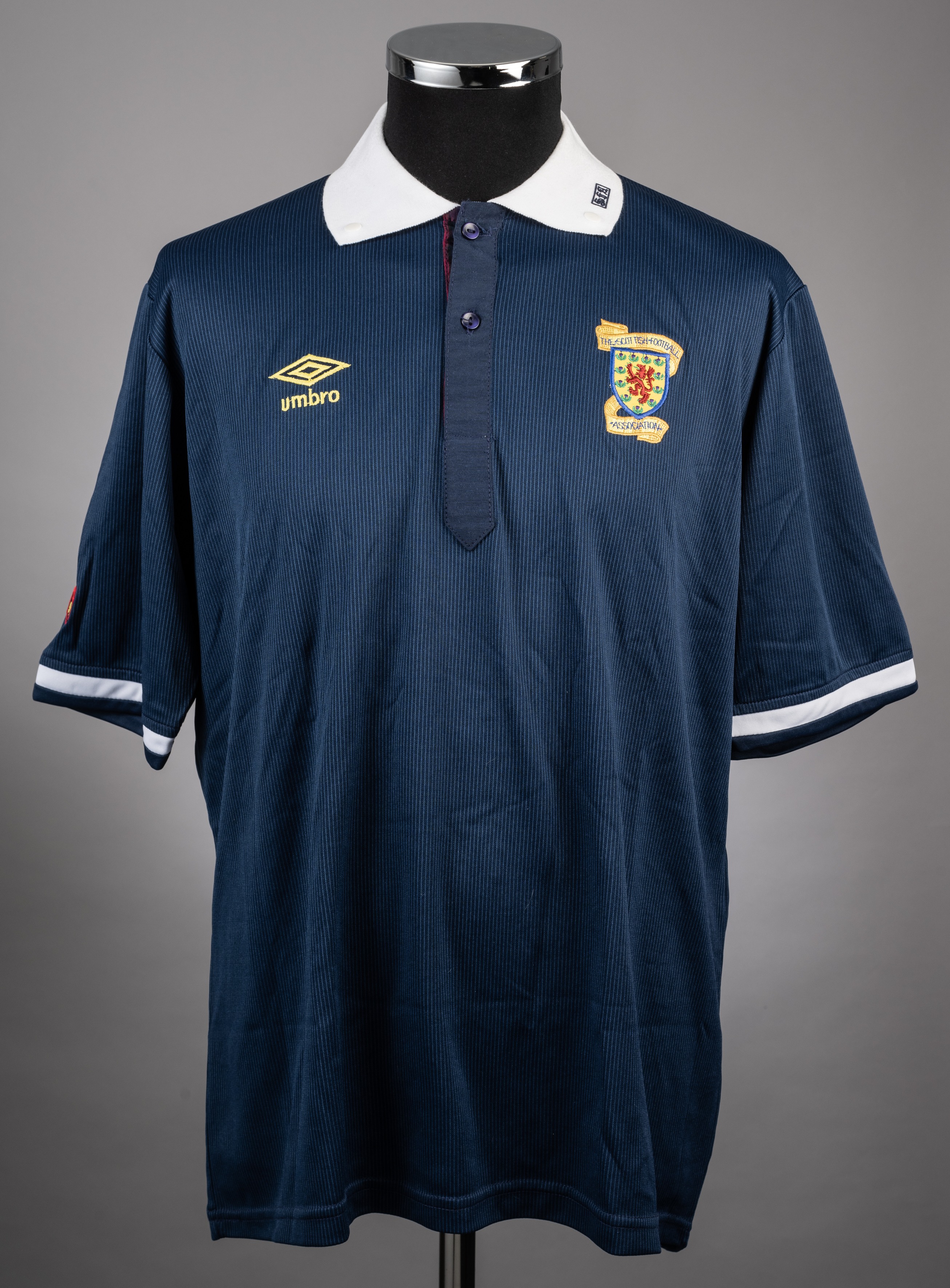 Ally McCoist blue No.9 Scotland v. Poland International short-sleeved jersey, Umbro, L, with button-up collar and embroidered badge inscribed THE SCOTTISH FOOTBALL ASSOCIATION, the right sleeve and collar embroidered SFA8, the reverse autographed by Ally McCoist, the interior Umbro label with handwritten P The above jersey was worn by Ally McCoist in the Scotland v. Poland Friendly International played on 19th April 1990 at Hampden Park, the match ending in a 1-1 draw, the vendor won the shirt in a competition after the match