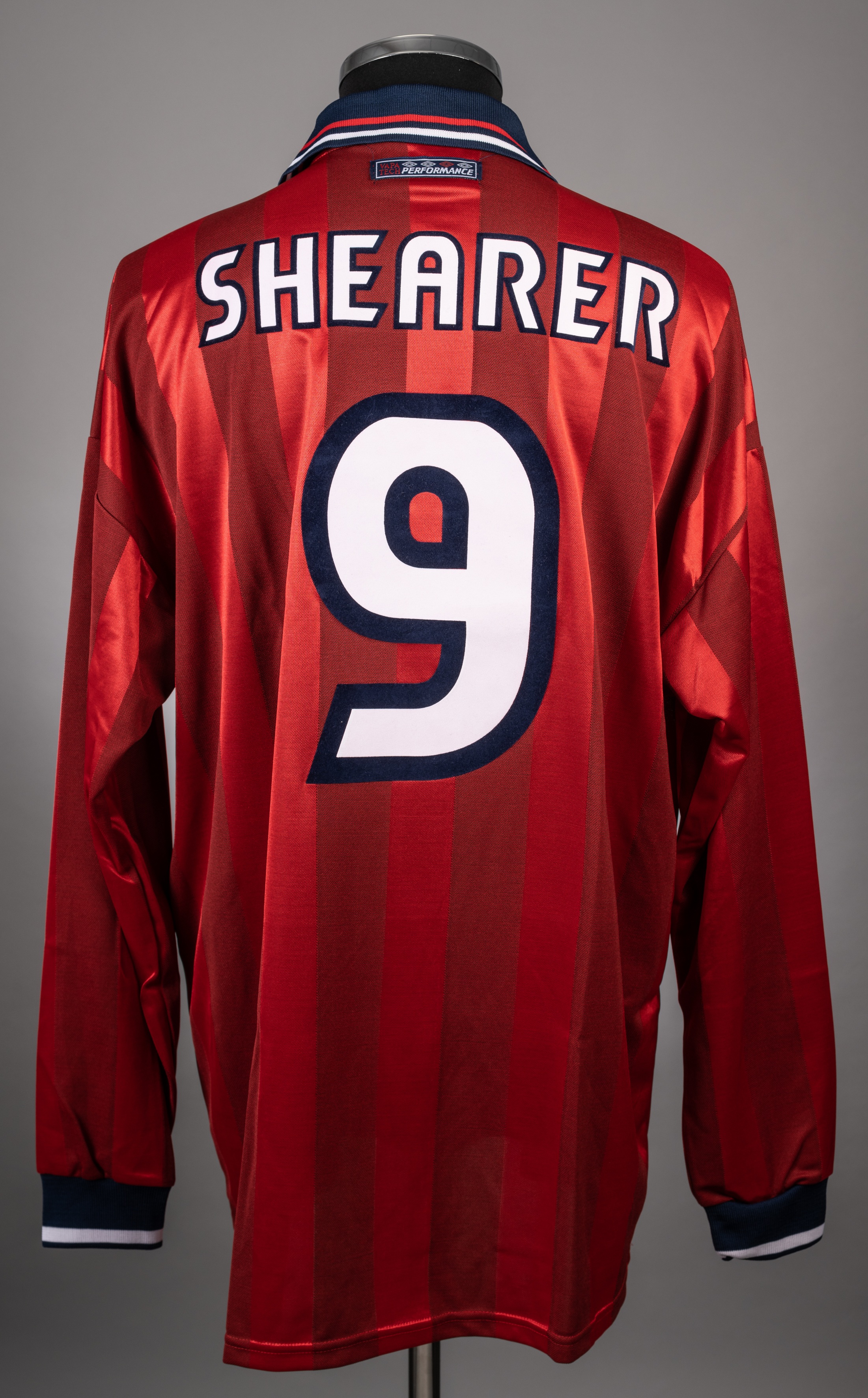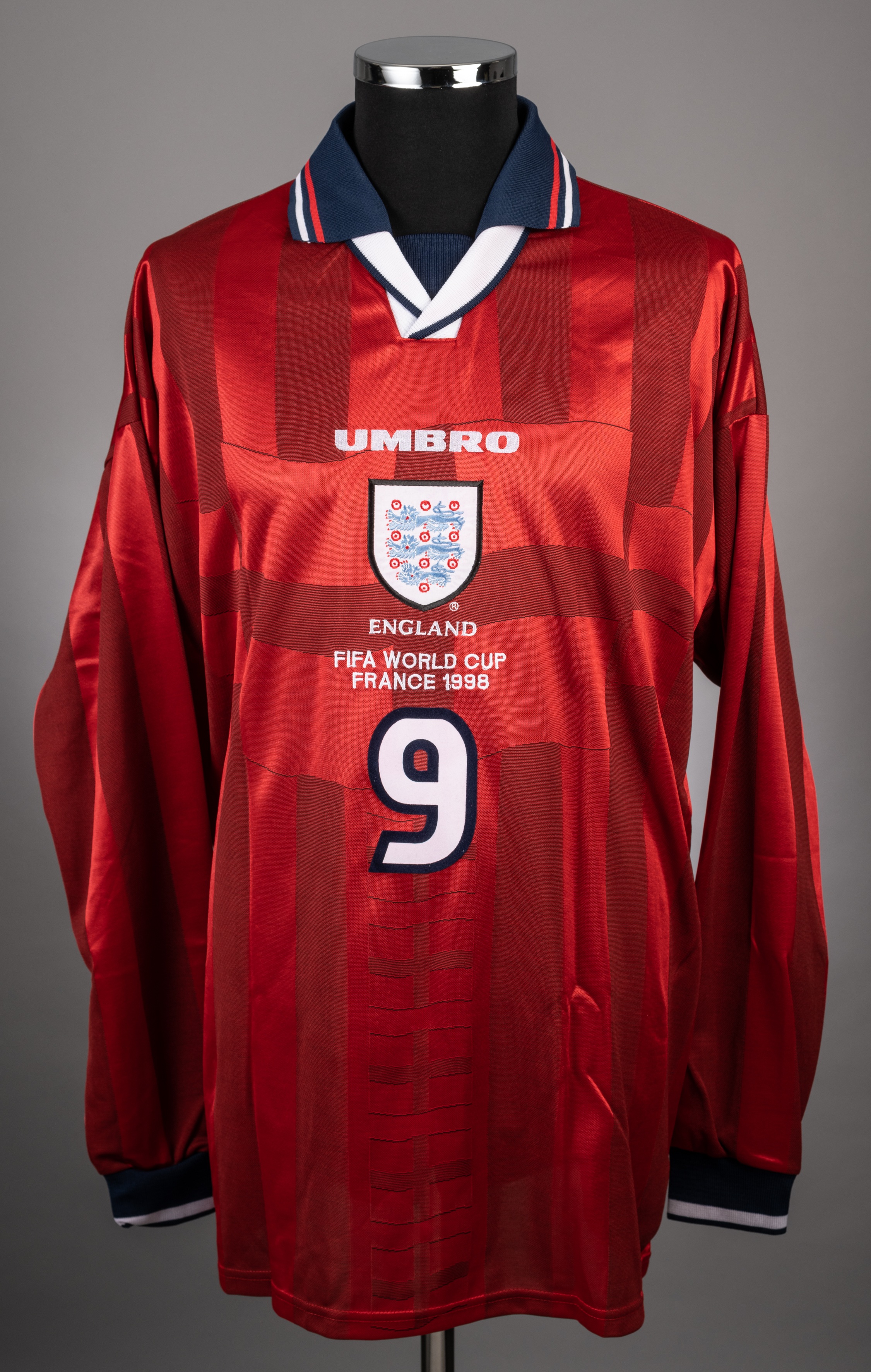 Alan Shearer red No.9 England 1998 World Cup long-sleeved jersey, Umbro, XL, with v-neck collar and embroidered three lion cloth badge inscribed ENGLAND FIFA WORLD CUP FRANCE 1998, the reverse lettered SHEARER