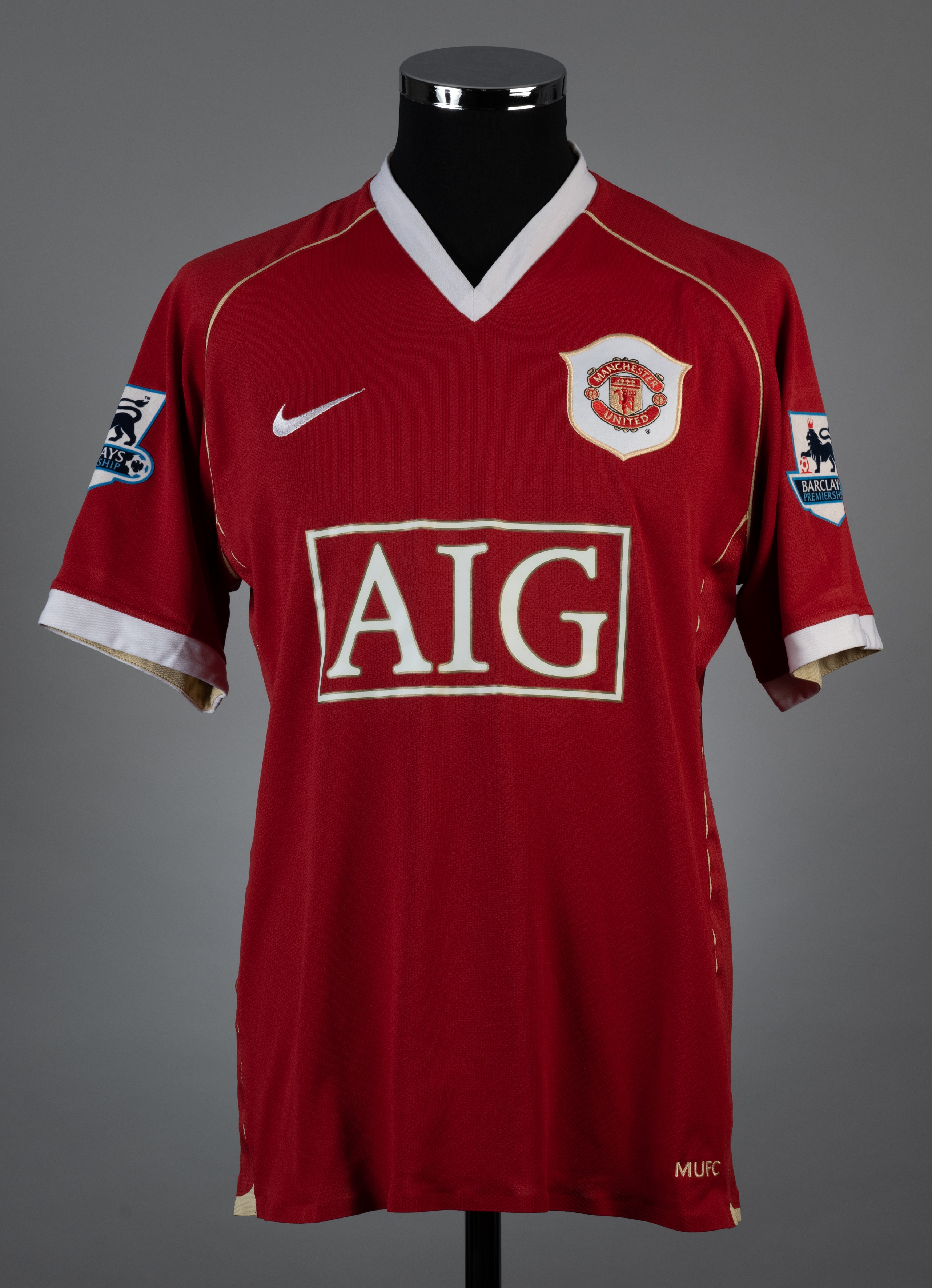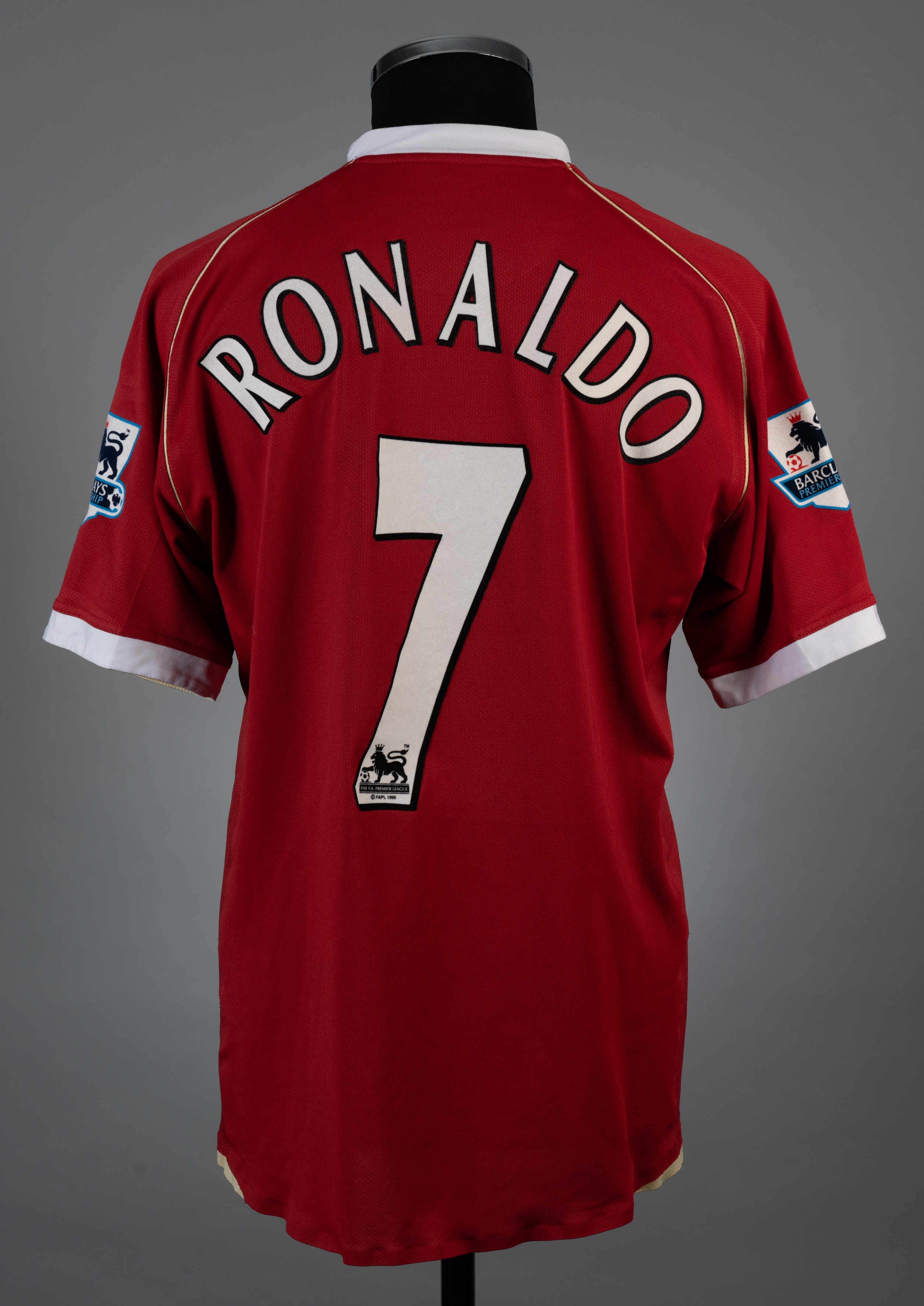 Cristiano Ronaldo red and white No.7 Manchester United match worn short-sleeved jersey, 2006-07, Nike, L, with v-neck collar and embroidered cloth badge inscribed MANCHESTER UNITED, the reverse lettered RONALDO, the sleeves with Barclays Premiership flashes with signed letter of authenticity from Simone Macheda brother of former Kiko Macheda stating that the shirt was given to Kiko by Ronaldo as a match worn example (2)