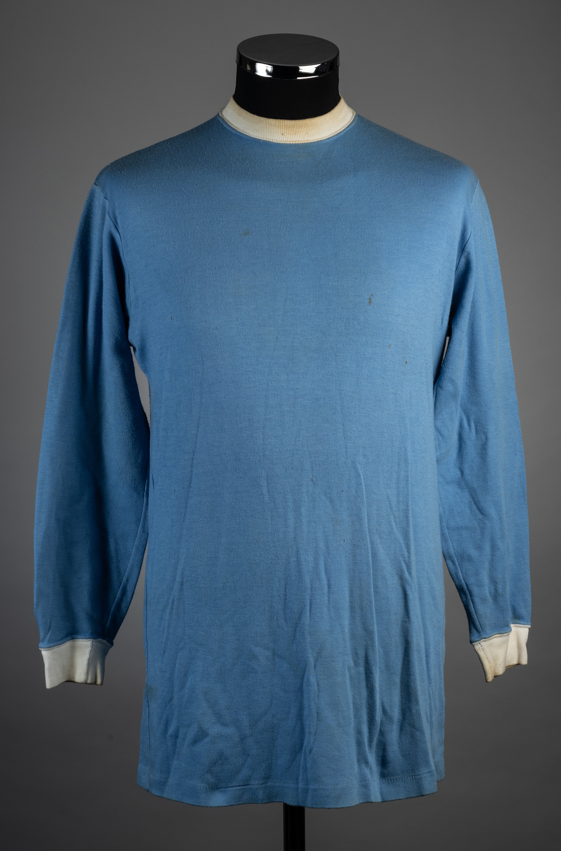 Sky blue Manchester City no.13 substitutes jersey, late 1960s, Umbro, long-sleeved with white crew neck collar and cuffs, numbered to reverse, bearing marks and stains, yellowing to collar and cuffs, no size visible