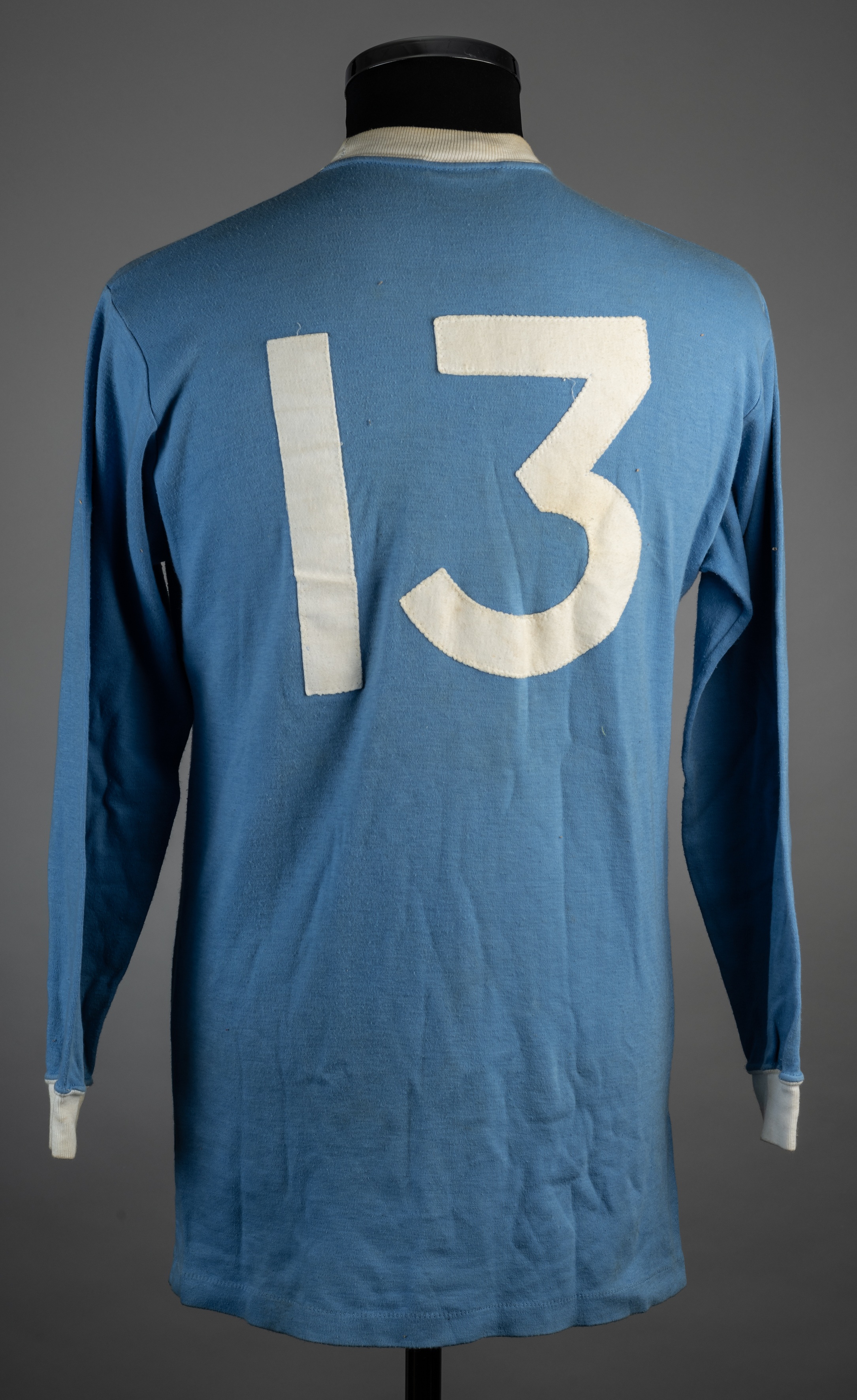 Sky blue Manchester City no.13 substitutes jersey, late 1960s, Umbro, long-sleeved with white crew neck collar and cuffs, numbered to reverse, bearin
