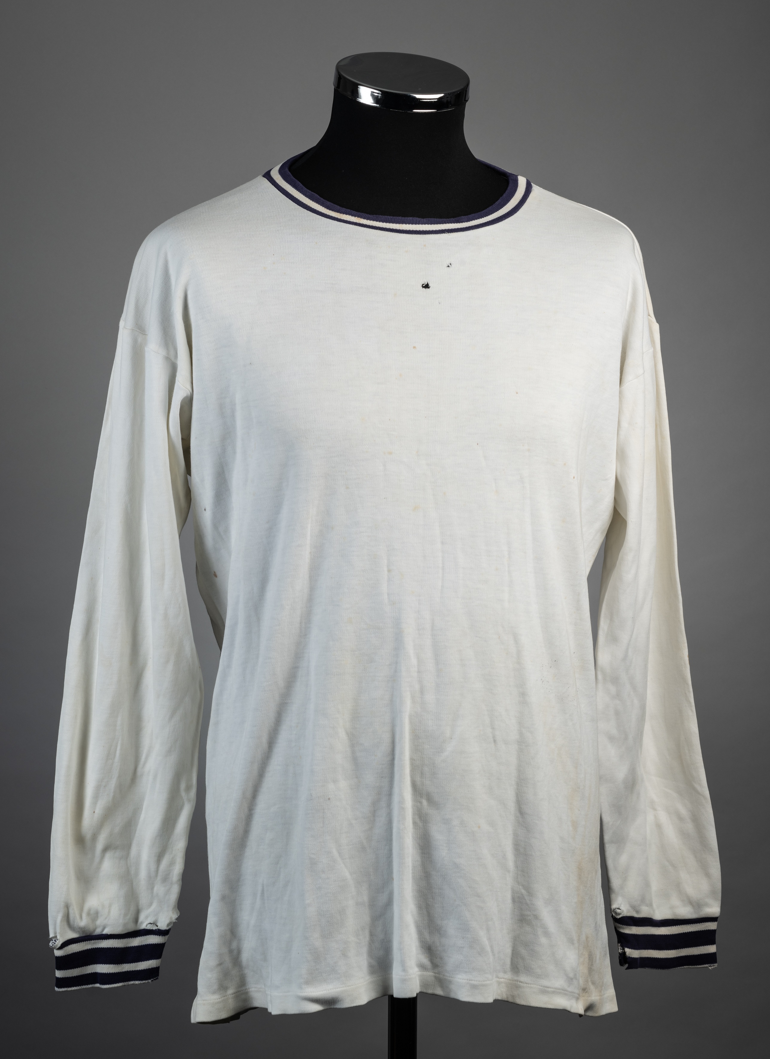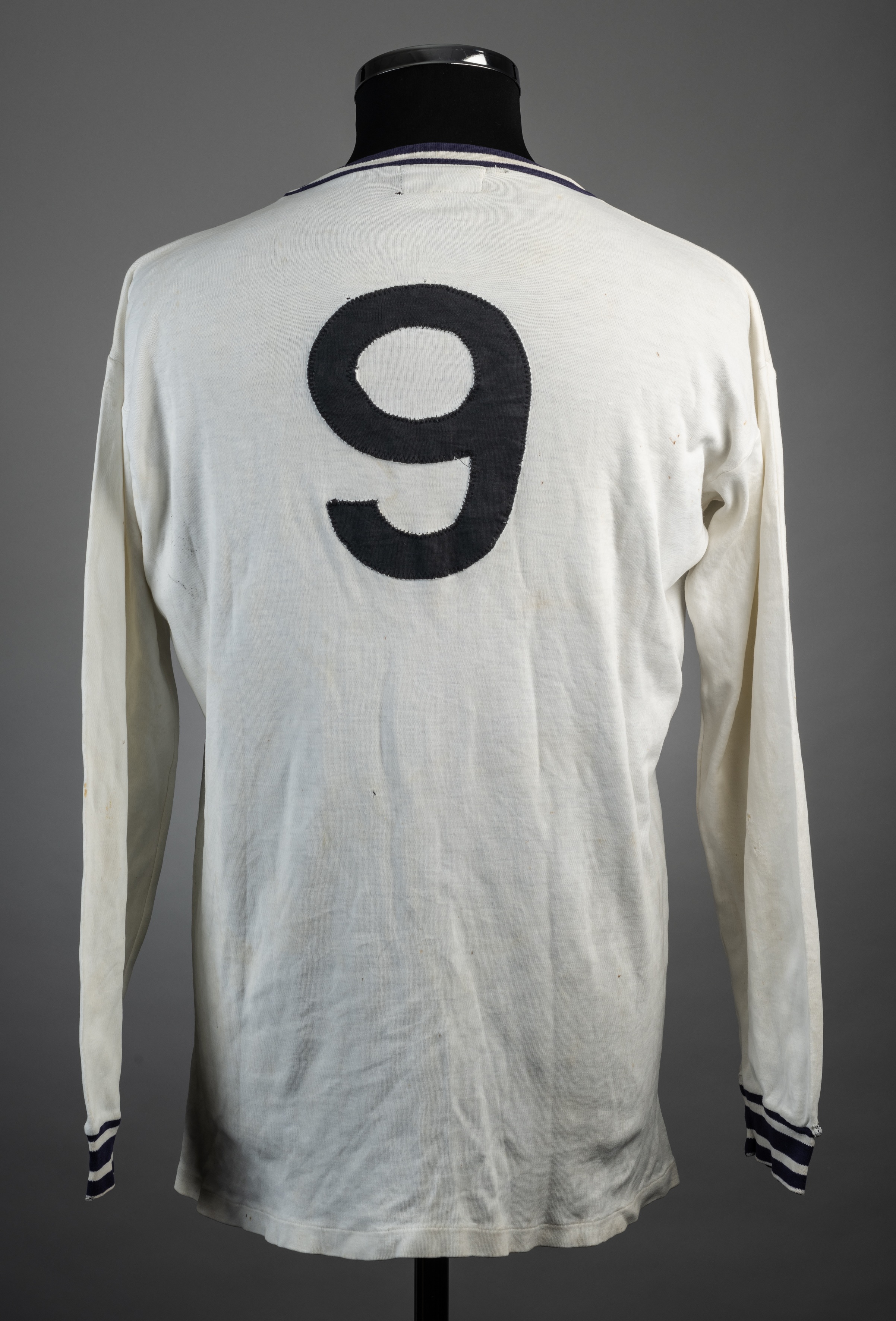 White Bolton Wanderers no.9 jersey, lates 1960s, Bukta, long-sleeved with blue hoops to crew neck collar and cuffs, reverse numbered 9 Some small holes and staining