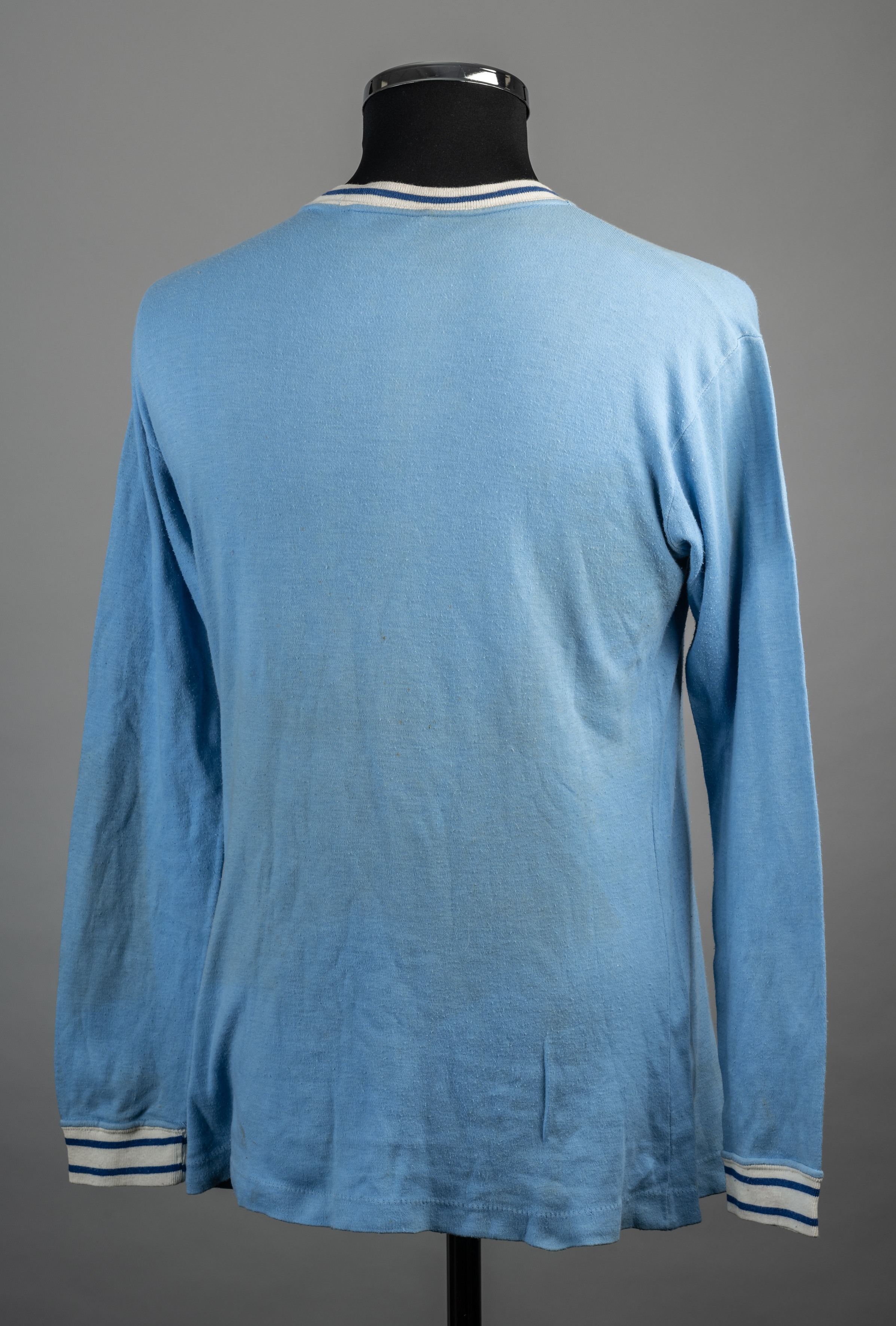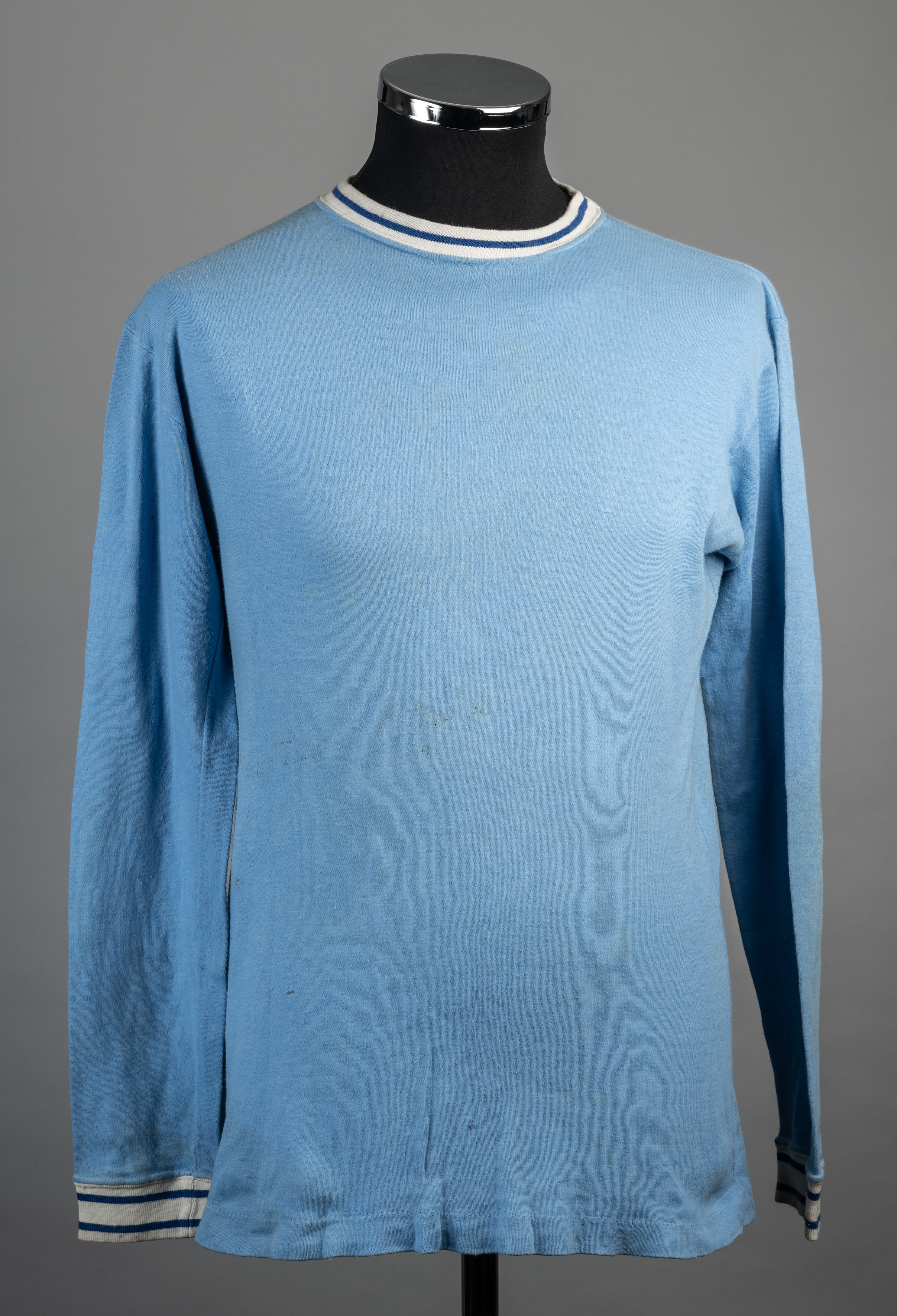 Sky blue Coventry City jersey, late 1960s, Umbro, un-numbered, long-sleeved, blue hooped crew neck collar and cuffs Stains to front