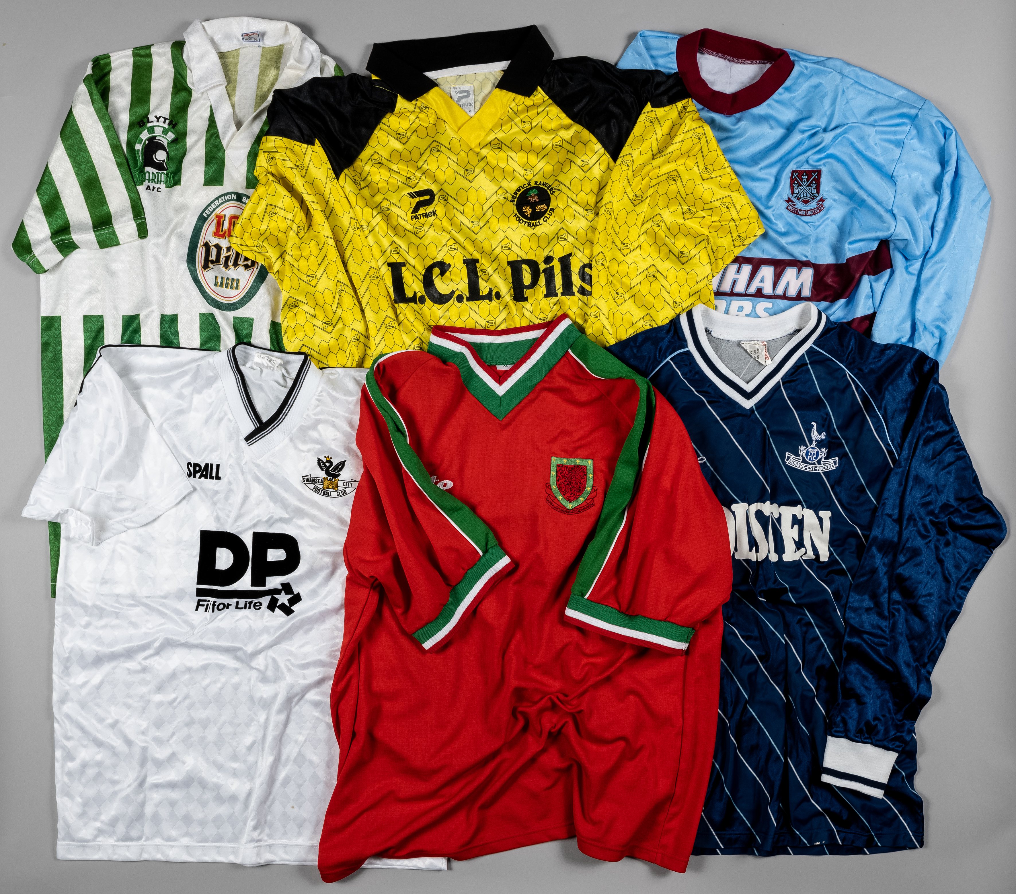 Collection of 14 vintage replica British football jerseys, Nottingham Forest, Blyth Spartans, Altrincham, Berwick Rangers, Spennymoor United, Preston North End, Swansea City, Ipswich Town, Tottenham Hotspur, Gillingham, West Ham United, Wickham Wanderers, and two Wales international jerseys, sold together with a pair of blue football shorts, (15)