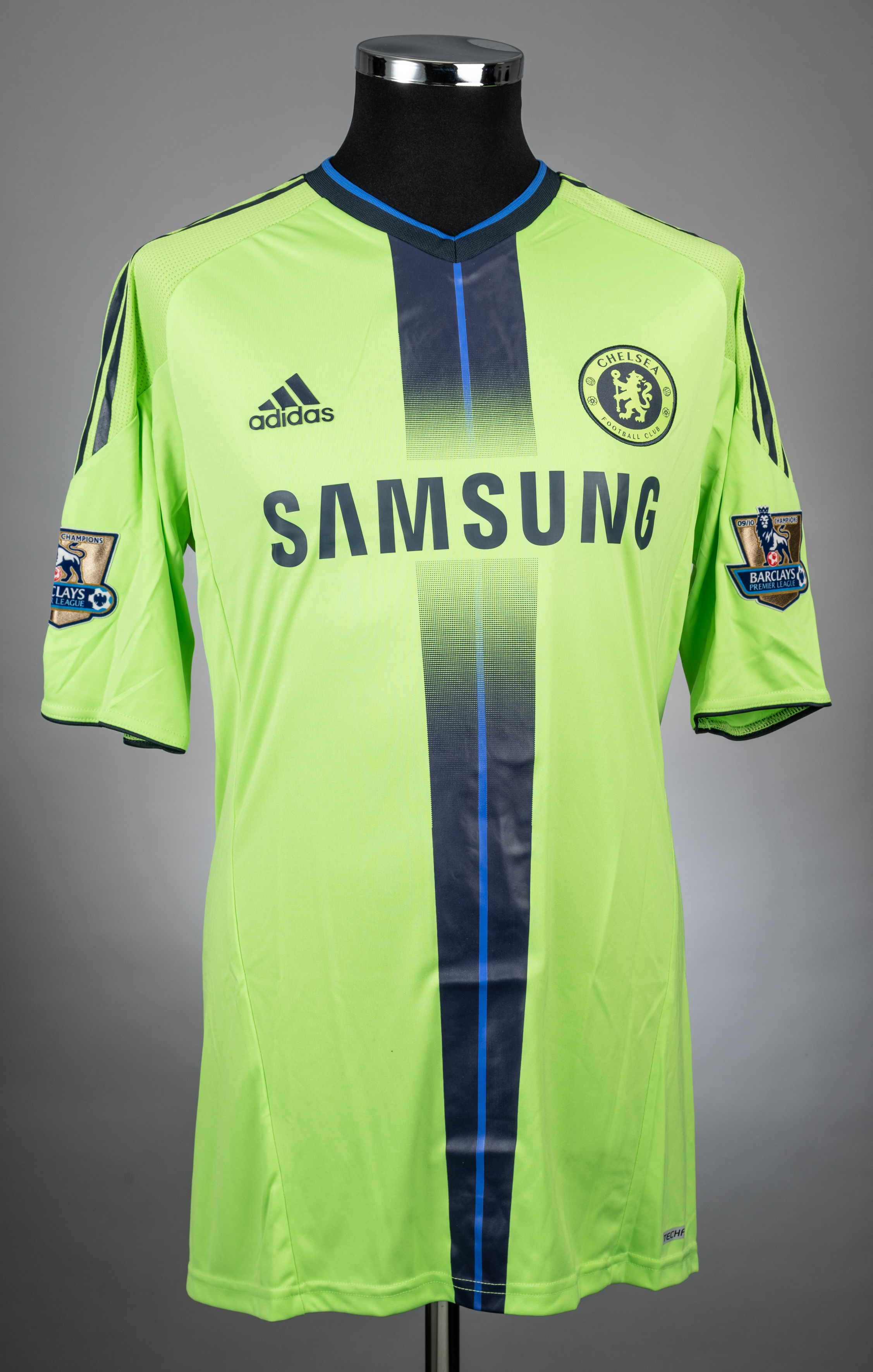 Rare David Luiz green and blue No.4 Chelsea short-sleeved jersey 2010-11, 3rd kit, Adidas, XL, with v-neck collar and embroidered cloth badge inscri