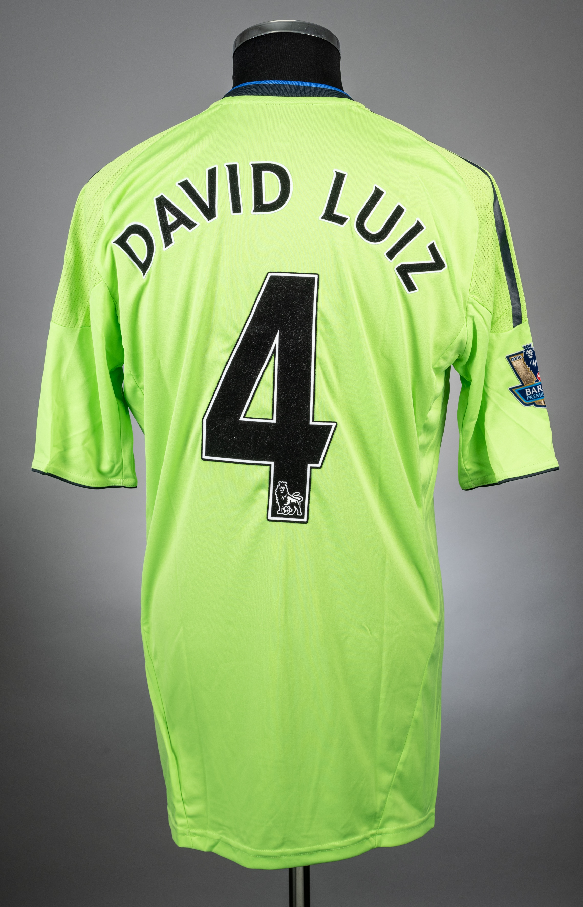 Rare David Luiz green and blue No.4 Chelsea short-sleeved jersey 2010-11, 3rd kit, Adidas, XL, with v-neck collar and embroidered cloth badge inscribed CHELSEA FOOTBALL CLUB, the reverse lettered David Luiz, the sleeves with Barclays Premier League 2009-10 Champions flashes