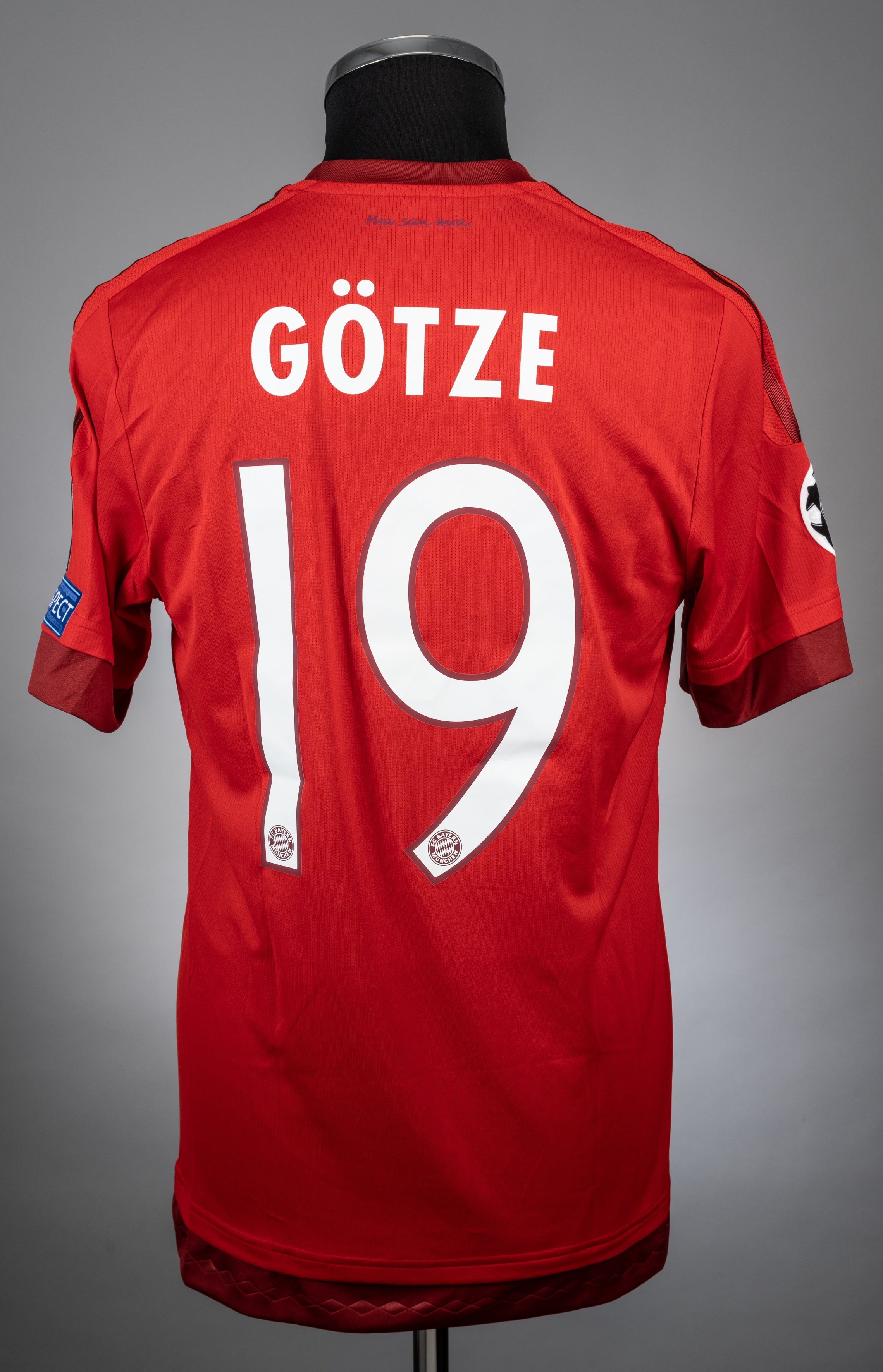 Mario Gotze red No.19 Bayern Munich Champions League short-sleeved jersey, 2015-16, Adidas, with crew-neck collar and printed badge FC BAYERN MUNCHEN, the reverse lettered GOTZE, the sleeves with Champions League flashes