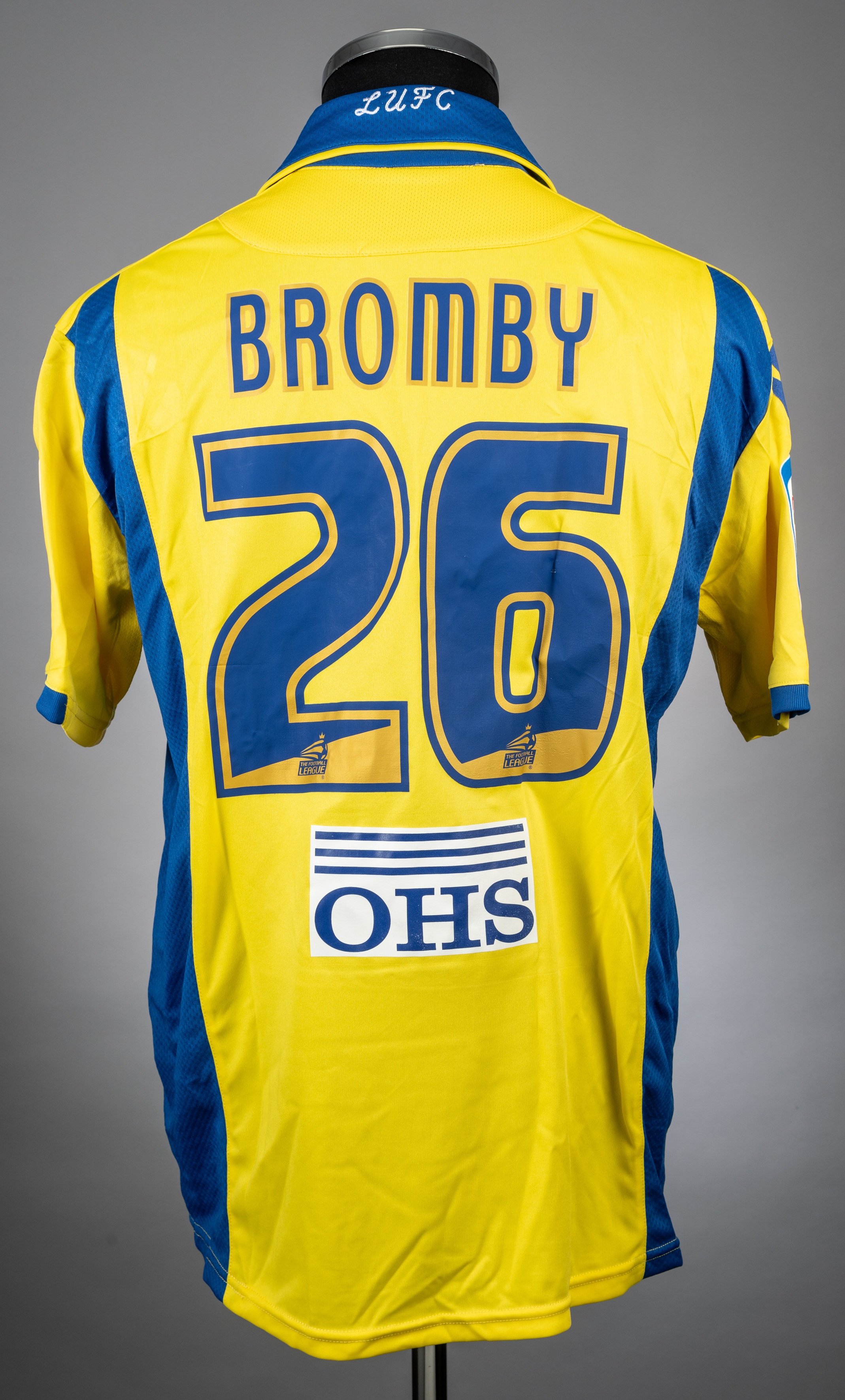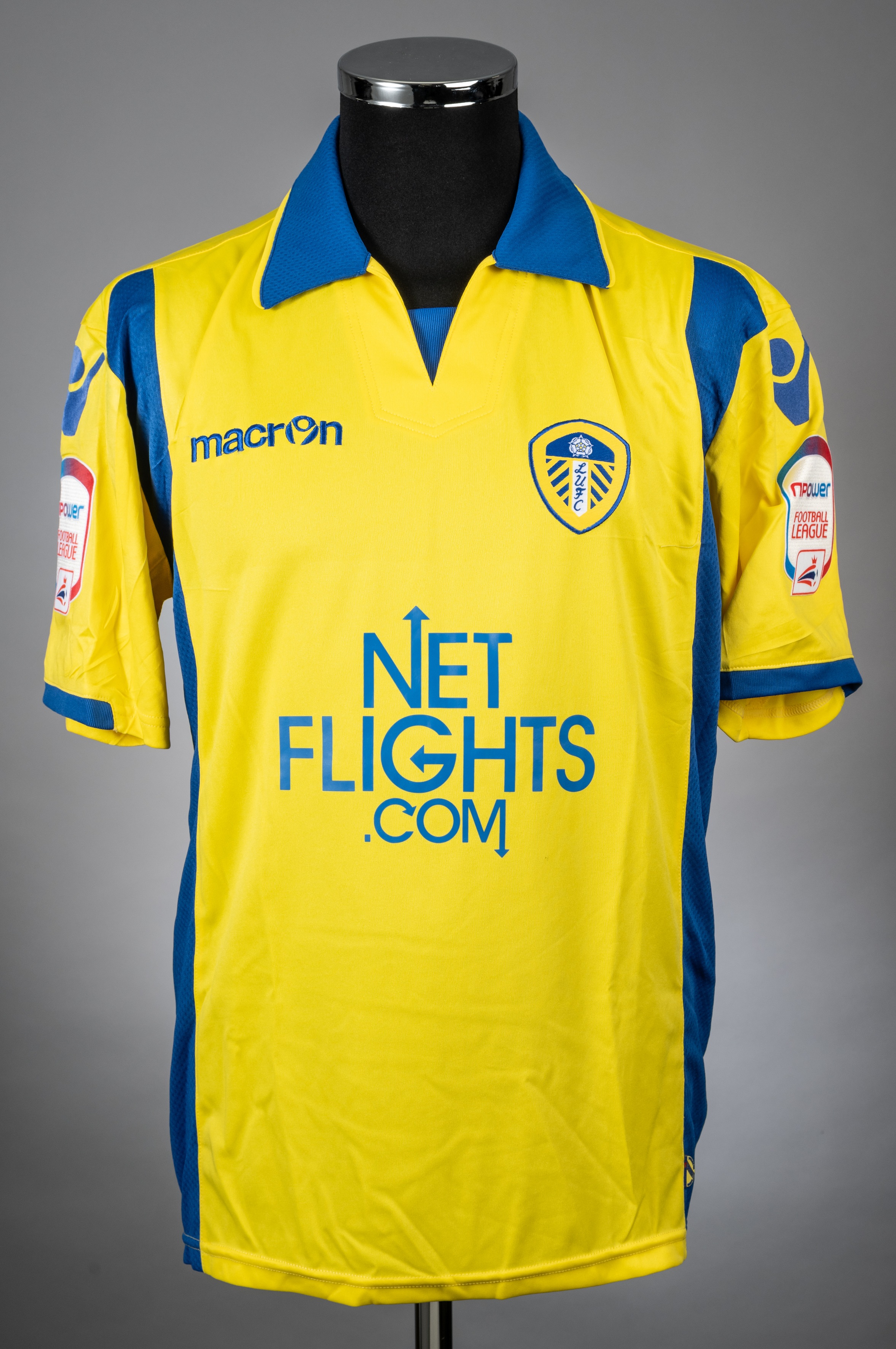 Leigh Bromby yellow & blue No.26 Leeds United v. Tottenham Hotspur F.A. Cup short-sleeved jersey, 2009-10, Macron, S, with v-neck collar and embroidered cloth badge inscribed LUFC, the reverse lettered BROMBY, the sleeves with NPOWER Football League flashes The above jersey was worn by Leigh Bromby in the F.A.Cup match against Tottenham Hotspur played on 23rd January 1910, the match ending in a 2-2 draw