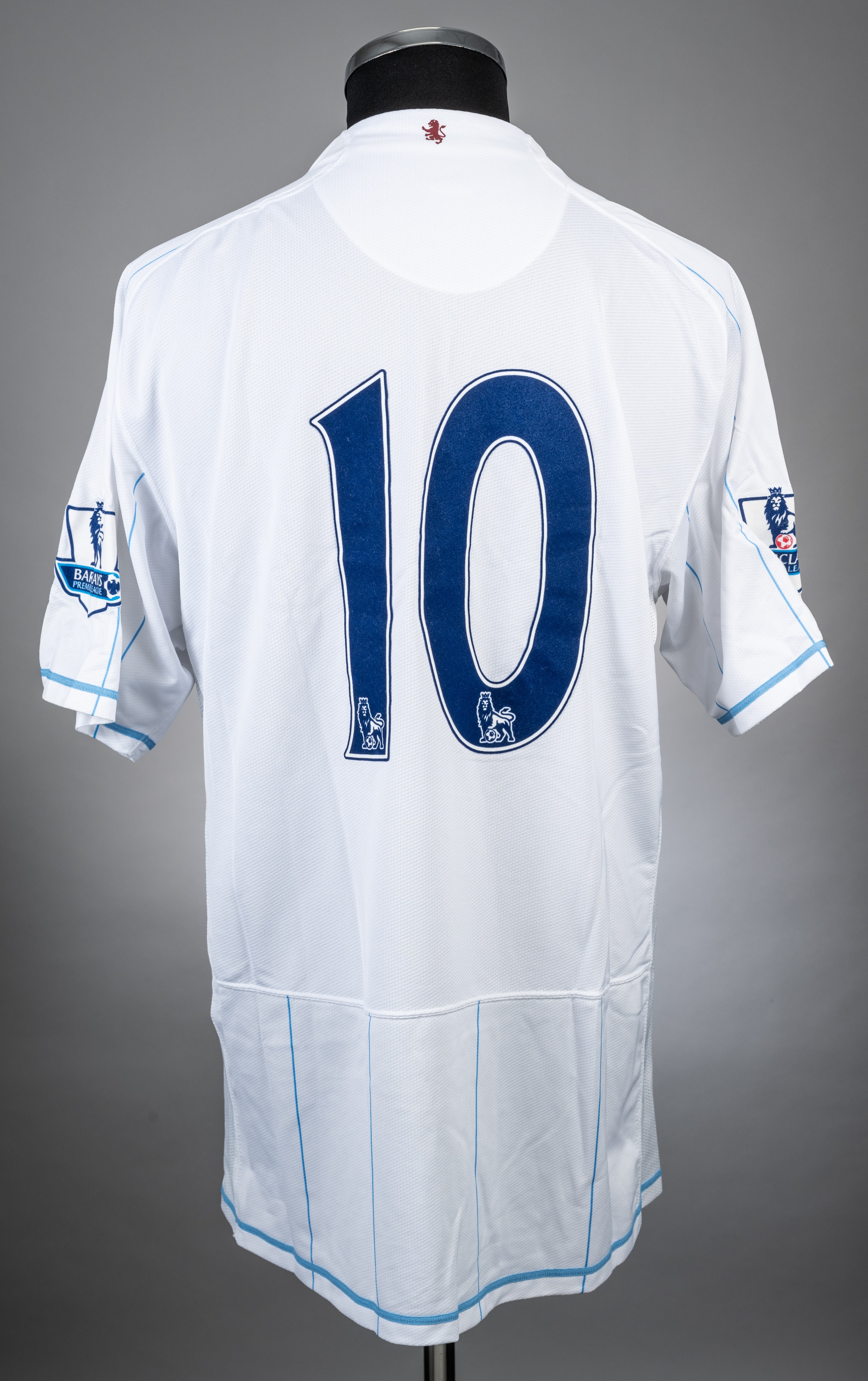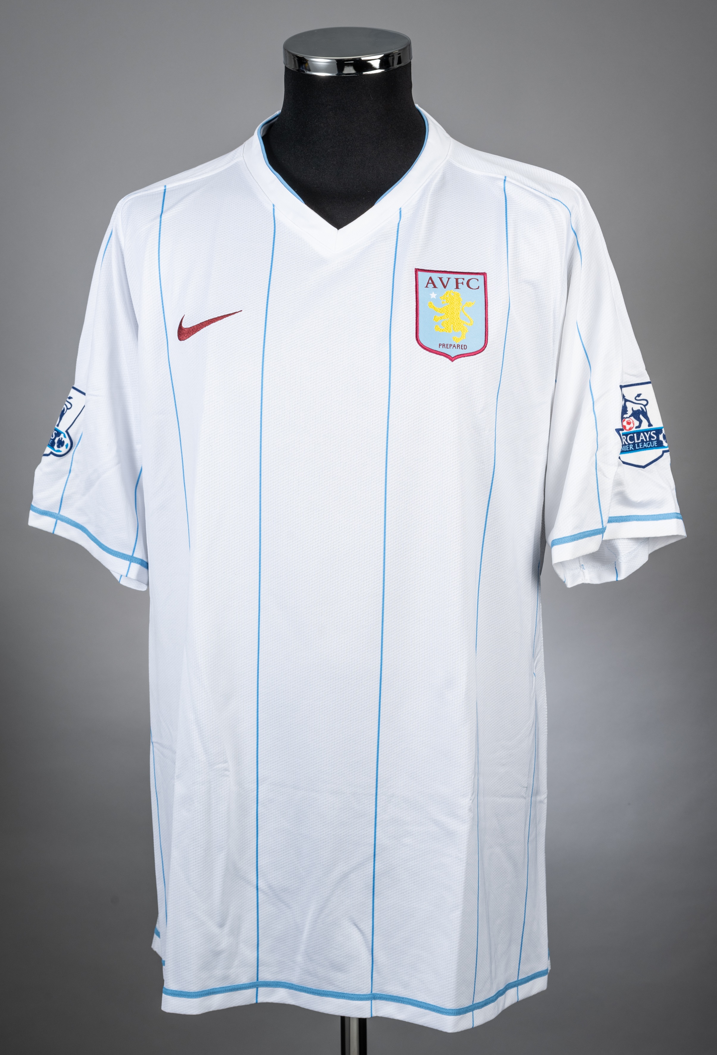 Rare John Carew white No.10 Aston Villa v. West Ham United short-sleeved shirt, 2008-09, Nike, XXL, with v-neck collar and embroidered cloth badge inscribed AVFC, PREPARED, the sleeves with Barclays Premier League flashes The referee decided prior to the match that there would be a colour clash so Villa had to play in these sponsor less and nameless jerseys, this jersey was worn by John Carew in the match against West Ham played on 18th April 2009, ending in a 1-1 draw