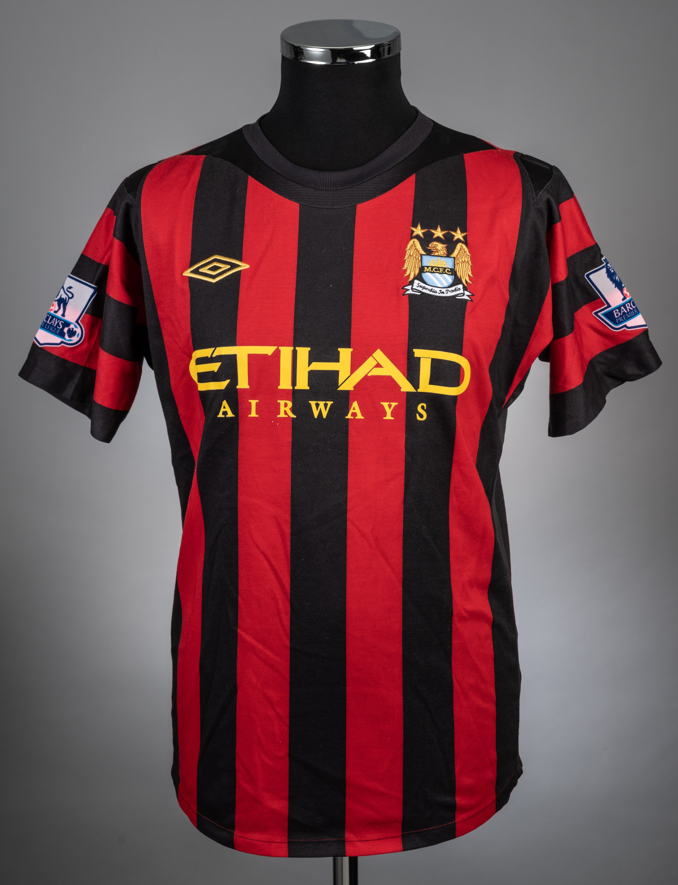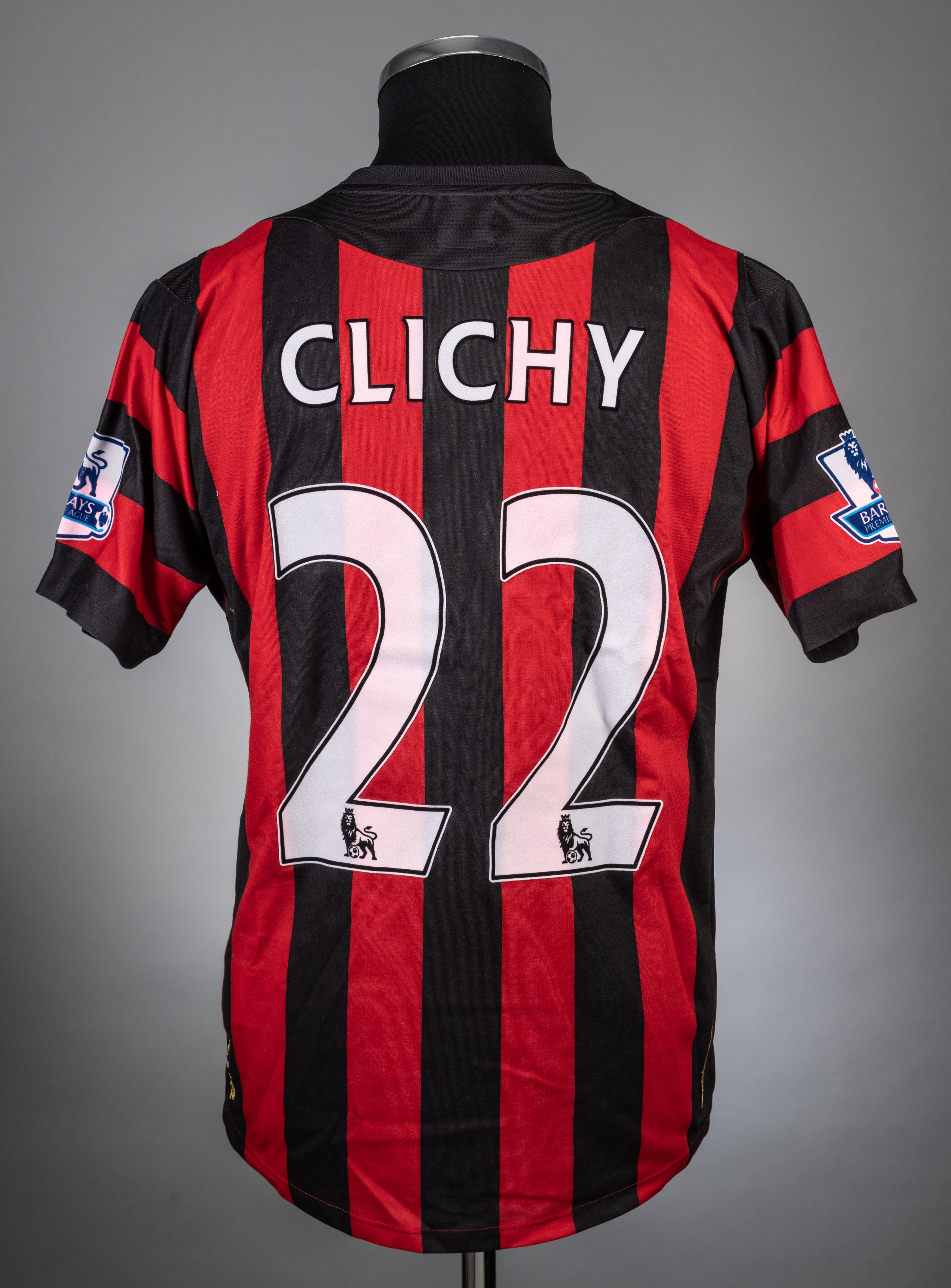 Gael Clichy red and black No.22 Manchester City match worn short-sleeved jersey 2011-12, Umbro, 38, with crew-neck collar and embroidered badge inscribed M.C.F.C., Superbia In Proelia, the reverse lettered CLICHY, the sleeves with Barclays Premier League flashes The jersey was worn by Gael Clichy in the match against Tottenham Hotspur, played on 28th August 2011, match ending in 5-1 victory for Manchester City