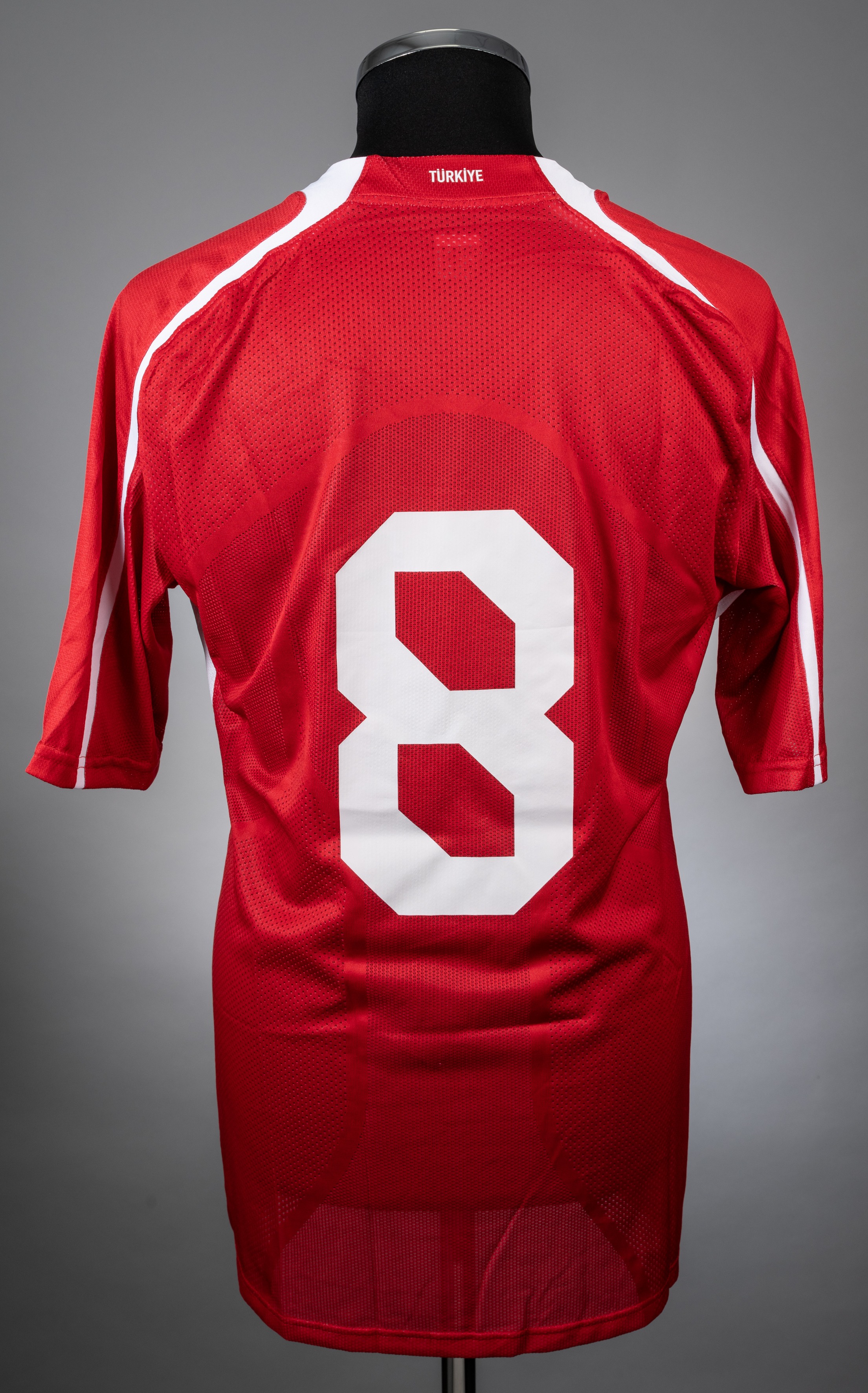 Nihat Kahveci red and white No.8 Turkey v, Bosnia match issues short-sleeved jersey, 2009-10, Nike, L, with v-neck collar, embroidered cloth badge,