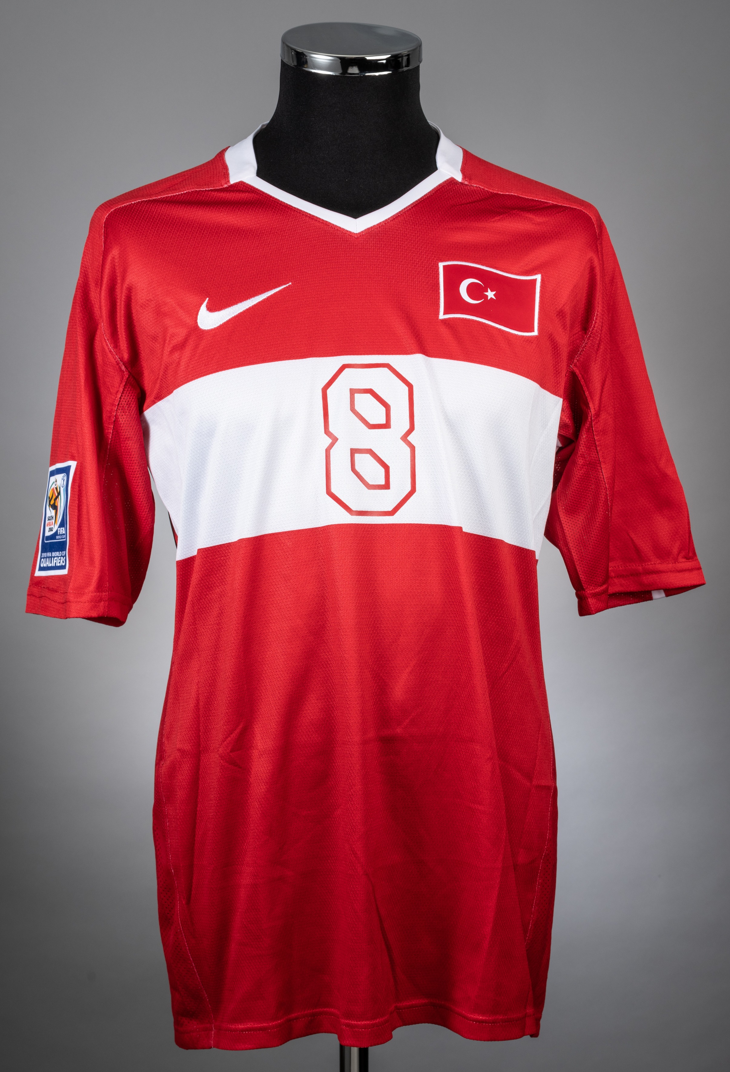 Nihat Kahveci red and white No.8 Turkey v, Bosnia match issues short-sleeved jersey, 2009-10, Nike, L, with v-neck collar, embroidered cloth badge, right sleeve with South Africa 2010 Qualifiers flash The above is a match issued jersey, Kahveci was an unused sub