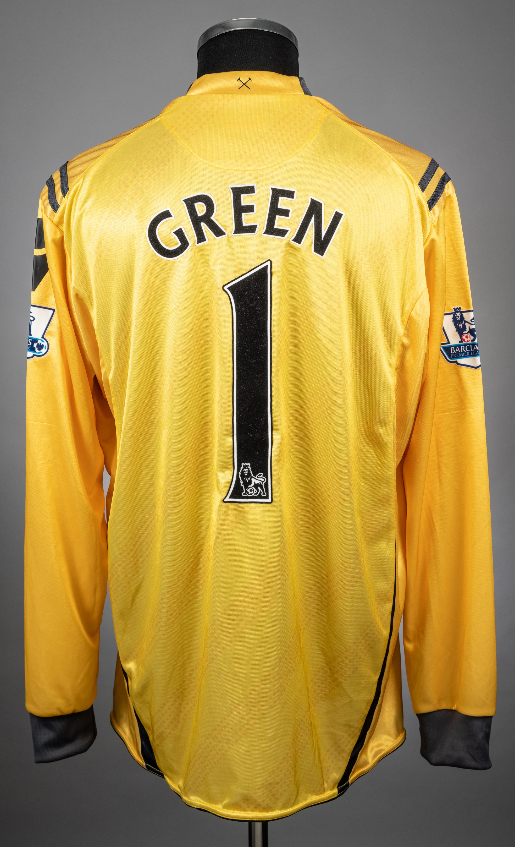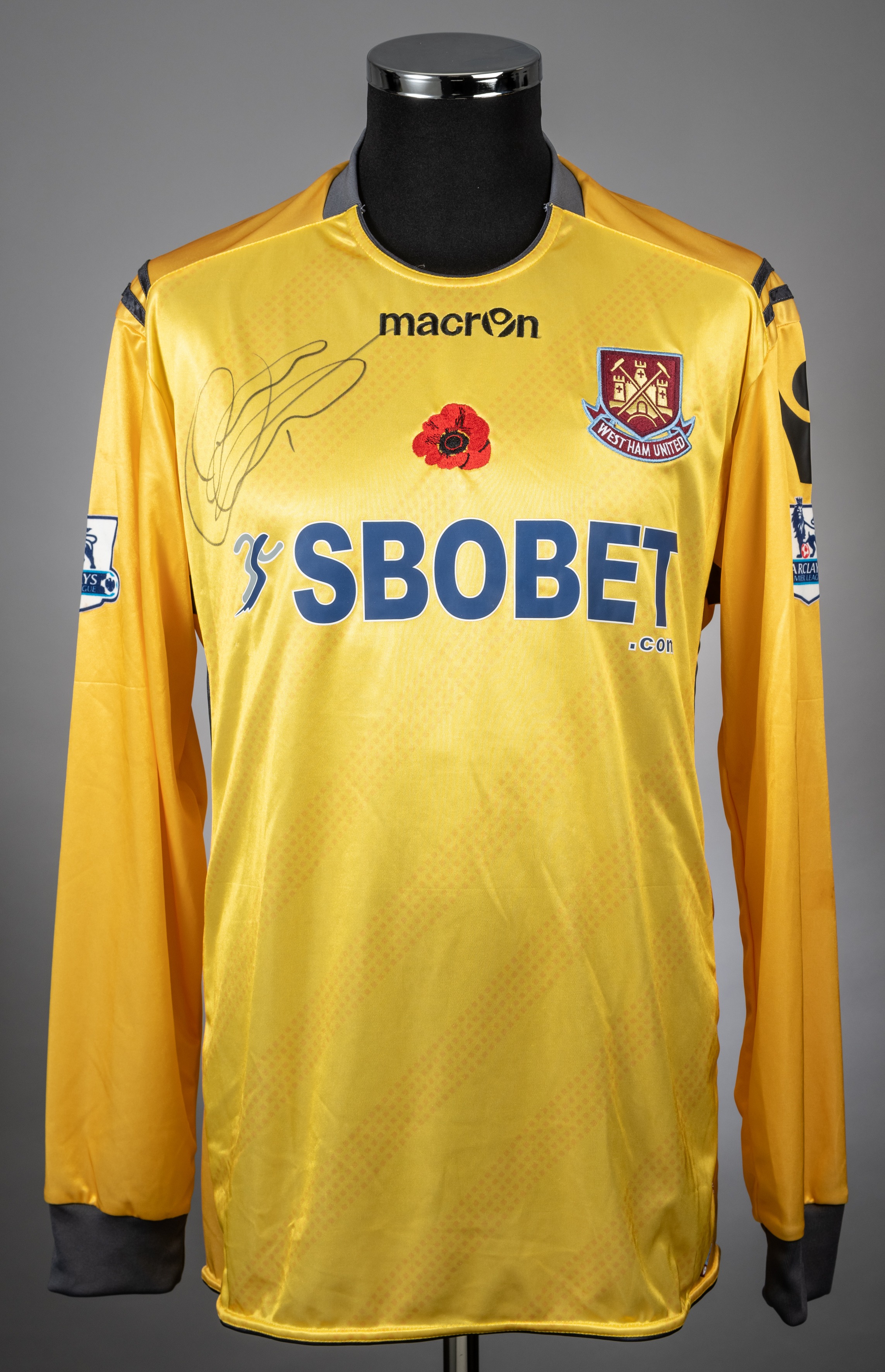 Rob Green yellow No.1 West Ham United v. Blackpool goalkeepers jersey, 2010-11, Macron, XL, with crew-neck collar and embroidered cloth badge inscribed WEST HAM UNITED, the reverse lettered GREEN, the front of the jersey with embroidered Remembrance Poppy and also autographed by Rob Green The above jersey was worn by Rob Green in the match against Blackpool played November 2010
